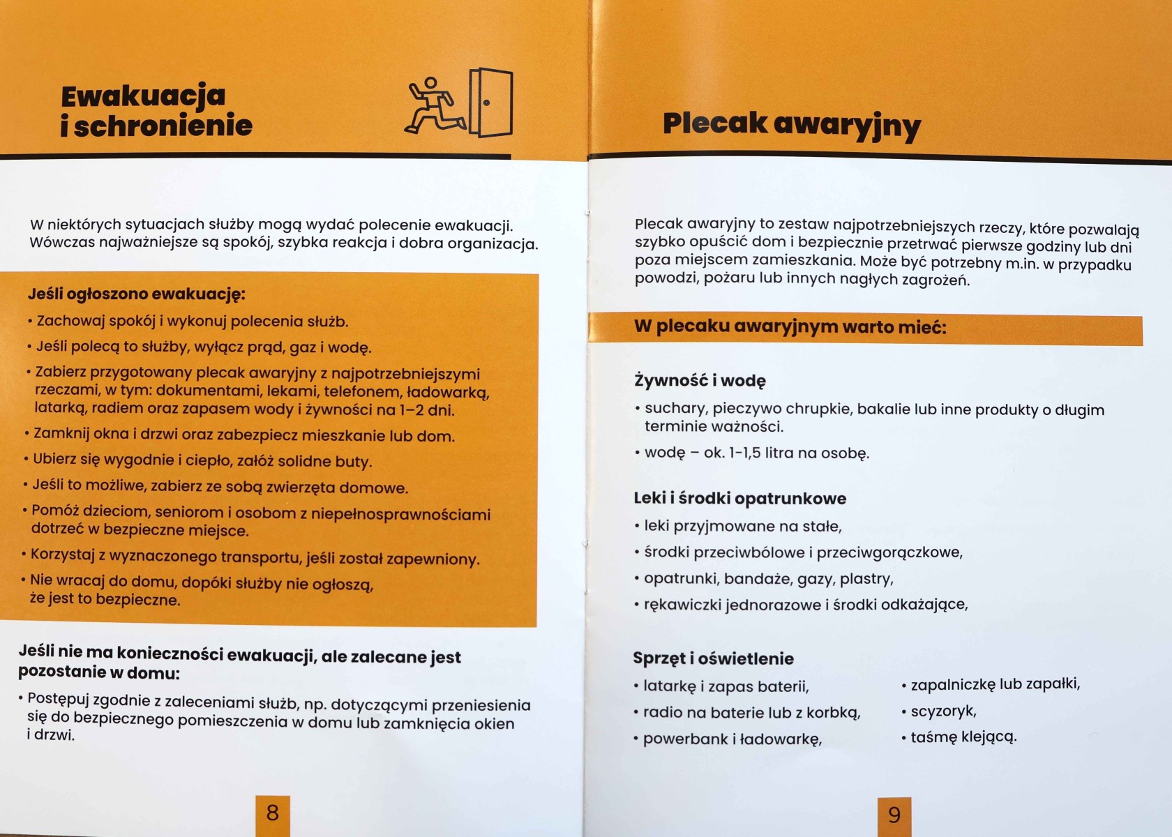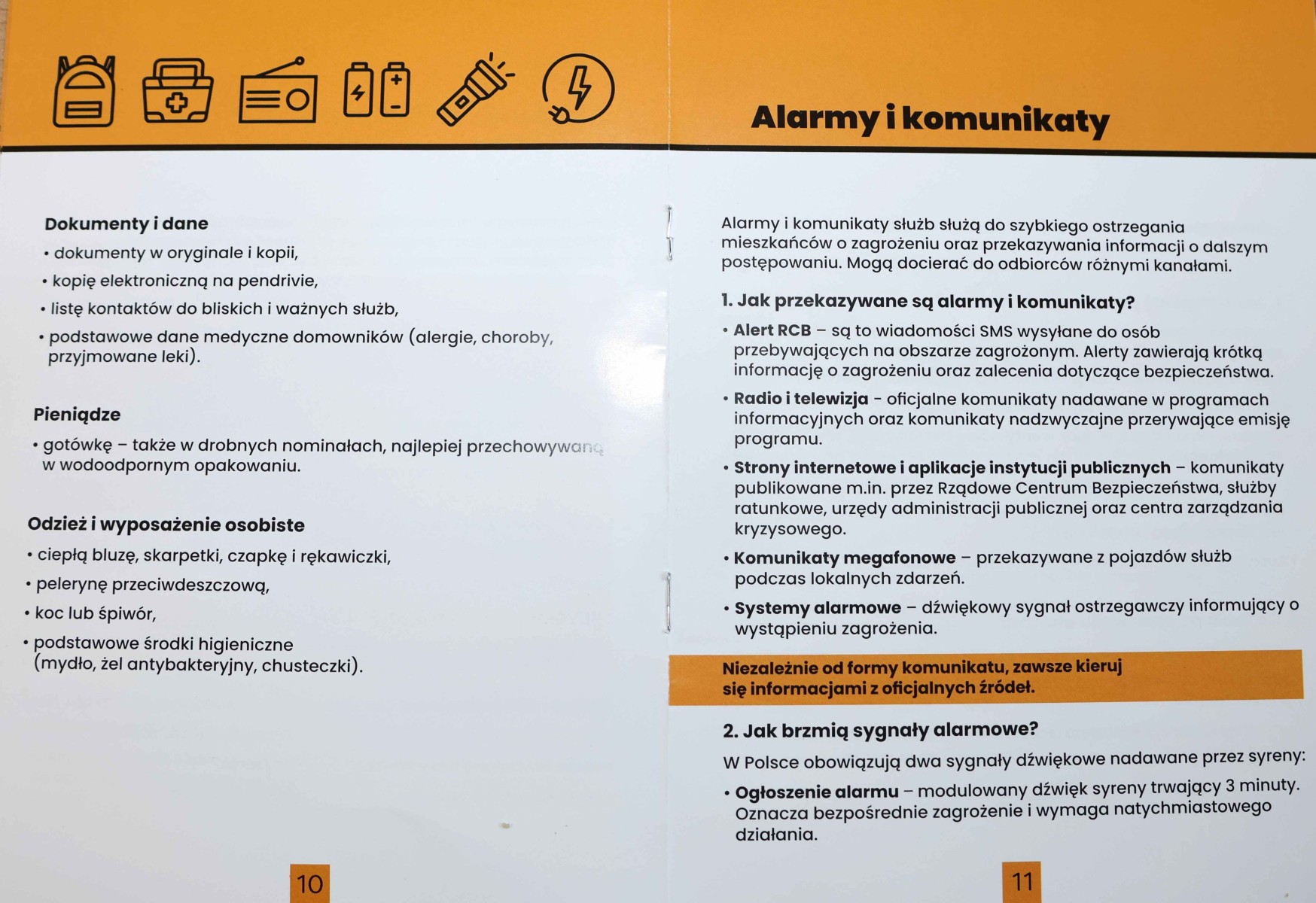 W broszurze znajdziemy informacje o miejscach schronienia i o tym jak reagować na sygnały i komunikaty ostrzegawcze. Jednym z najważniejszych rozdziałów jest poradnik udzielania pierwszej pomocy.