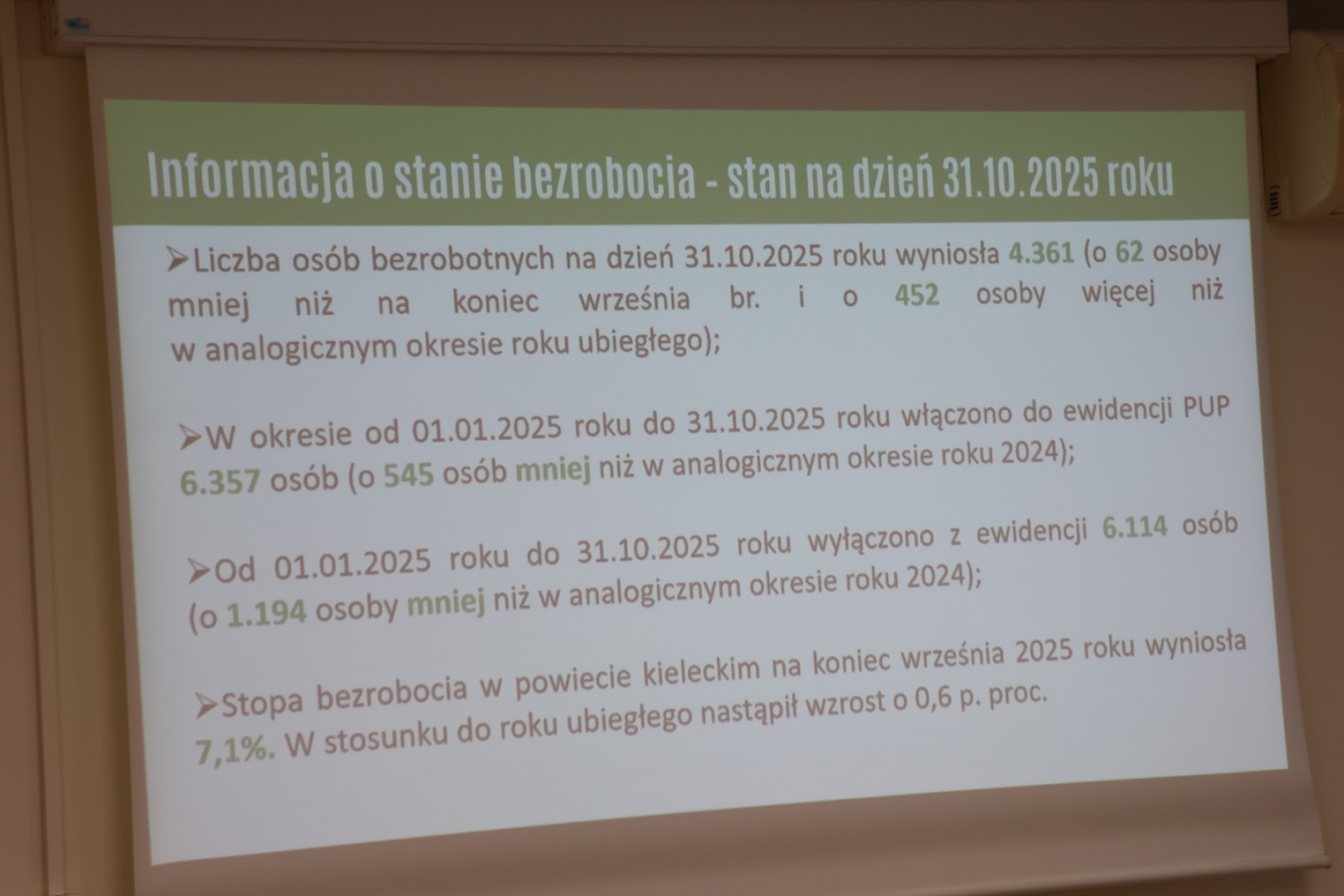 Dyrektor Powiatowego Urzędu Pracy w Kielcach Pan Tomasz Dudzic oraz Zastępca Dyrektora ds. Ewidencji i Administracji Pani Anna Piotrowska przedstawili członkom Rady informacje i dane o sytuacji na rynku pracy w powiecie kieleckim na dzień 31.10.2025 r.