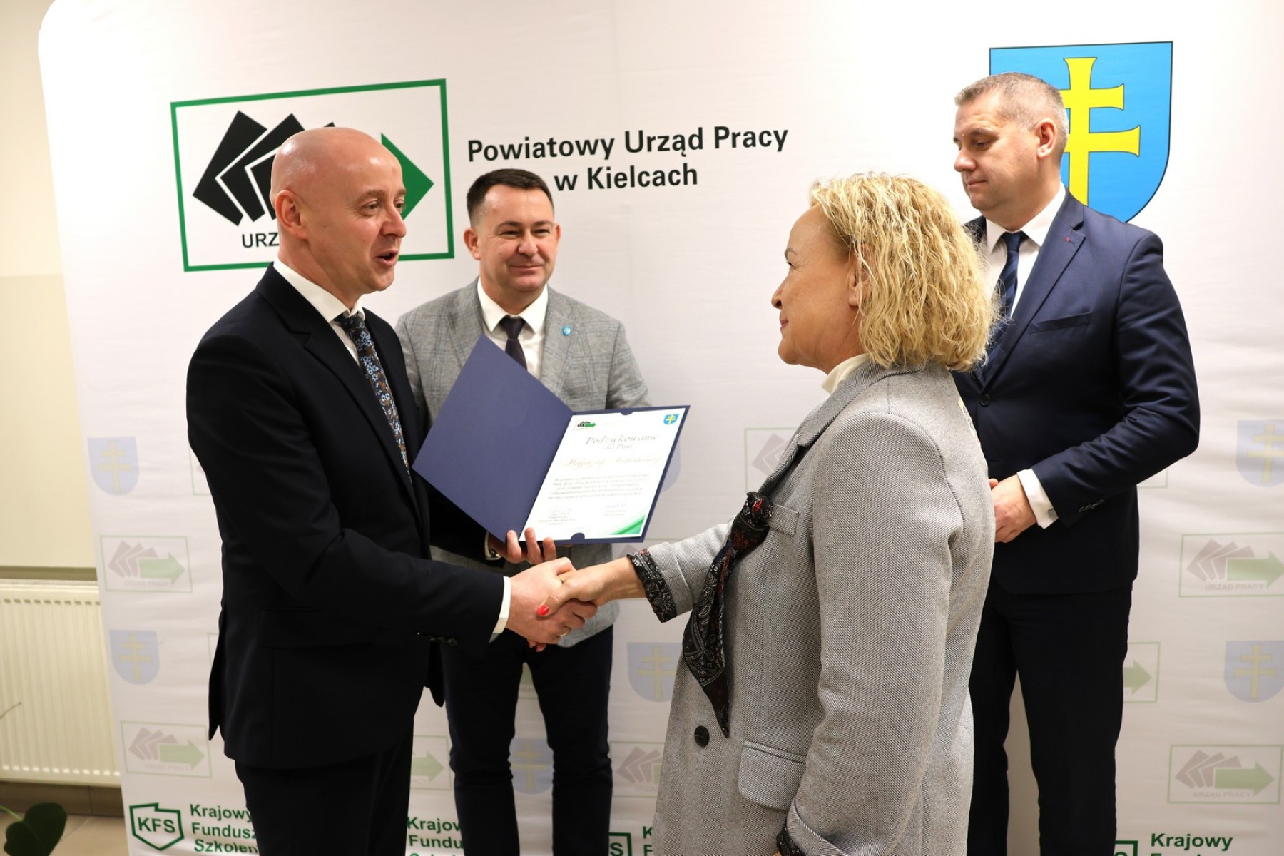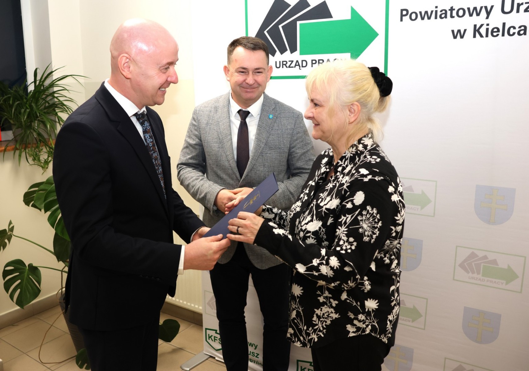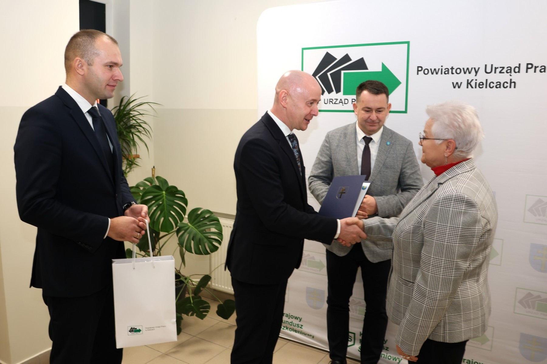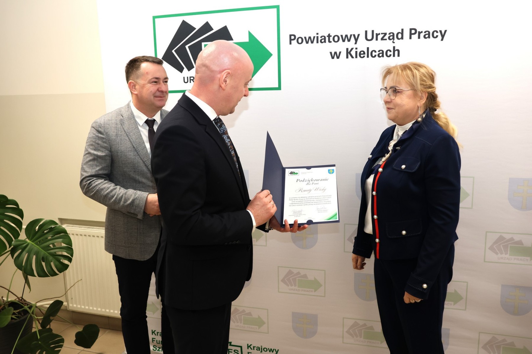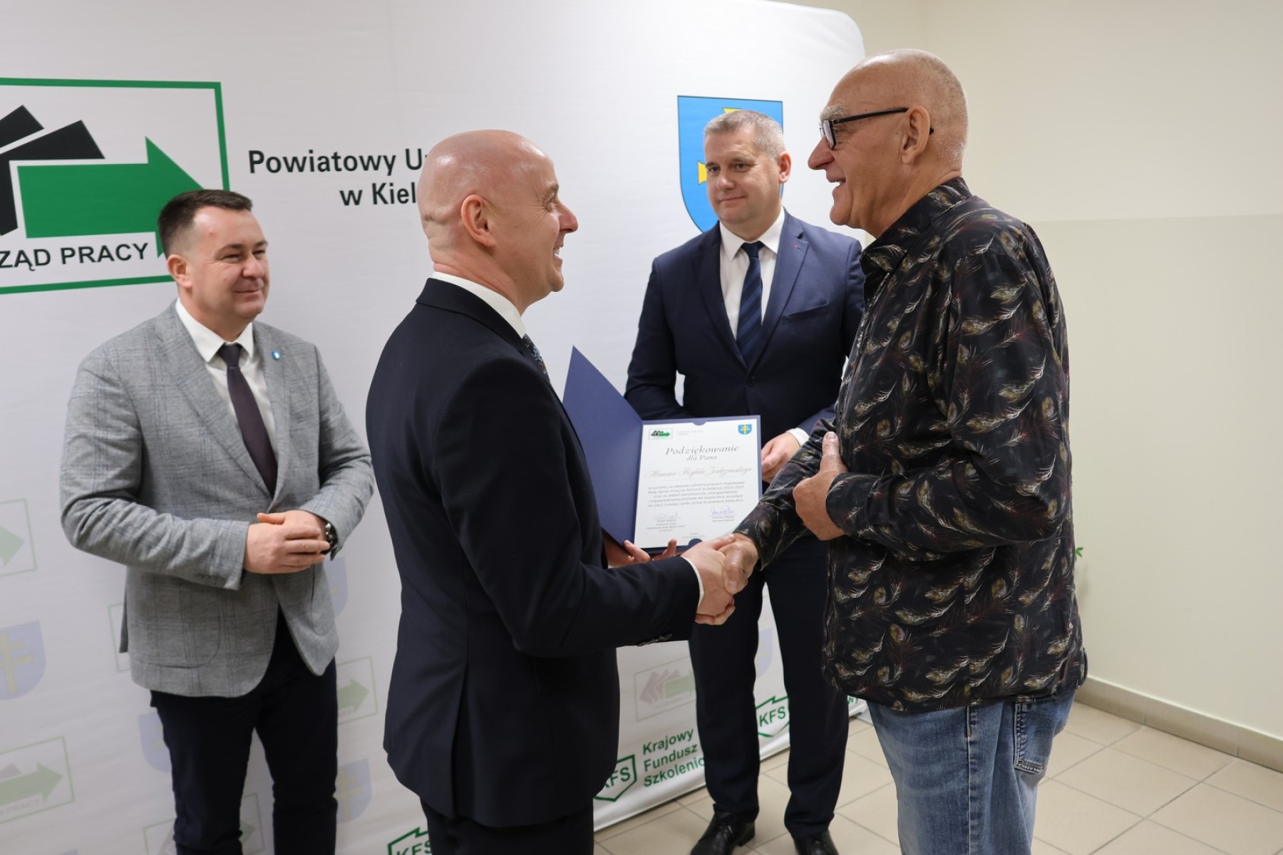 Na zakończenie posiedzenia wicestarosta kielecki Tomasz Dulny i członek Zarządu Powiatu w Kielcach Cezary Majcher wręczyli członkom Powiatowej Rady Rynku Pracy w Kielcach podziękowania, w uznaniu za aktywny udział w pracach organu opiniodawczo – doradczego Starosty w kadencji 2023 – 2025 oraz za wkład merytoryczny, zaangażowanie i odpowiedzialną postawę we wspieraniu inicjatyw na rzecz rozwoju rynku pracy w powiecie kieleckim.
