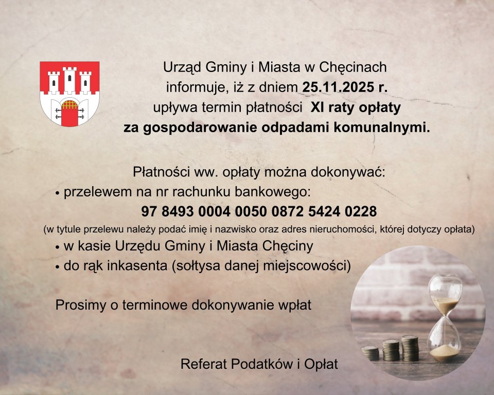 Strona głównaGospodarkaPrzypomnienie o terminie płatności XI raty za odbiór odpadów komunalnych Gospodarka Przypomnienie o terminie płatności XI raty za odbiór odpadów komunalnych CKinfo.pl 20 listopada 2025 FacebookTwitterWhatsAppTelegram Zobacz CKinfo.pl - 19 listopada 2025TERMINARZ POSIEDZEŃ KOMISJI RADY POWIATU W KIELCACH CKinfo.pl - 18 listopada 2025Jacek Cielibała z prestiżowym tytułem „Zasłużony dla Powiatu Kieleckiego” CKinfo.pl - 19 listopada 2025Honorowe tytuły Powiatu Kieleckiego wręczone CKinfo.pl - 20 listopada 2025Sesja Rady Miejskiej w Daleszycach CKinfo.pl - 19 listopada 2025ZAWIADOMIENIE CKinfo.pl - 17 listopada 2025Spotkanie z weterynarzem Agnieszka Olech - 16 listopada 2025Blisko dwustu pierwszoklasistów z gminy Piekoszów rozpoczęło szkolną przygodę [WIDEO] GminaGmina ChęcinyŹRÓDŁOGmina i Miasto Checiny Tagigospodarkakomunalneodpadypłatnościprzypomnienieratyterminusługi Udział FacebookTwitterWhatsAppTelegram Poprzedni artykułZostań Wolontariuszem WOŚP w Gminie i Mieście Chęciny!Następny artykułBezpłatne szkolenia z zakresu edukacji prawnej Aktualności AktualnościCKinfo.pl - 20 listopada 2025Zatrzymanie mieszkańca Kielc ze znaczną ilością środków odurzającychWe wtorkowe popołudnie funkcjonariusze z Wydziału do walki z Przestępczością Narkotykową kieleckiej komendy miejskiej zatrzymali 44-letniego mieszkańca miasta.... Oświata Policjantki odwiedziły przedszkole w Tarłowie. Rozmawiały z dziećmi o ich prawach, a potem wspólnie przemaszerowali ulicami miejscowości CKinfo.pl - 20 listopada 2025 Kultura Burmistrz Gminy i Miasta Chęciny Robert Jaworski serdecznie zaprasza do udziału w konferencji naukowej ˝Chęciny: 700 lat w sercu historii˝ CKinfo.pl - 20 listopada 2025 Oświata Gmina Chęciny przeznaczyła 17 tysięcy złotych na bezpłatne szczepienia przeciwko grypie i badania prostaty CKinfo.pl - 20 listopada 2025 Oświata Bezpłatne szkolenia z zakresu edukacji prawnej CKinfo.pl - 20 listopada 2025 Polecamy Trwają prace przy remoncie drogi Ostrów–Wymysłów Gospodarka CKinfo.pl - 20 listopada 2025 Nowy dom w Łagowie dla dzieci – szukamy rodziny, która go poprowadzi! Gospodarka CKinfo.pl - 20 listopada 2025 Ponad 95 mln zł na zdrowie pracujących mieszkańców Świętokrzyskiego Gospodarka CKinfo.pl - 20 listopada 2025 GDDKiA zakończyła budowę zatok autobusowych przy drodze krajowej nr 73 w Lisowie Gospodarka CKinfo.pl - 19 listopada 2025