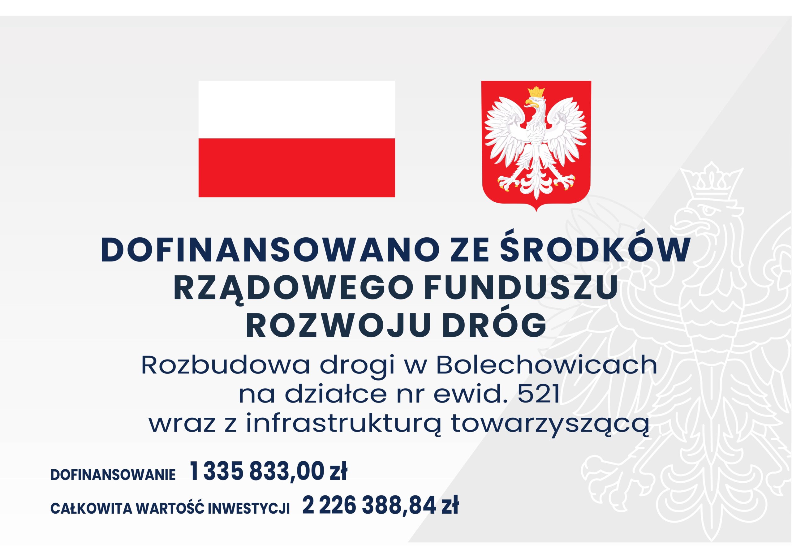 Gmina Nowiny zrealizowała zadanie pn. „Rozbudowa drogi w Bolechowicach na działce nr ewid. 521 wraz z infrastrukturą towarzyszącą”. Gmina pozyskała na ten cel dofinansowanie w kwocie 1 335 833,00 z Rządowego Funduszu Rozwoju Dróg.