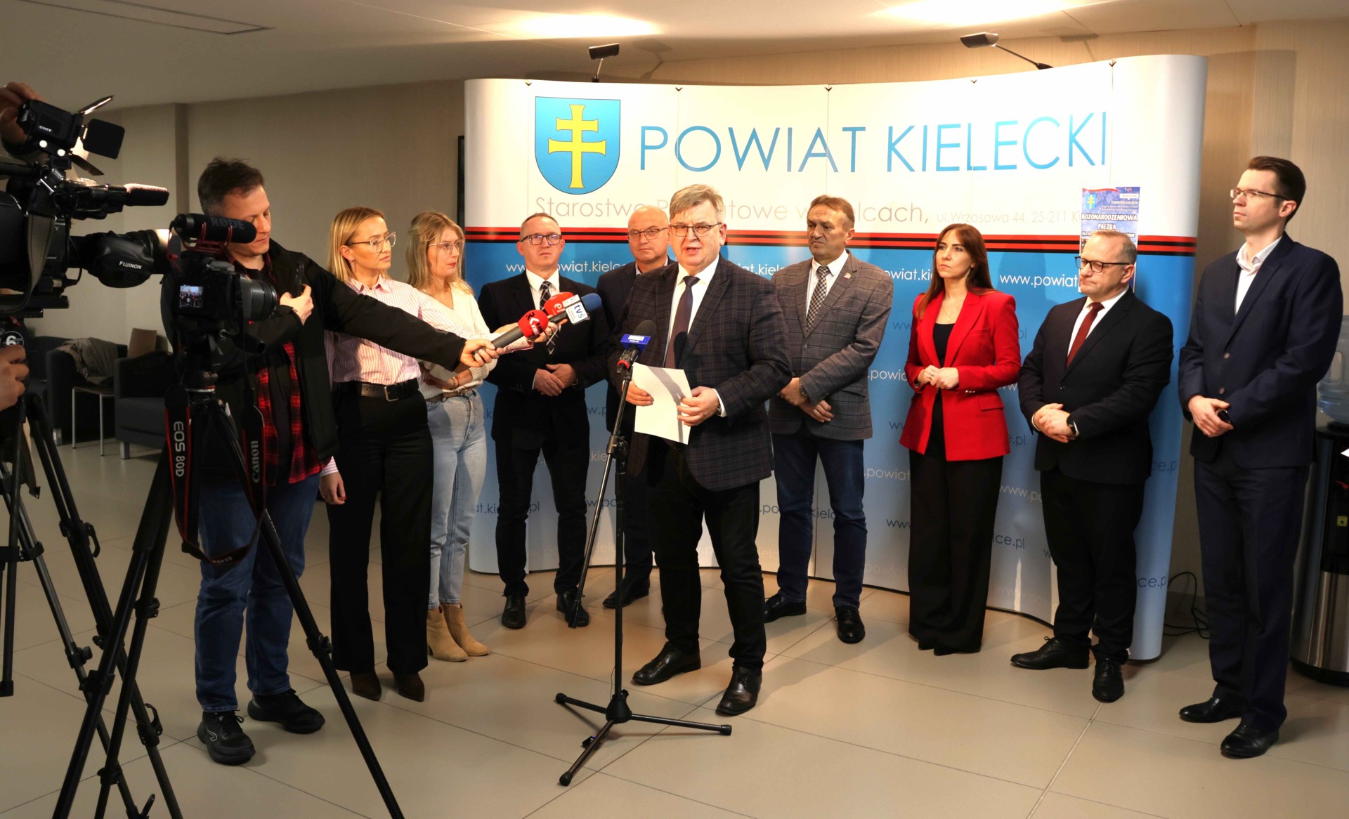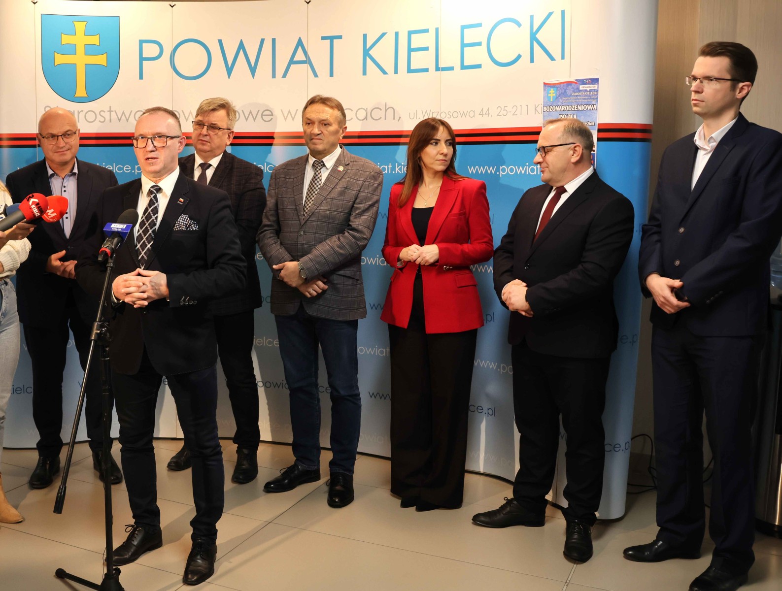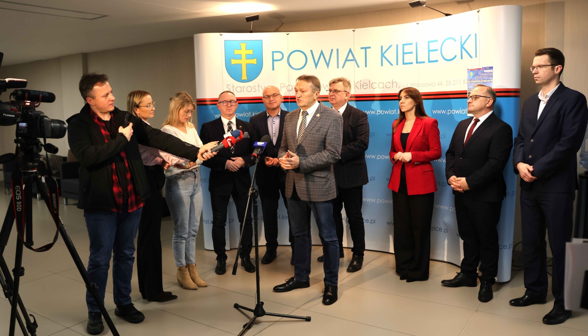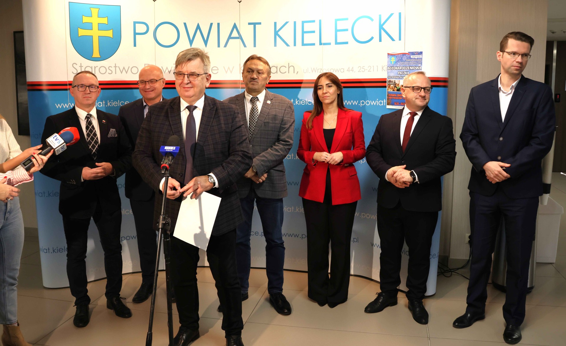 W konferencji prasowej uczestniczyli: Starosta Kielecki Tomasz Pleban, Członek Zarządu Powiatu Mirosław Gębski, Starosta Opatowski Tomasz Staniek, członek Zarządu Powiatu Koneckiego Dariusz Banasik, członek Zarządu Powiatu Włoszczowskiego Jarosław Krzyżanowski, Justyna Łączek z PCKR Włoszczowa i Marcin Dziopa ze Starostwa Powiatowego w Jędrzejowie.