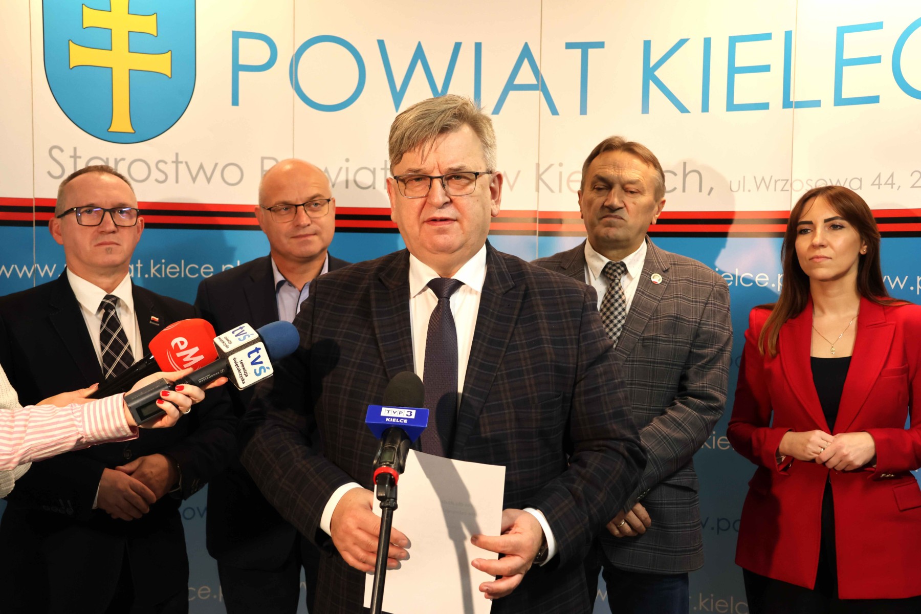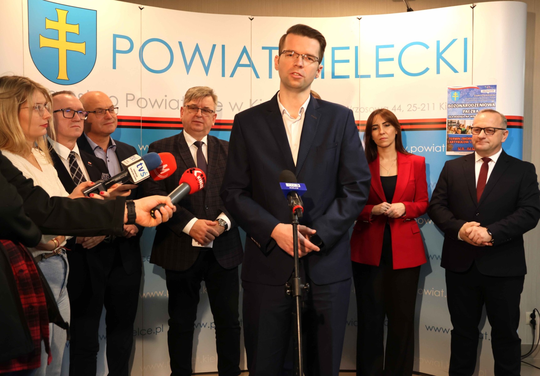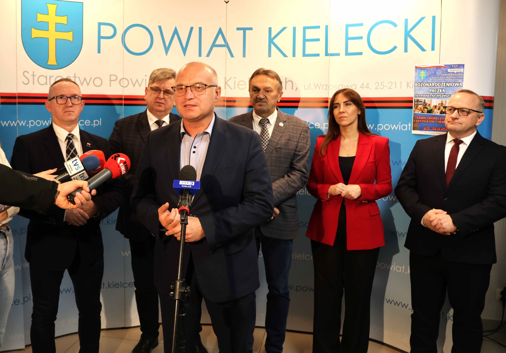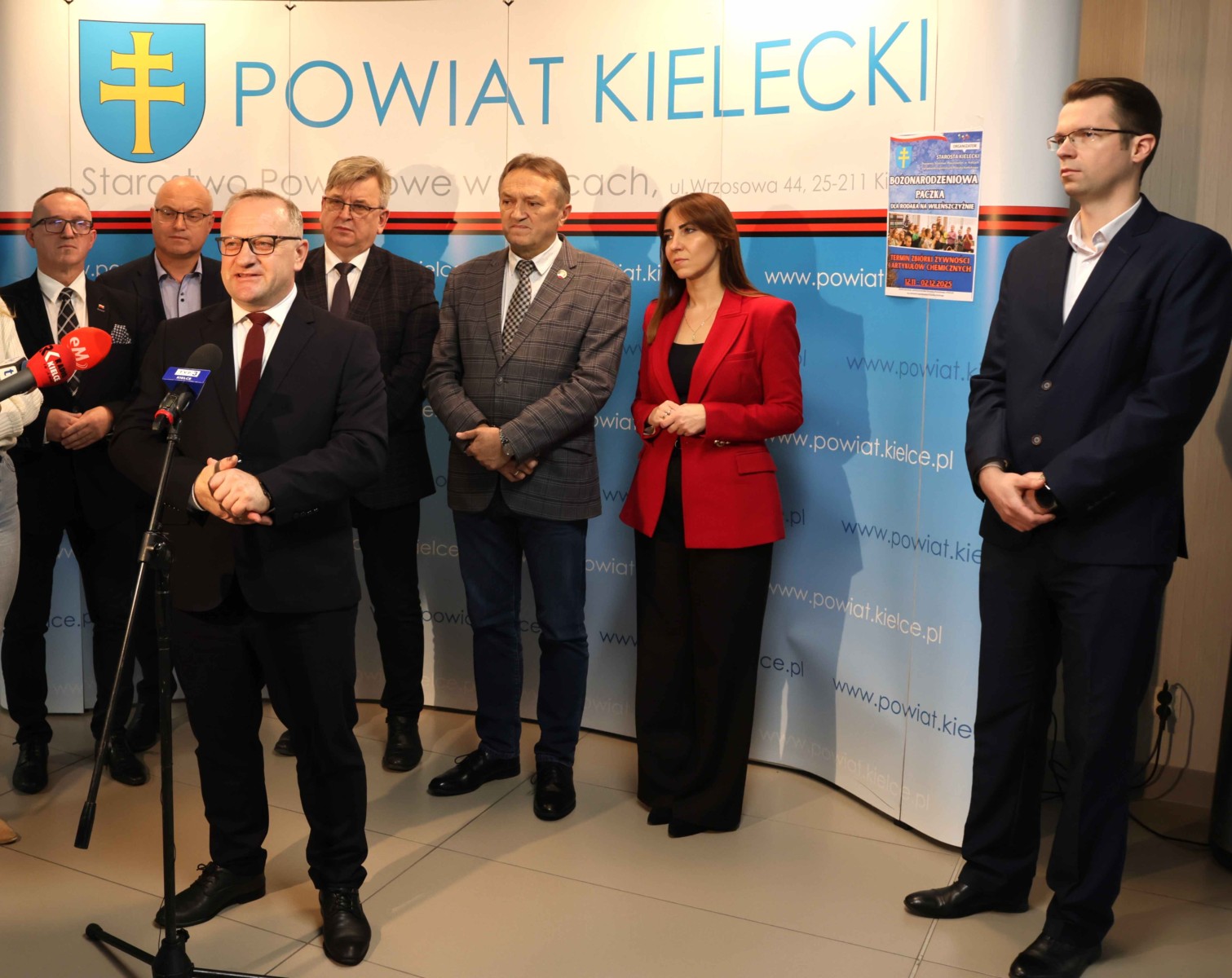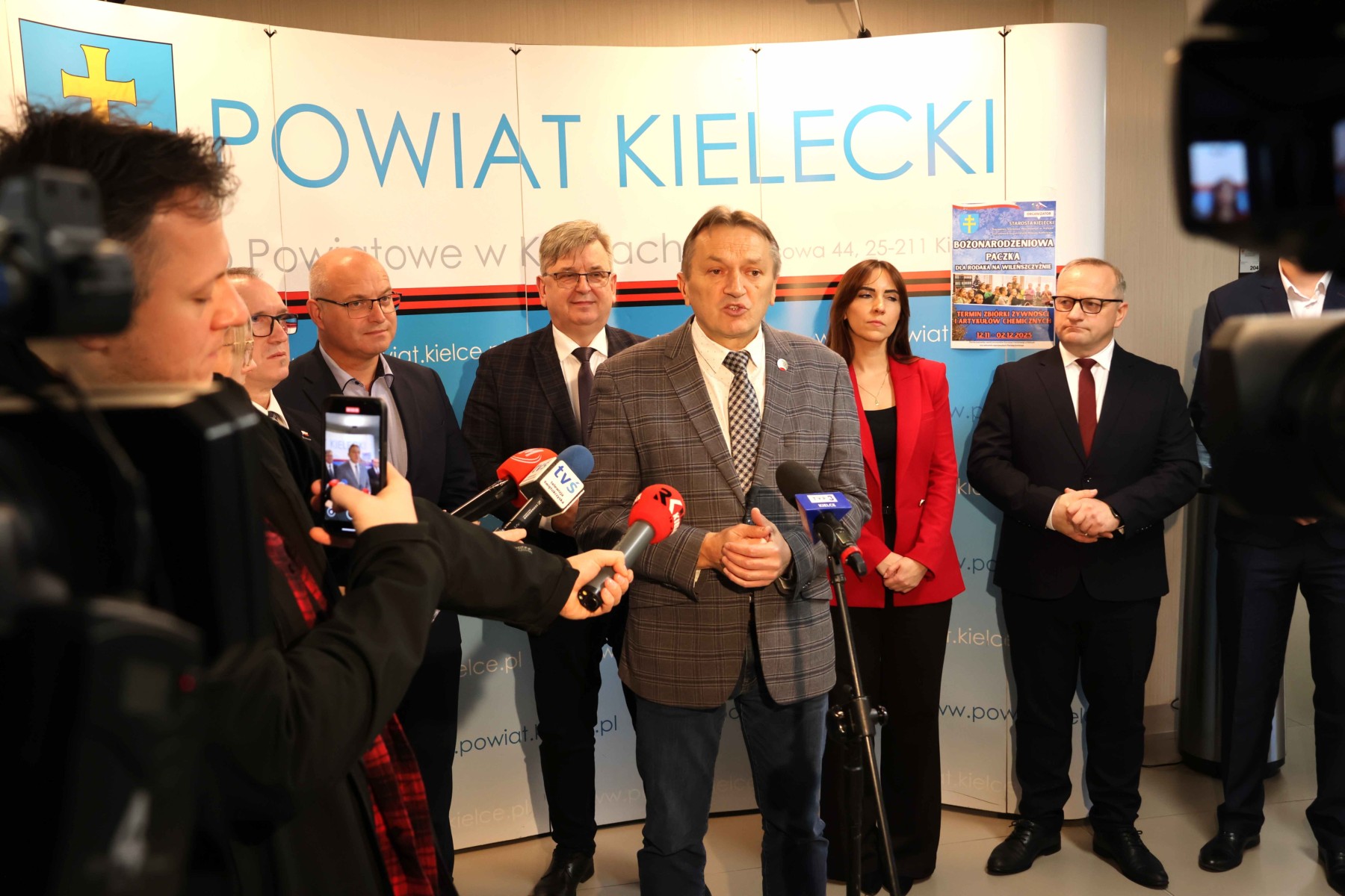 W konferencji prasowej uczestniczyli: Starosta Kielecki Tomasz Pleban, Członek Zarządu Powiatu Mirosław Gębski, Starosta Opatowski Tomasz Staniek, członek Zarządu Powiatu Koneckiego Dariusz Banasik, członek Zarządu Powiatu Włoszczowskiego Jarosław Krzyżanowski, Justyna Łączek z PCKR Włoszczowa i Marcin Dziopa ze Starostwa Powiatowego w Jędrzejowie.
