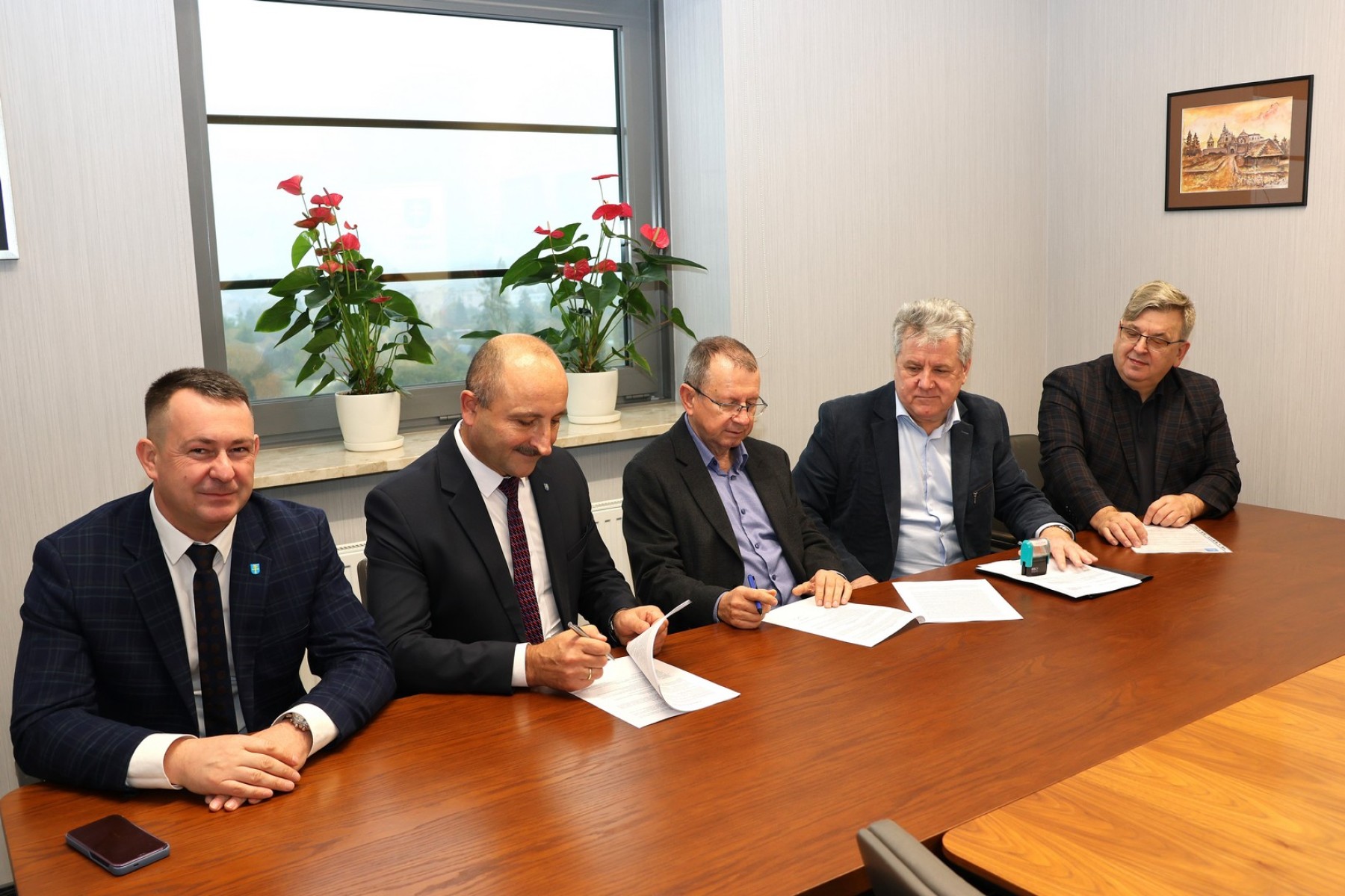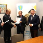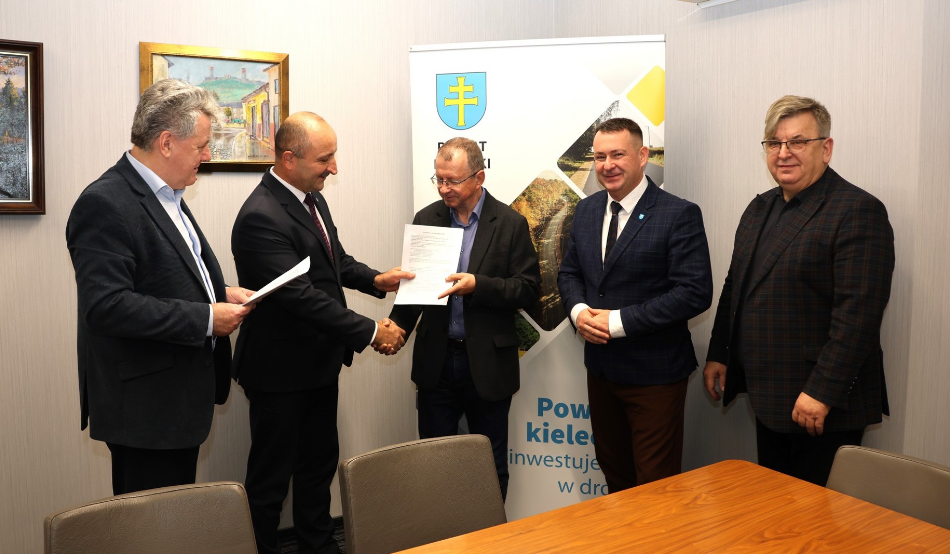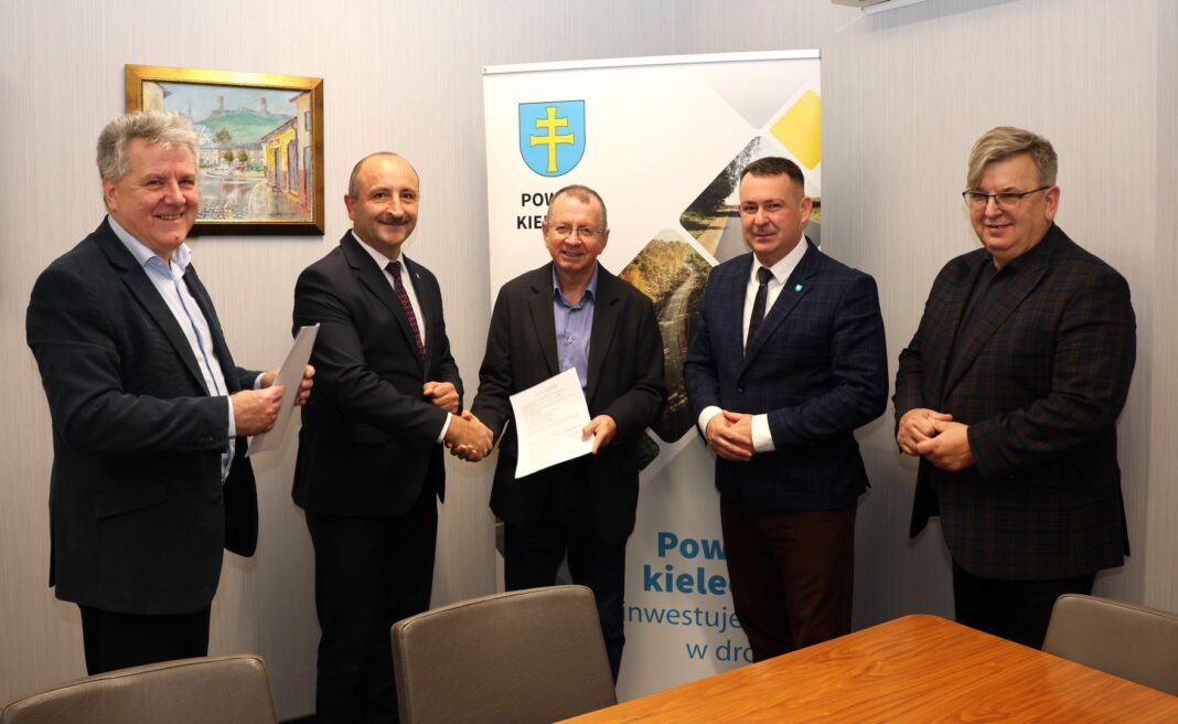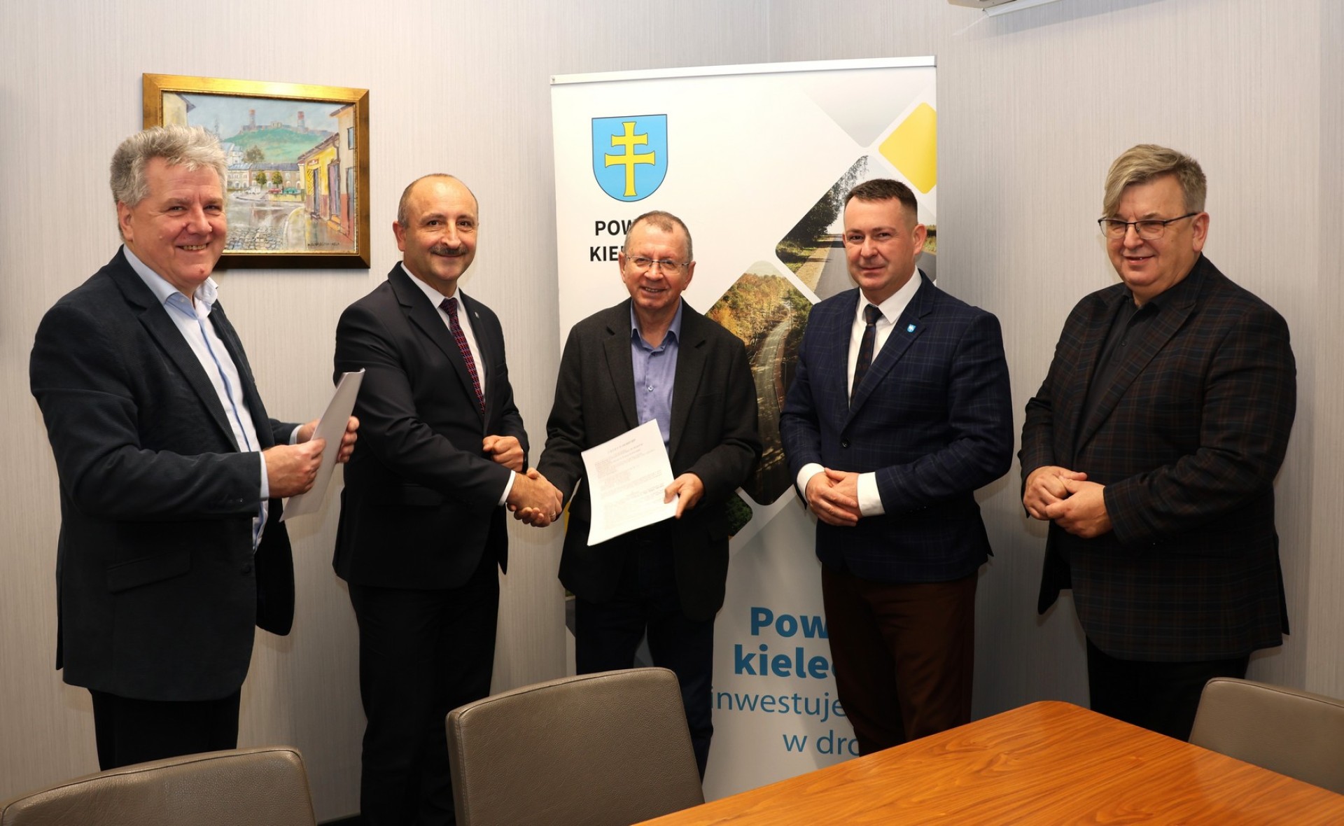 Umowę na realizację tej inwestycji podpisano właśnie w Starostwie Powiatowym w Kielcach. Obecni byli: starosta kielecki Tomasz Pleban, członkowie Zarządu Powiatu – Mariusz Ściana i Cezary Majcher, dyrektor Powiatowego Zarządu Dróg w Kielcach Zbigniew Wróbel oraz przedstawiciel wykonawcy, wiceprezes spółki „Fart” Wiesław Ruchomski.