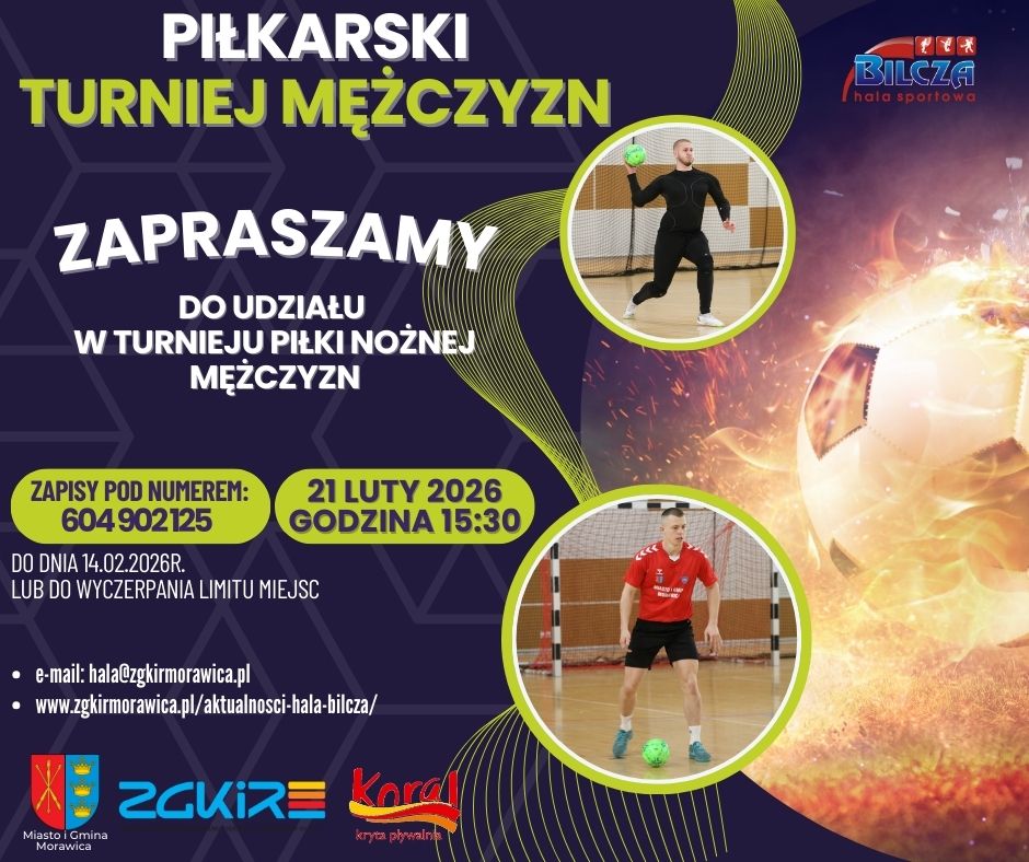 21 lutego 2026r. (sobota) o godzinie 15:30 rozpocznie się kolejna edycja Piłkarskiego Turnieju Mężczyzn o Puchar Burmistrza Miasta i Gminy Morawica. Wszystkie drużyny chętne wziąć udział w turnieju mają czas do 14 lutego 2026r. aby zgłosić swój zespół w rozgrywkach.
