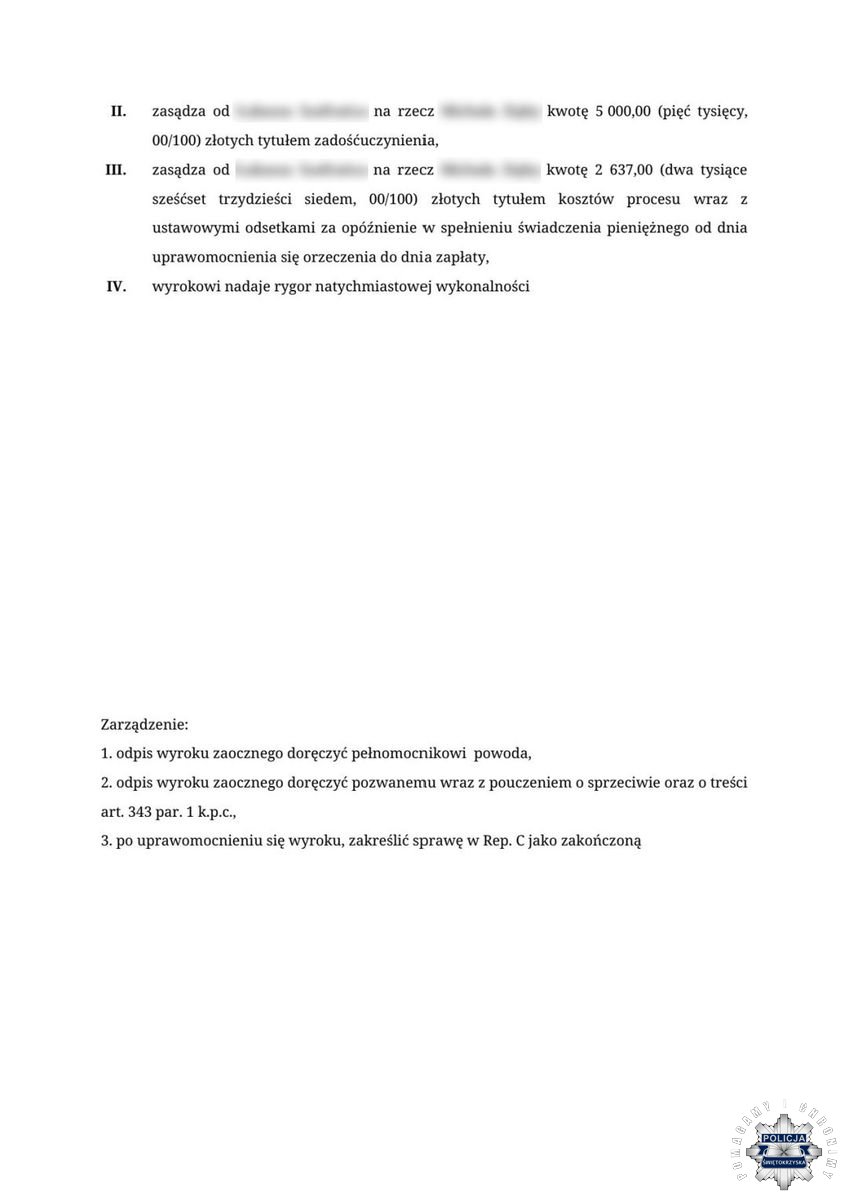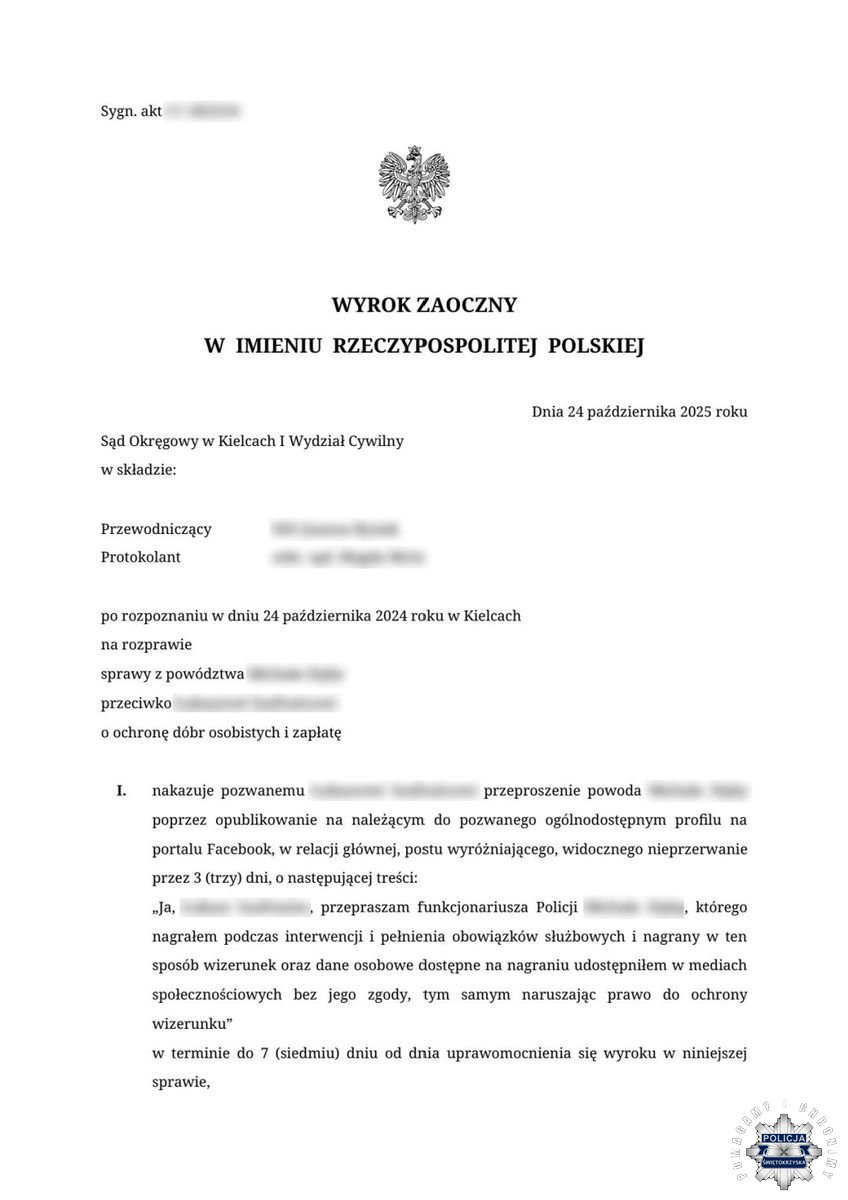 Funkcjonariusz skierował w tej sprawie pozew cywilny do sądu i zapadł już prawomocny wyrok. Decyzją Sądu Okręgowego w Kielcach z dnia 24 października 2025 roku, 42-latek otrzymał nakaz przeproszenia policjanta poprzez opublikowanie na należącym do niego profilu portalu społecznościowego, w relacji głównej, postu wyróżniającego, widocznego nieprzerwanie przez trzy dni. Mężczyzna musi także zapłacić stróżowi prawa 5000 złotych tytułem zadośćuczynienia oraz zwrócić mu koszty procesu.