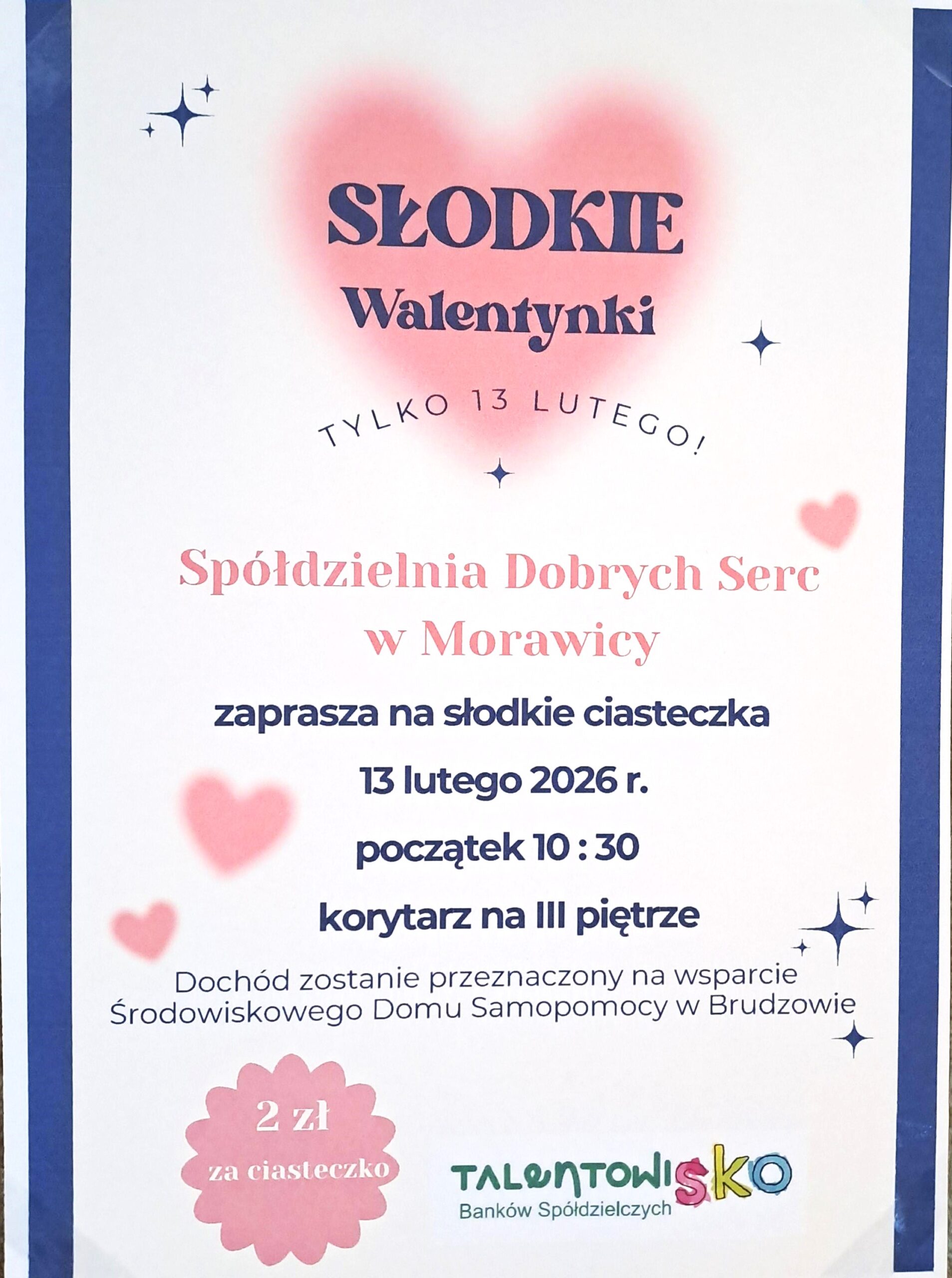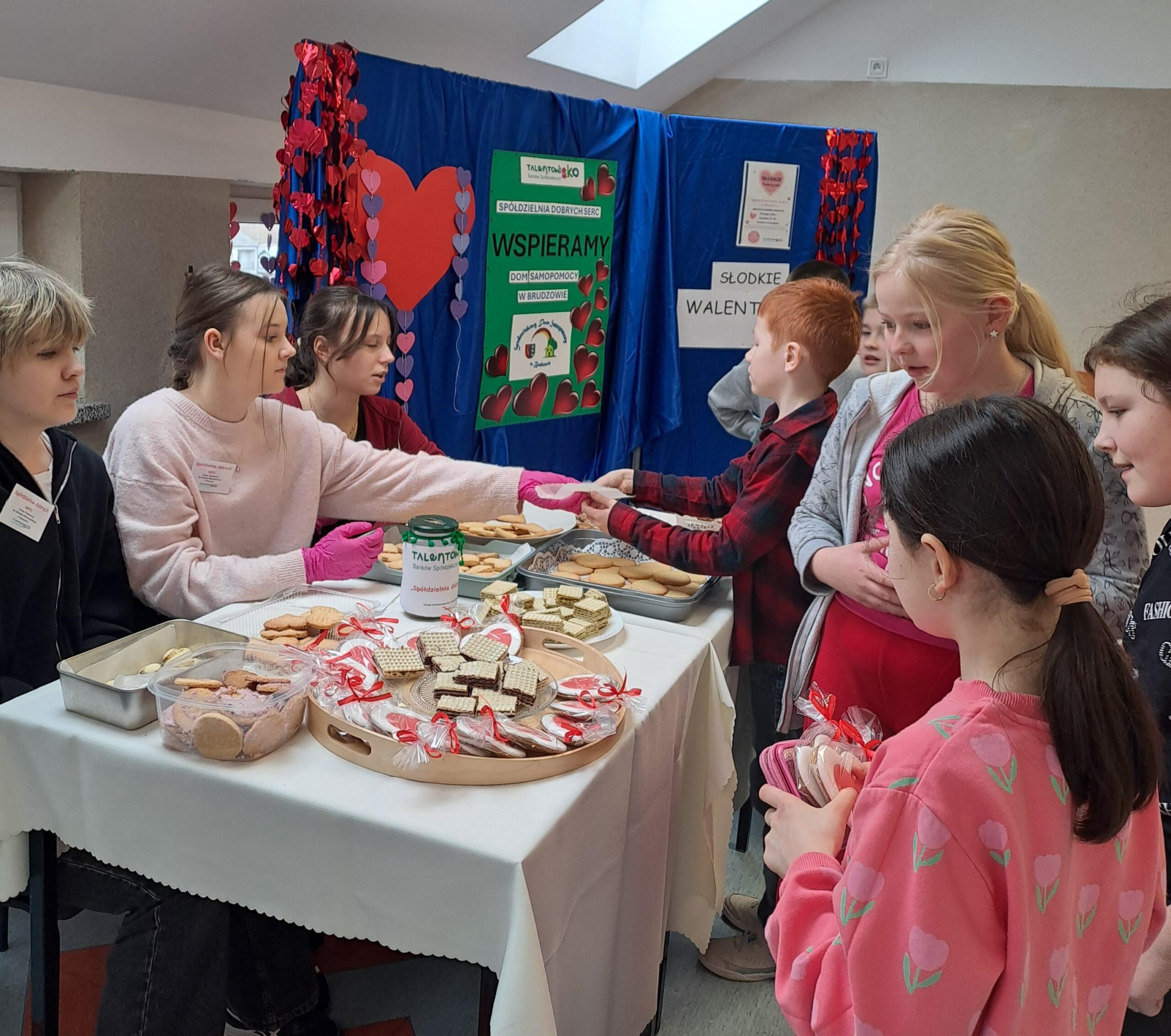 To były naprawdę „Słodkie Walentynki”! W ramach programu edukacyjnego „TalentowiSKO” organizowanego przez Banki Spółdzielcze bierzemy udział w wyjątkowym konkursie „Spółdzielnia Dobrych Serc”, który łączy edukację finansową z działaniami na rzecz lokalnej społeczności. W piątek 13 lutego 2026 roku uczniowie działający w „Spółdzielni Dobrych Serc” zorganizowali walentynkowy kiermasz słodkości. To był wspaniały pomysł! Każde przygotowane z olbrzymią starannością i wielkim sercem przez uczniów klas ósmych, a zakupione przez społeczność szkolną ciasteczkowe serduszko, kajmak, pączek, brownie czy muffinka to cegiełka na wsparcie Środowiskowego Domu Samopomocy w Brudzowie. Dzięki Naszemu wspólnemu zaangażowaniu udało się zebrać olbrzymią kwotę – aż 603zł!