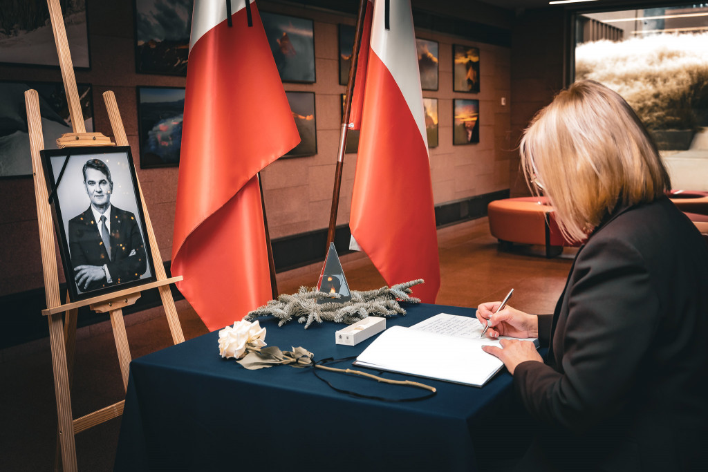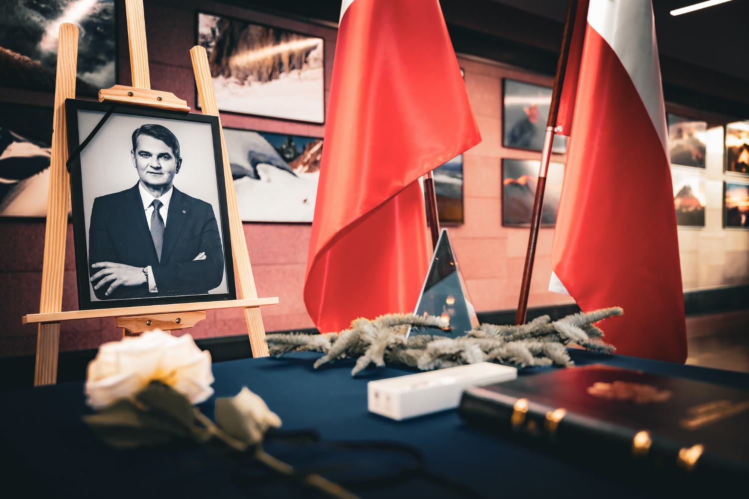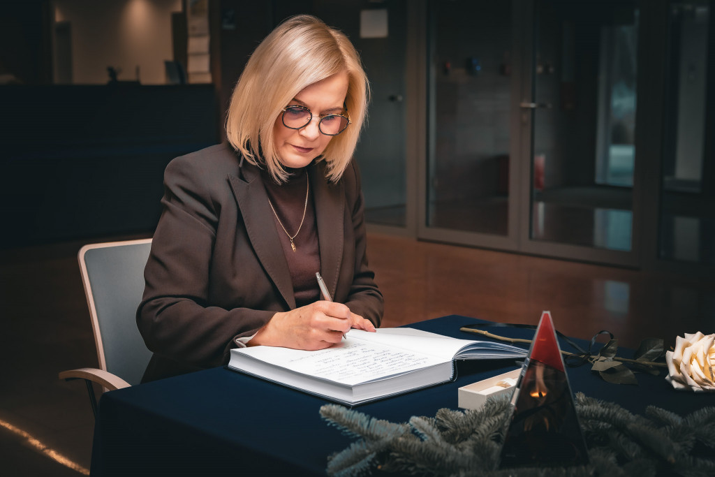 W holu na parterze Głównego Urzędu Miar wystawiono księgę kondolencyjną poświęconą pamięci profesora Jacka Semaniaka. To właśnie tam marszałek Renata Janik złożyła symboliczny hołd zmarłemu, wpisując słowa pożegnania i otuchy dla bliskich.
