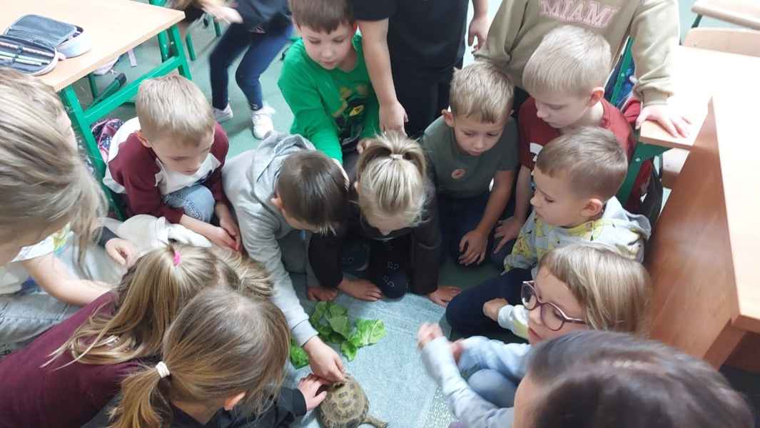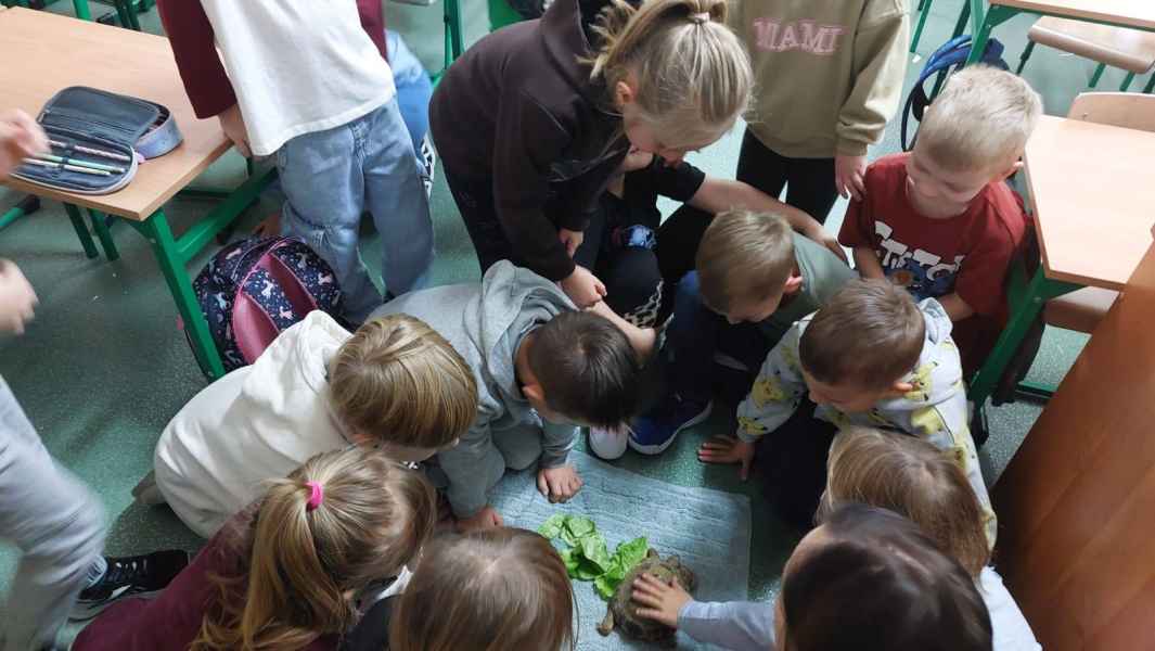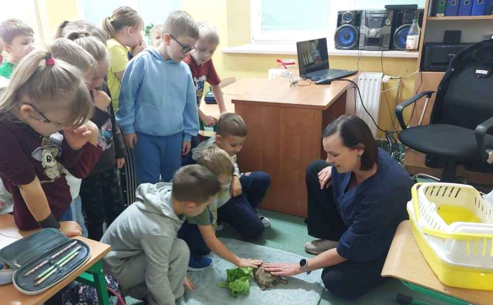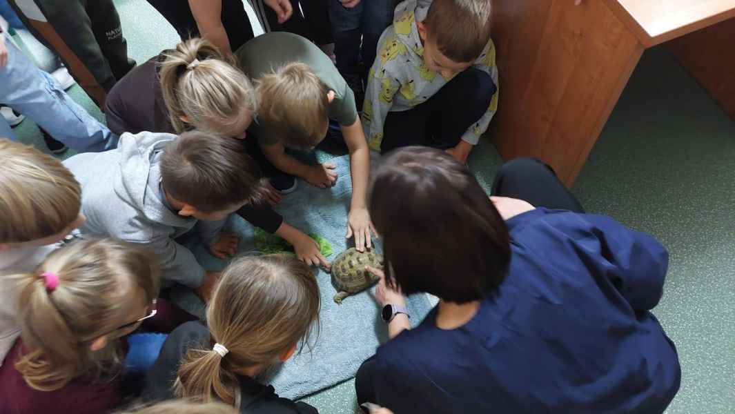 Największą atrakcją spotkania był żywy żółw, którego pani weterynarz przyniosła ze sobą. Dzieci mogły przyjrzeć mu się z bliska, poznać ciekawostki na temat jego życia, diety i pielęgnacji. Żółw wzbudził ogromne zainteresowanie i dostarczył uczniom wielu pozytywnych emocji.