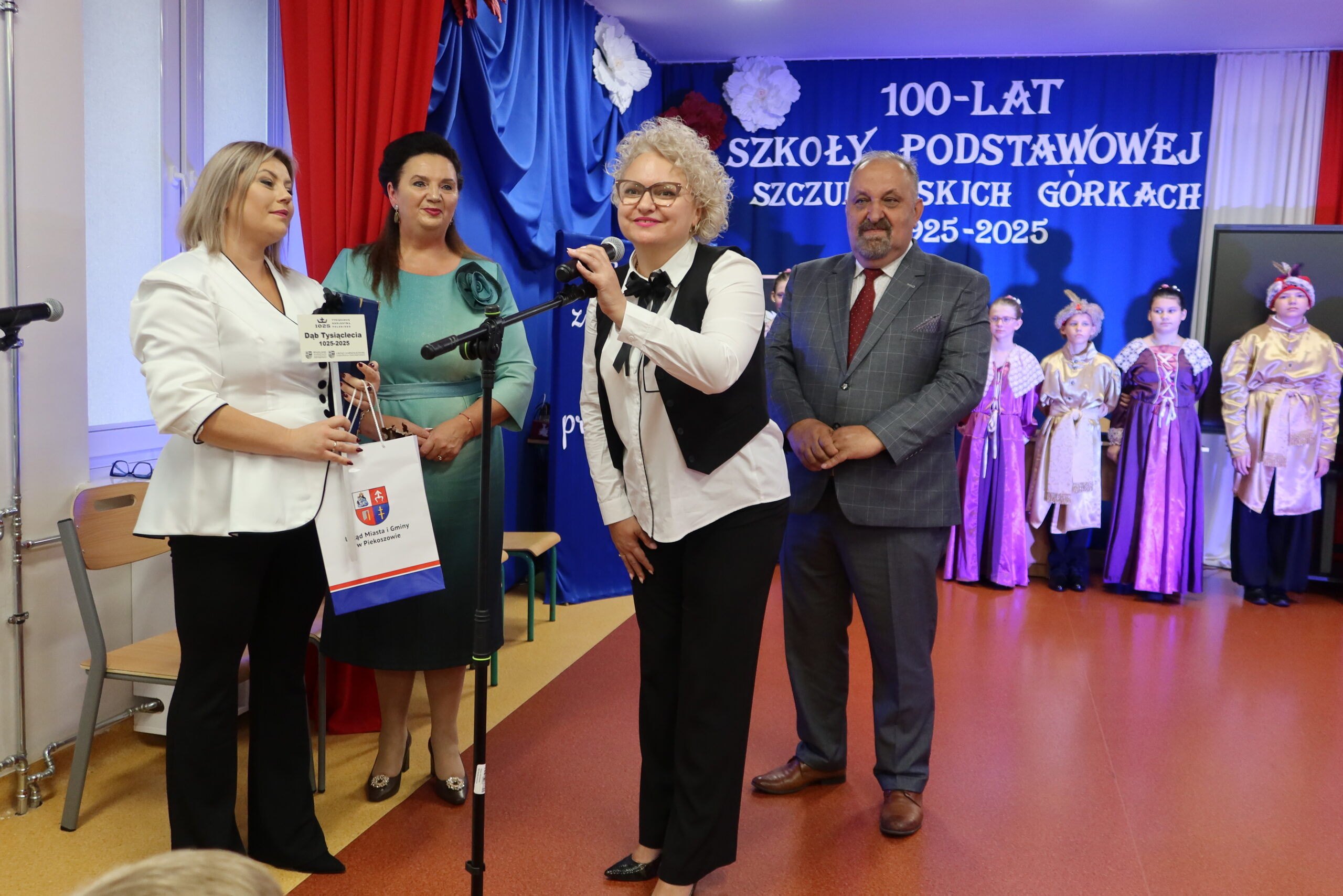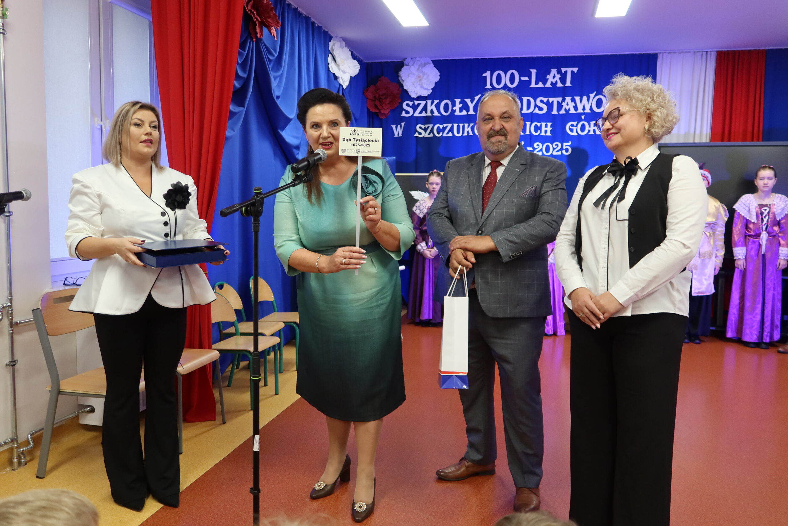 Burmistrz miasta i gminy Piekoszów Teresa Jakubowska złożyła całej społeczności szkolnej serdeczne gratulacje i życzenia dalszego rozwoju. – Szkoła w Szczukowskich Górkach to miejsce, w którym historia łączy się z teraźniejszością, a tradycja z nowoczesnością. Stuletnia placówka to powód do ogromnej dumy dla całej gminy. Przez te lata placówka wykształciła setki zdolnych i wartościowych ludzi. Z głębi serca życzę, aby kolejne lata przynosiły jeszcze więcej sukcesów i radości. Przekazując sadzonkę potomka legendarnego Dębu Bartka, chciałam symbolicznie podkreślić siłę, trwałość i tożsamość, które podobnie jak ten dąb są wpisane w historię tej szkoły. Zrobię wszystko, aby mogła nadal się rozwijać i służyć kolejnym pokoleniom – powiedziała burmistrz Teresa Jakubowska, wręczając na ręce dyrektor pamiątkowy grawerton oraz sadzonkę Dębu Bartka, która zostanie posadzona na terenie szkoły.