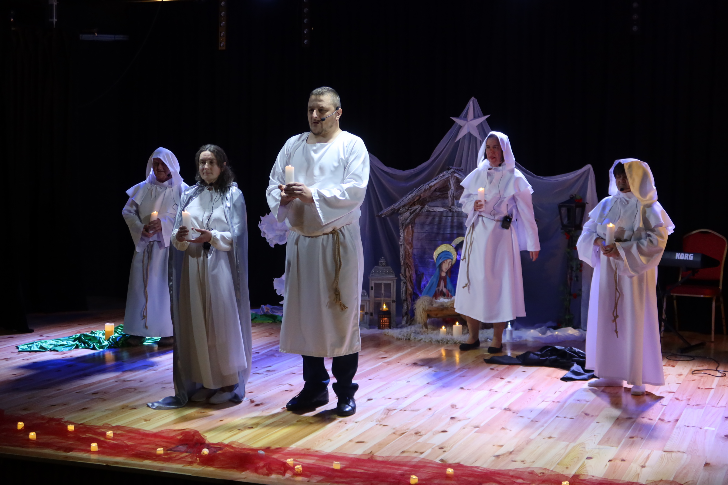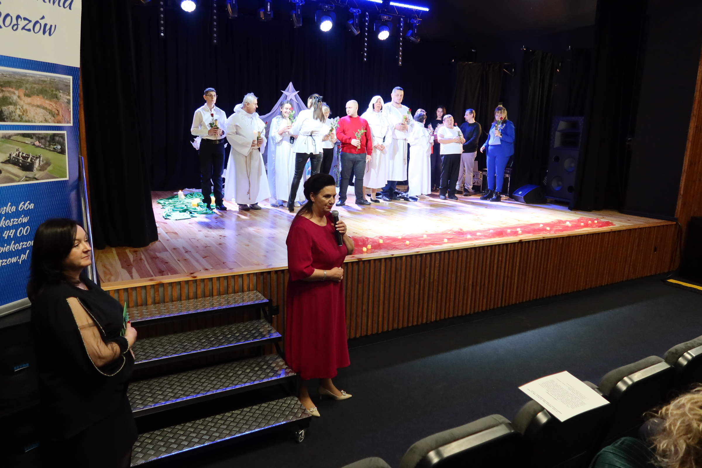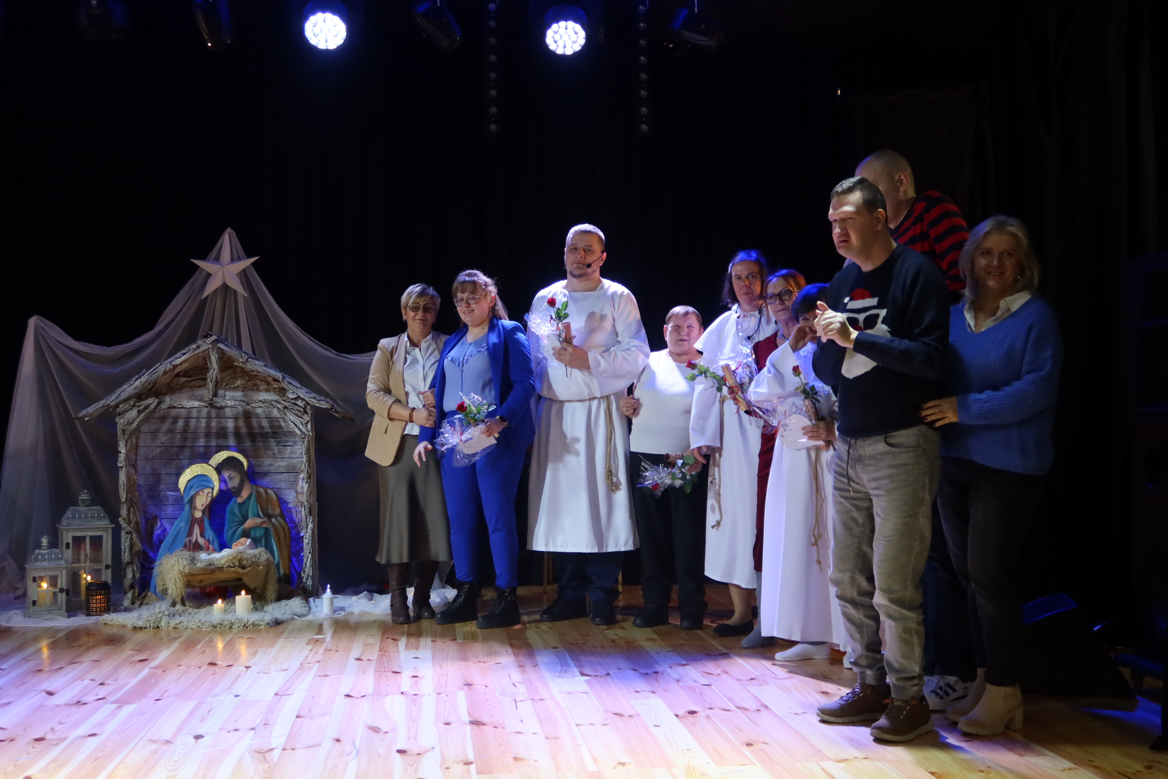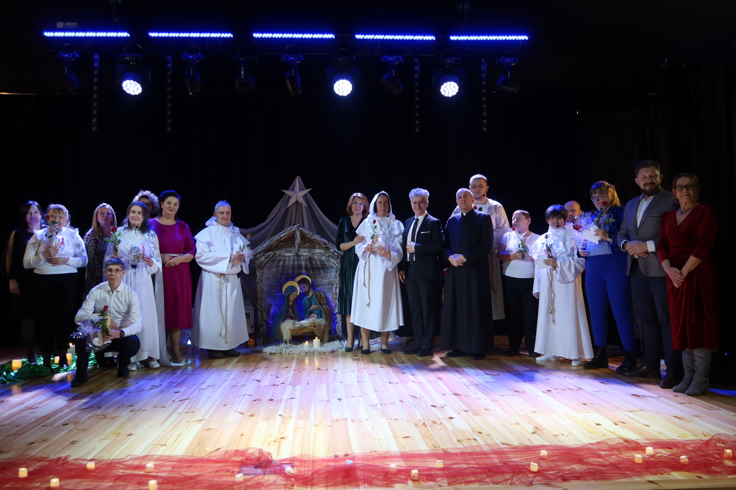 Na deskach sceny Kina „Piksel” w Piekoszowie grupa teatralna Środowiskowego Domu Samopomocy zaprezentowała wyjątkowy, pełen symboliki spektakl, który dogłębnie poruszył publiczność. Przedstawienie było opowieścią o człowieku odbywającym wewnętrzną podróż w poszukiwaniu sensu, o tęsknocie za blaskiem rozświetlającym drogę życia oraz o trzech darach, jakie Bóg składa w ręce człowieka: wierze, nadziei i miłości. Motywem przewodnim spektaklu było światło, znak Bożego Narodzenia, ale także uniwersalny symbol dobra, pokoju i spotkania człowieka z drugim człowiekiem.