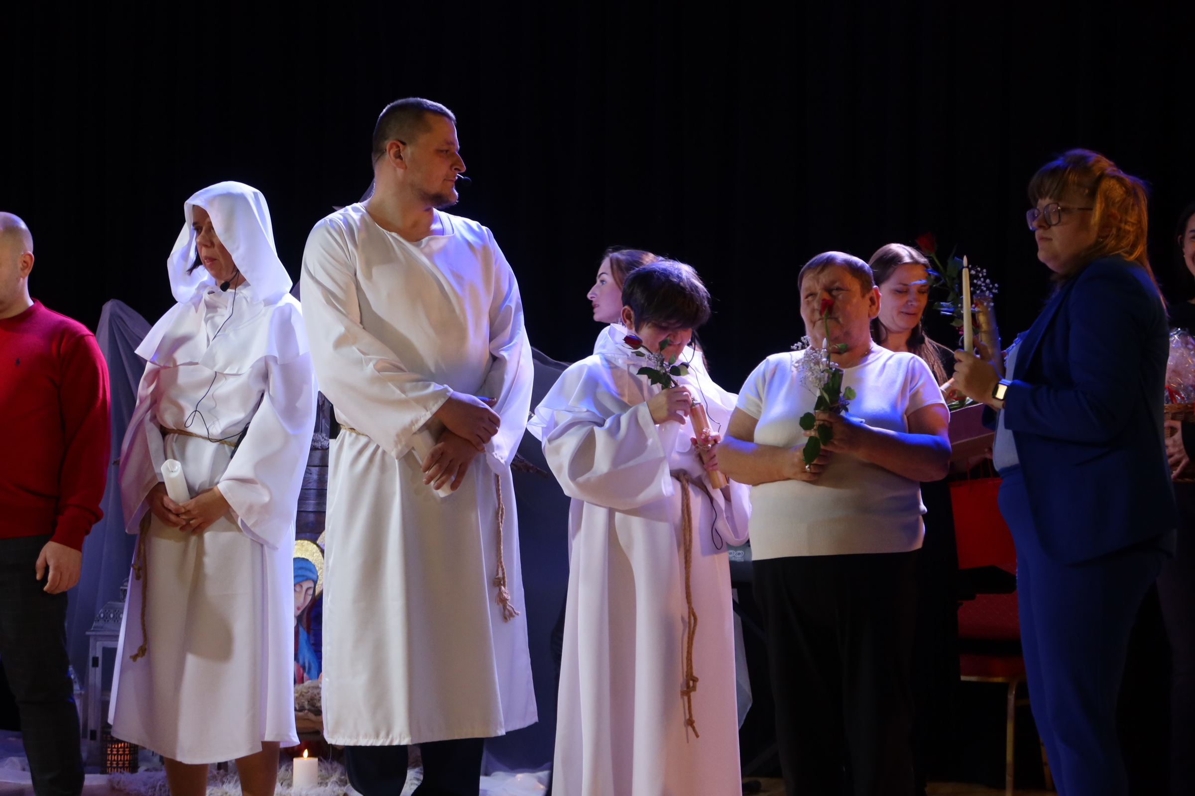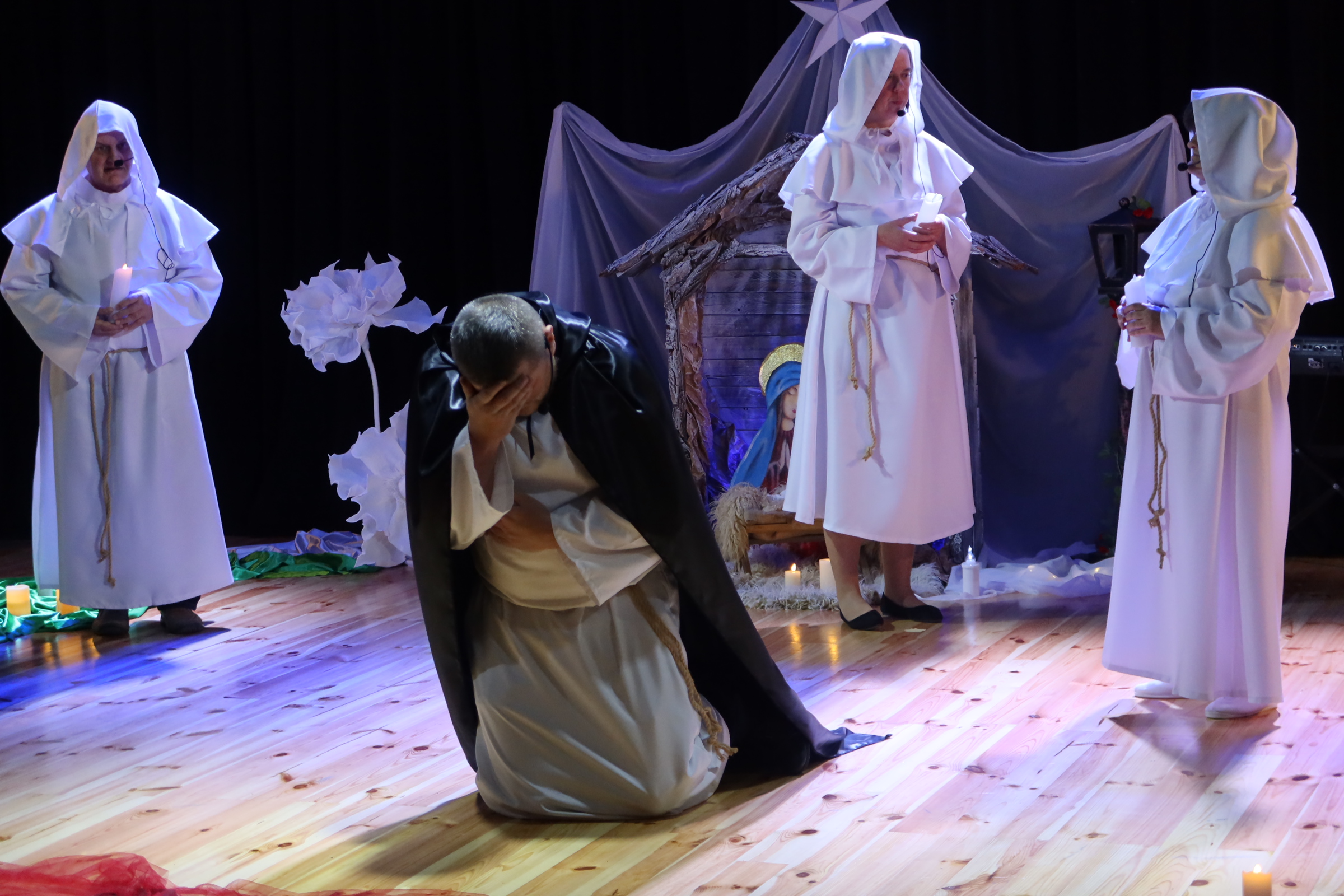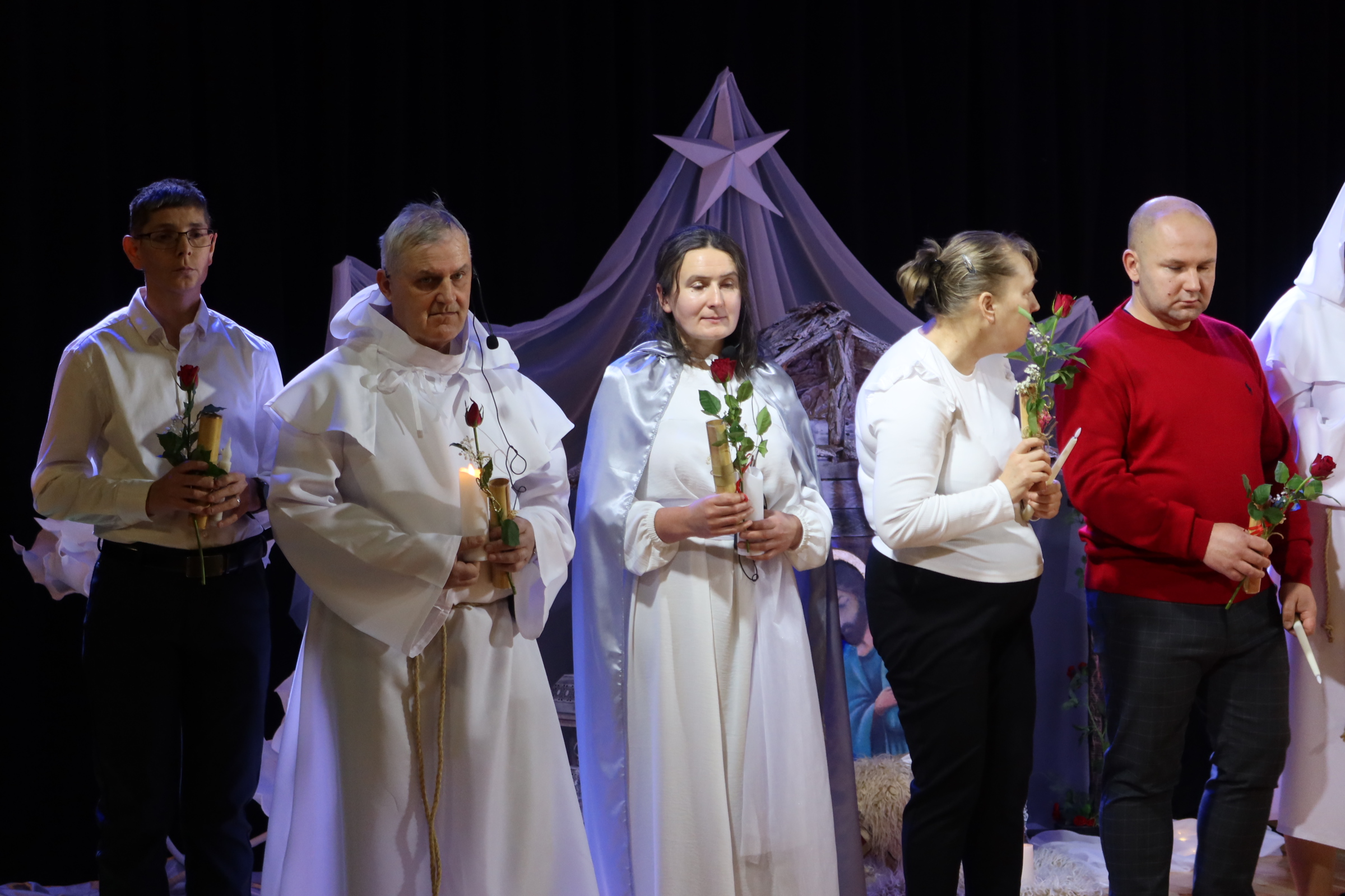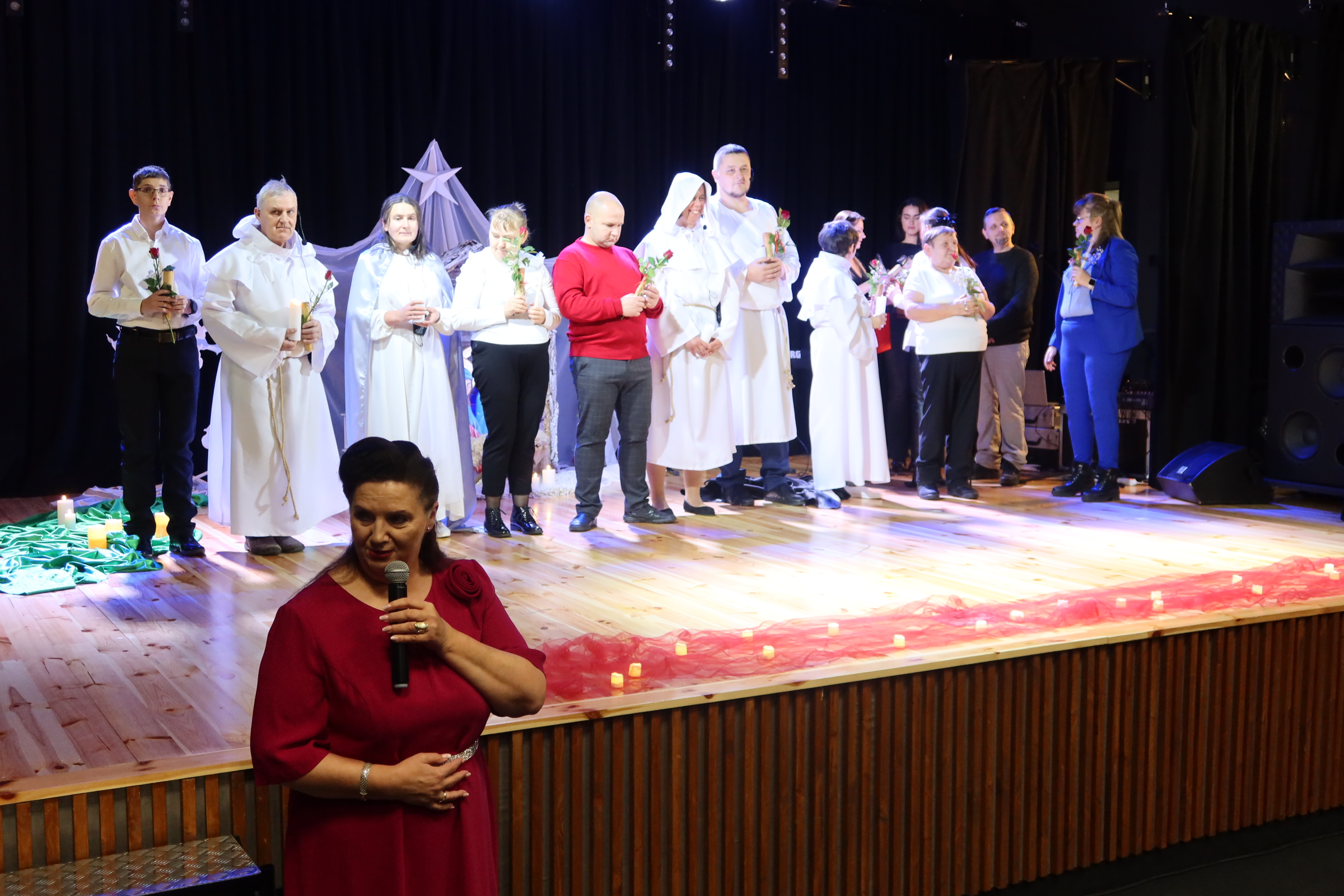 Na deskach sceny Kina „Piksel” w Piekoszowie grupa teatralna Środowiskowego Domu Samopomocy zaprezentowała wyjątkowy, pełen symboliki spektakl, który dogłębnie poruszył publiczność. Przedstawienie było opowieścią o człowieku odbywającym wewnętrzną podróż w poszukiwaniu sensu, o tęsknocie za blaskiem rozświetlającym drogę życia oraz o trzech darach, jakie Bóg składa w ręce człowieka: wierze, nadziei i miłości. Motywem przewodnim spektaklu było światło, znak Bożego Narodzenia, ale także uniwersalny symbol dobra, pokoju i spotkania człowieka z drugim człowiekiem.