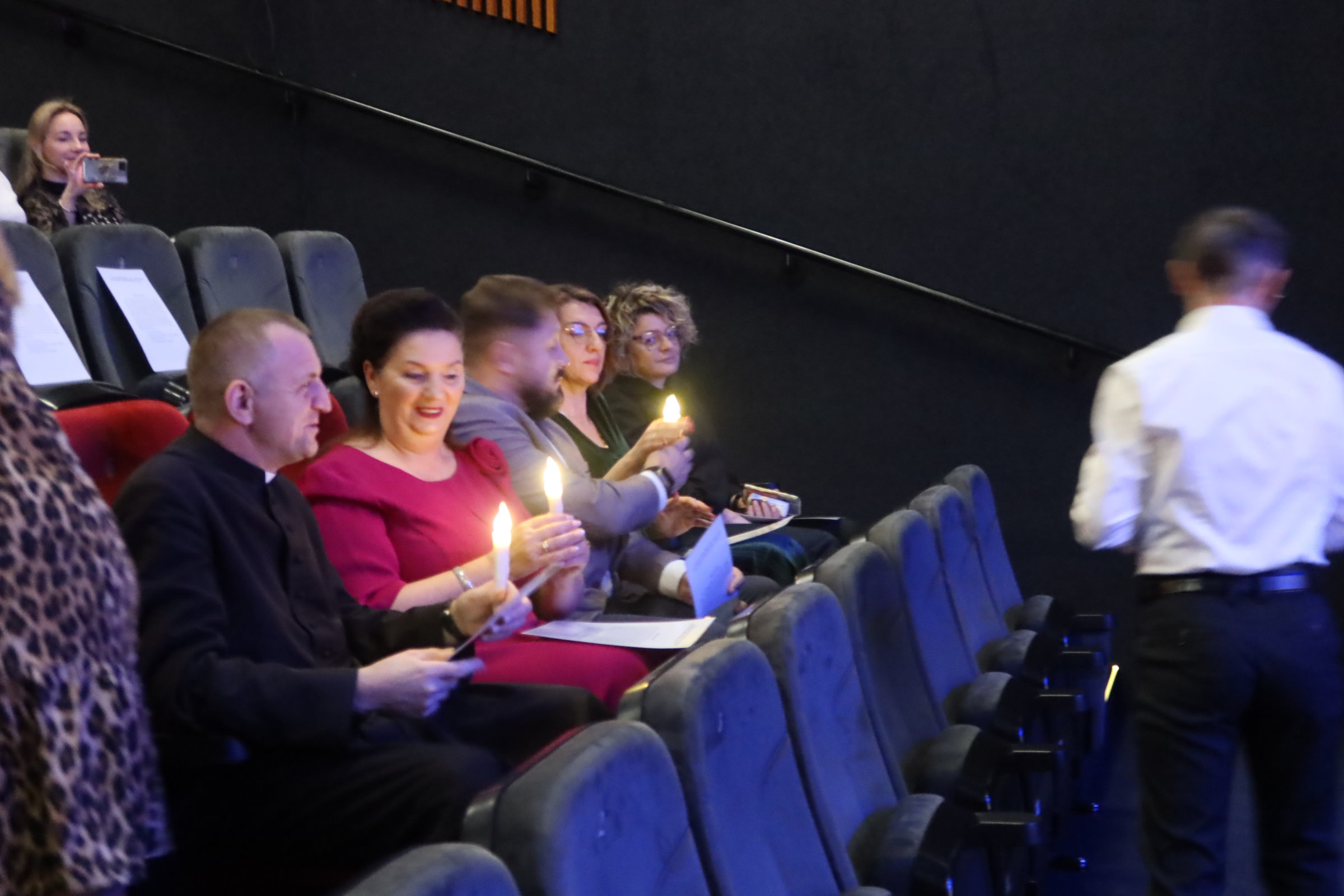 Już od pierwszych minut przedstawienie budowało niezwykły nastrój. Na scenie paliły się świece, a aktorzy w symboliczny sposób przekazali światło w ręce widzów. Płomień wędrował z osoby na osobę, łącząc publiczność i wykonawców we wspólnym doświadczeniu. Ten prosty, ale bardzo wymowny gest stał się jednym z najbardziej poruszających momentów spektaklu.