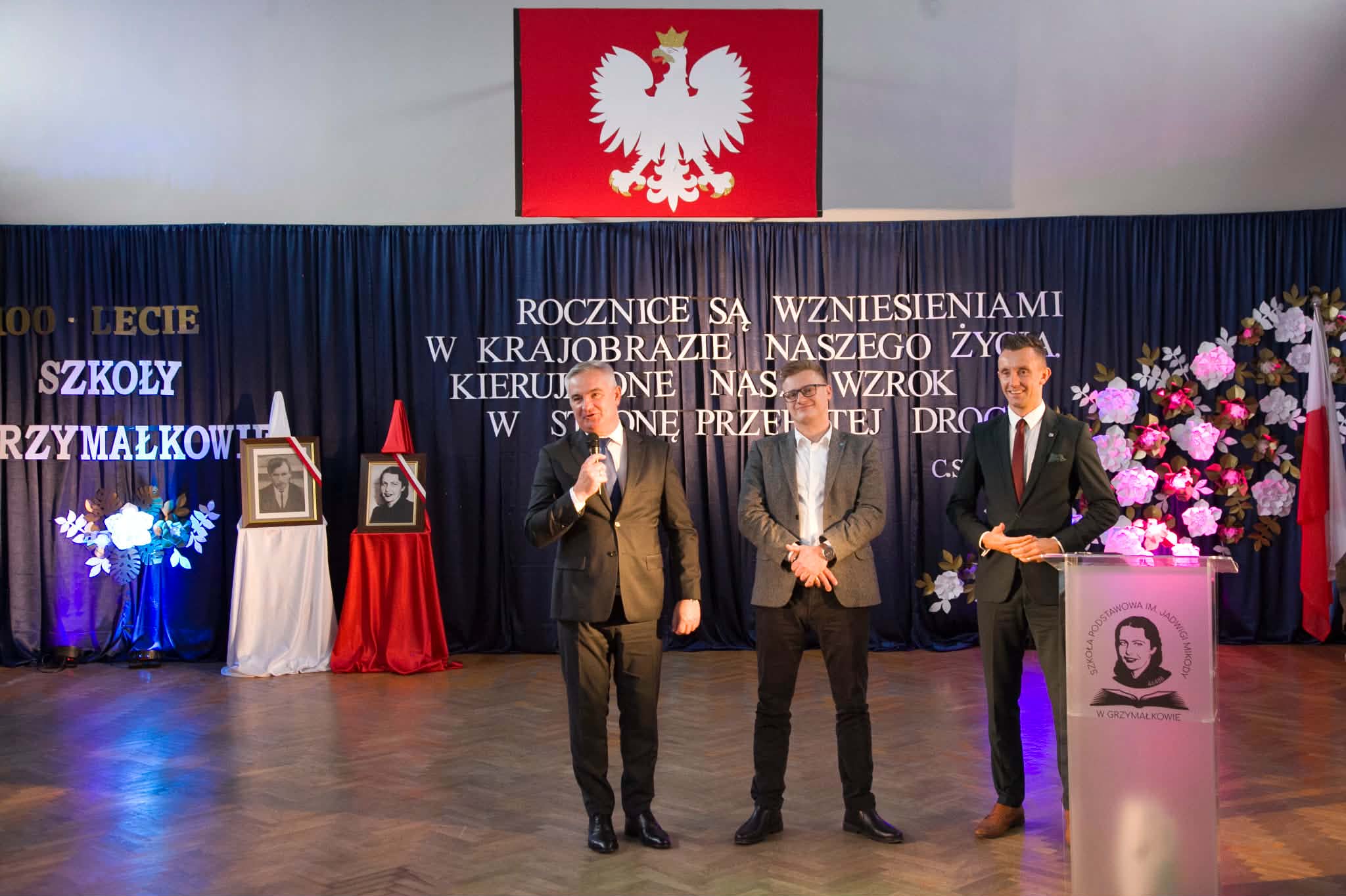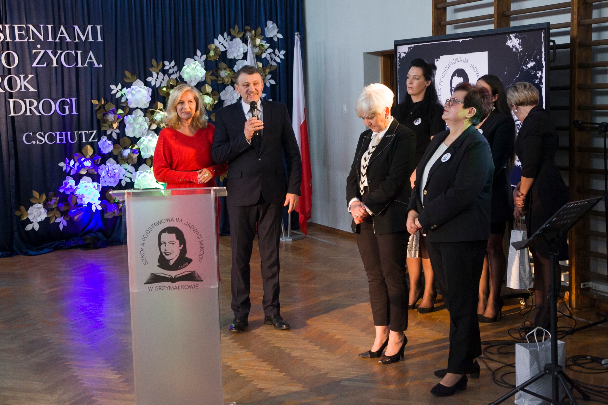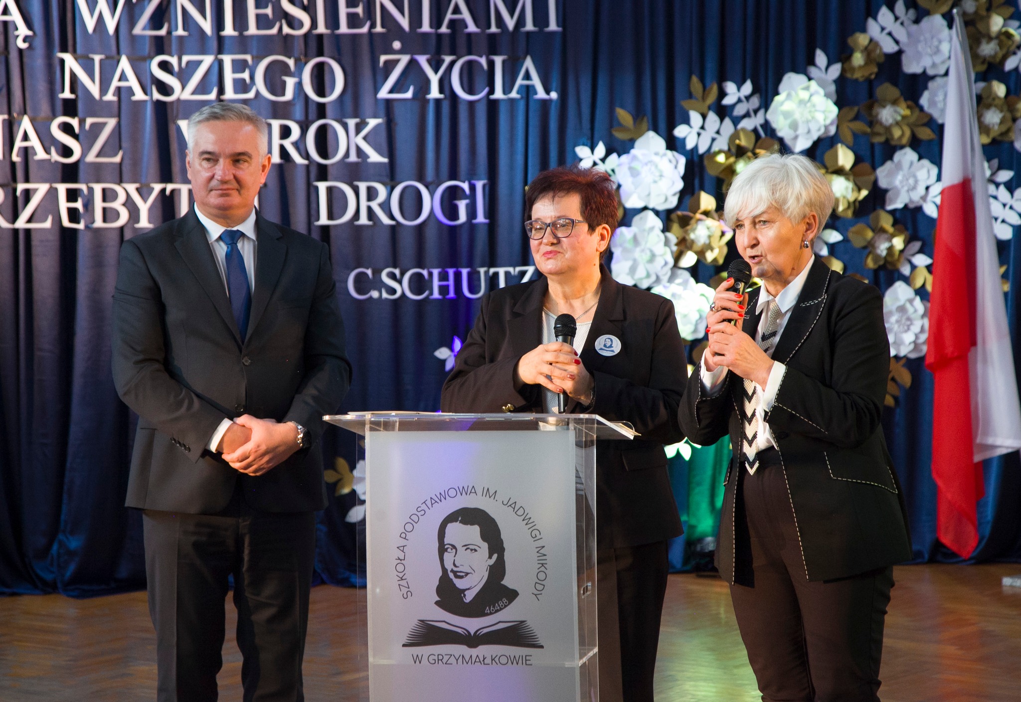 Szczególne miejsce zajęło przypomnienie wydarzeń z 9 grudnia 2022 roku, kiedy to Szkole Podstawowej w Grzymałkowie nadano imię Jadwigi Mikody i poświęcono sztandar. Ten dzień zapisał się jako jeden z najważniejszych w dziejach szkoły, a obecność córki patronki, Mirosławy, nadała uroczystości niezwykle osobisty i wzruszający wymiar. Podczas jubileuszu pamięcią wrócono również do Jana Marca, założyciela szkoły, którego misja i praca sprawiły, że edukacja w Grzymałkowie mogła rozpocząć się już sto lat temu.