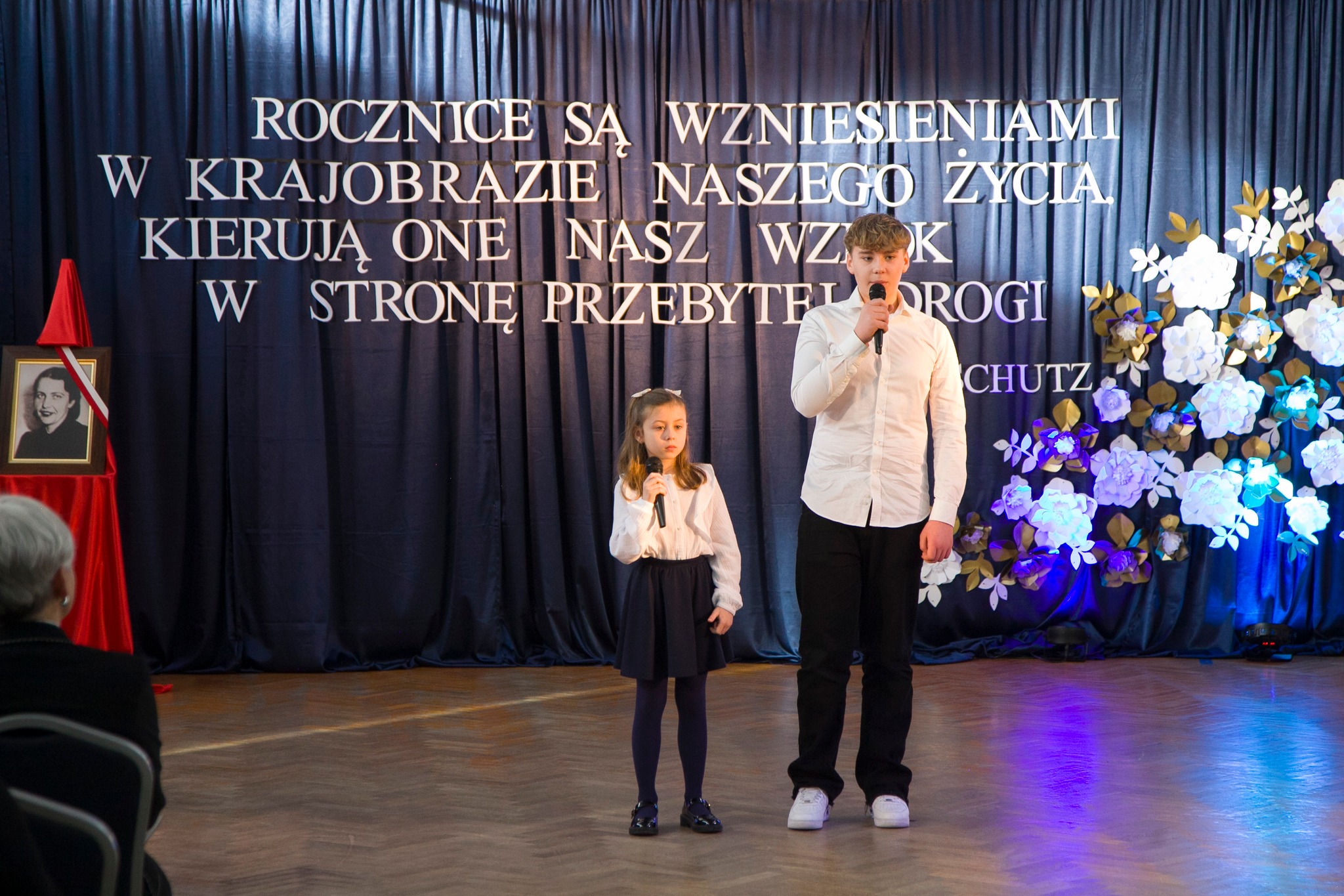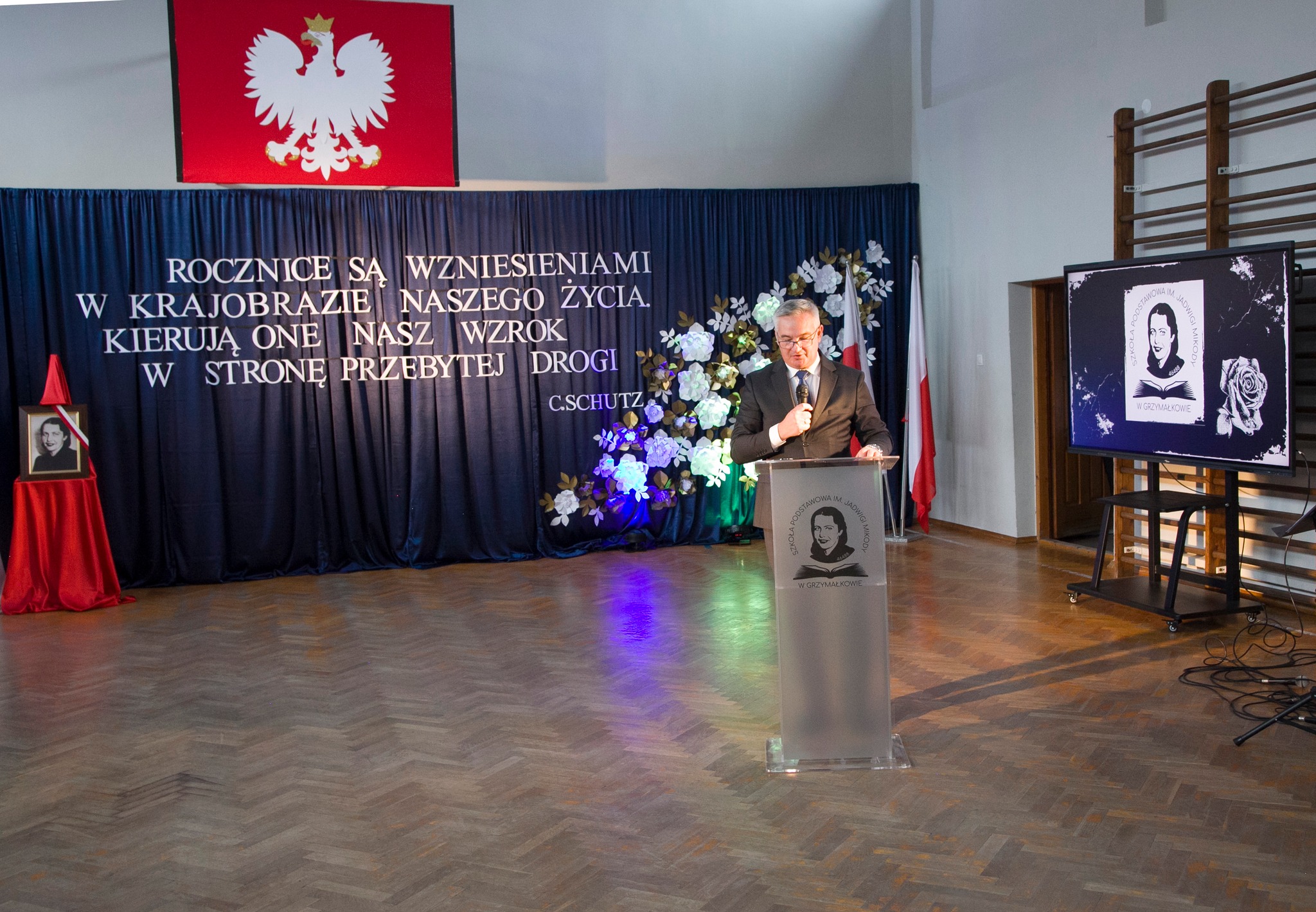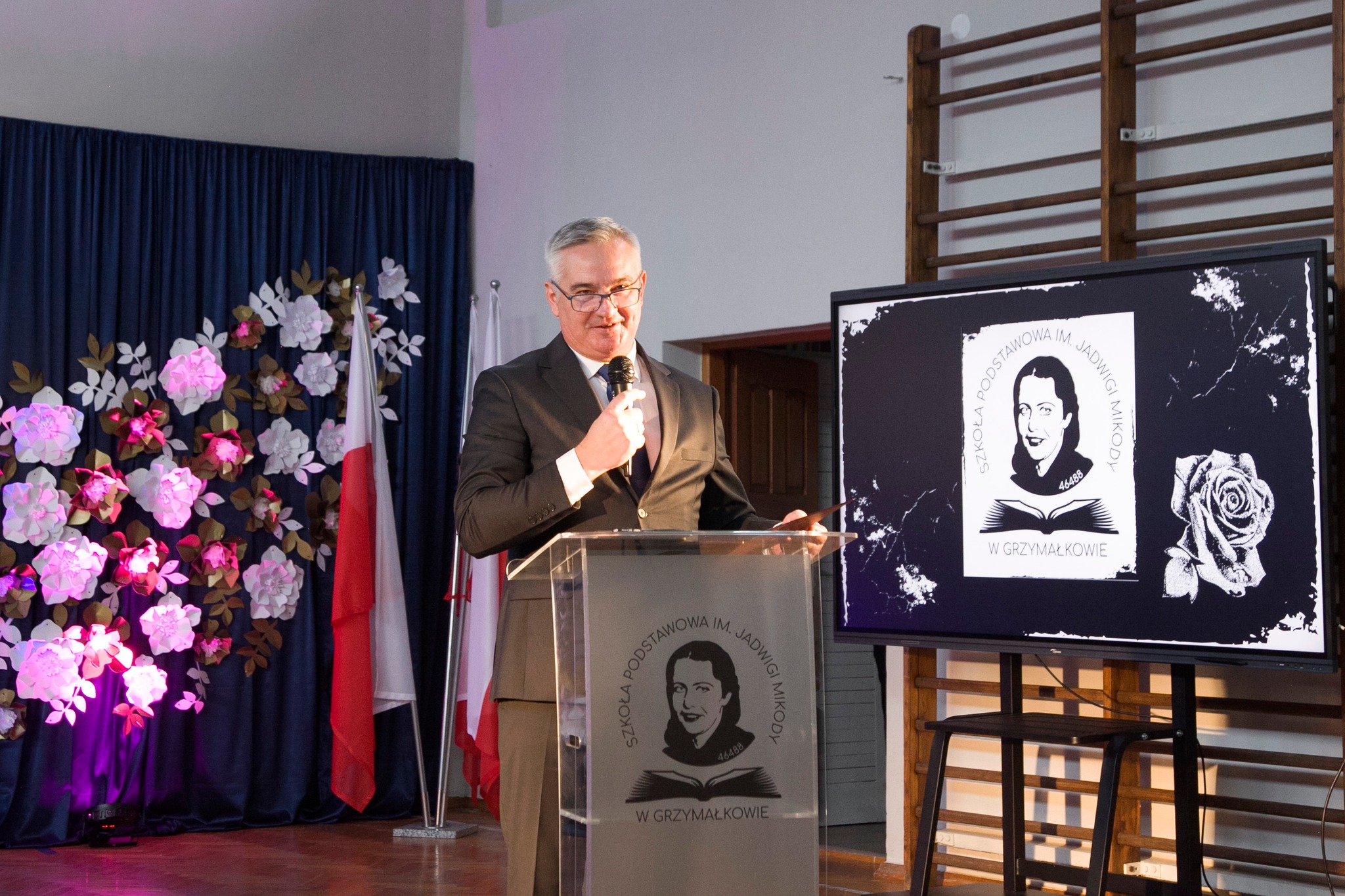 Szczególne miejsce zajęło przypomnienie wydarzeń z 9 grudnia 2022 roku, kiedy to Szkole Podstawowej w Grzymałkowie nadano imię Jadwigi Mikody i poświęcono sztandar. Ten dzień zapisał się jako jeden z najważniejszych w dziejach szkoły, a obecność córki patronki, Mirosławy, nadała uroczystości niezwykle osobisty i wzruszający wymiar. Podczas jubileuszu pamięcią wrócono również do Jana Marca, założyciela szkoły, którego misja i praca sprawiły, że edukacja w Grzymałkowie mogła rozpocząć się już sto lat temu.