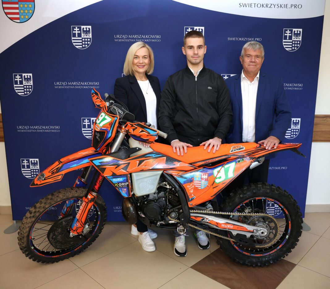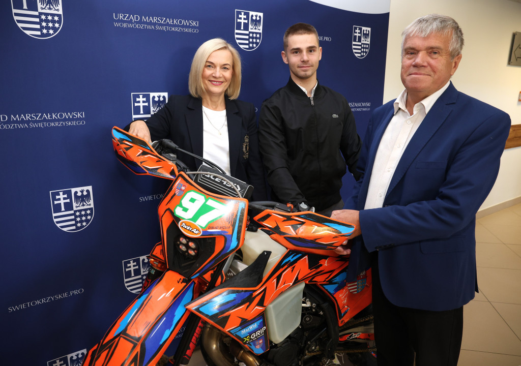 Marszałek województwa świętokrzyskiego Renata Janik wraz z Mieczysławem Gębskim wiceprzewodniczącym Sejmiku Województwa Świętokrzyskiego pogratulowali Dawidowi Łyżwie, utalentowanemu zawodnikowi Kieleckiego Klubu Motocyklowego Wena, który od lat z pasją i konsekwencją odnosi sukcesy w zawodach cross country i enduro, reprezentując region świętokrzyski na arenie ogólnopolskiej.