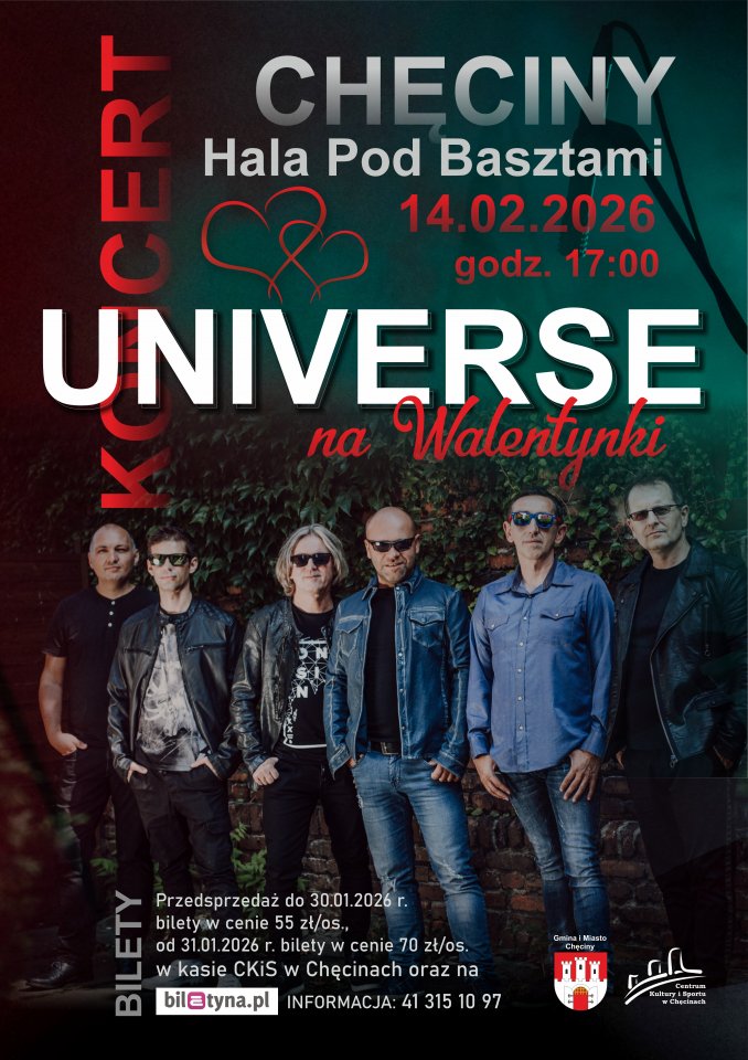 Niezapomniany koncert zespołu UNIVERSE w Chęcinach już 14 lutego 2026 r. o godz. 17:00 w hali widowiskowo-sportowej Pod Basztami Centrum Kultury i Sportu w Chęcinach. To będzie wyjątkowe wydarzenie nie tylko dla zakochanych!