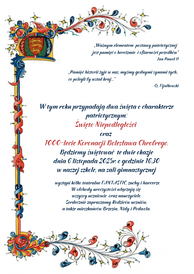 Szkoła Podstawowa w Brzezinach zaprasza na wyjątkową inscenizację przygotowaną z okazji Święta Niepodległości 11 Listopada oraz 1000-lecia Koronacji Bolesława Chrobrego.