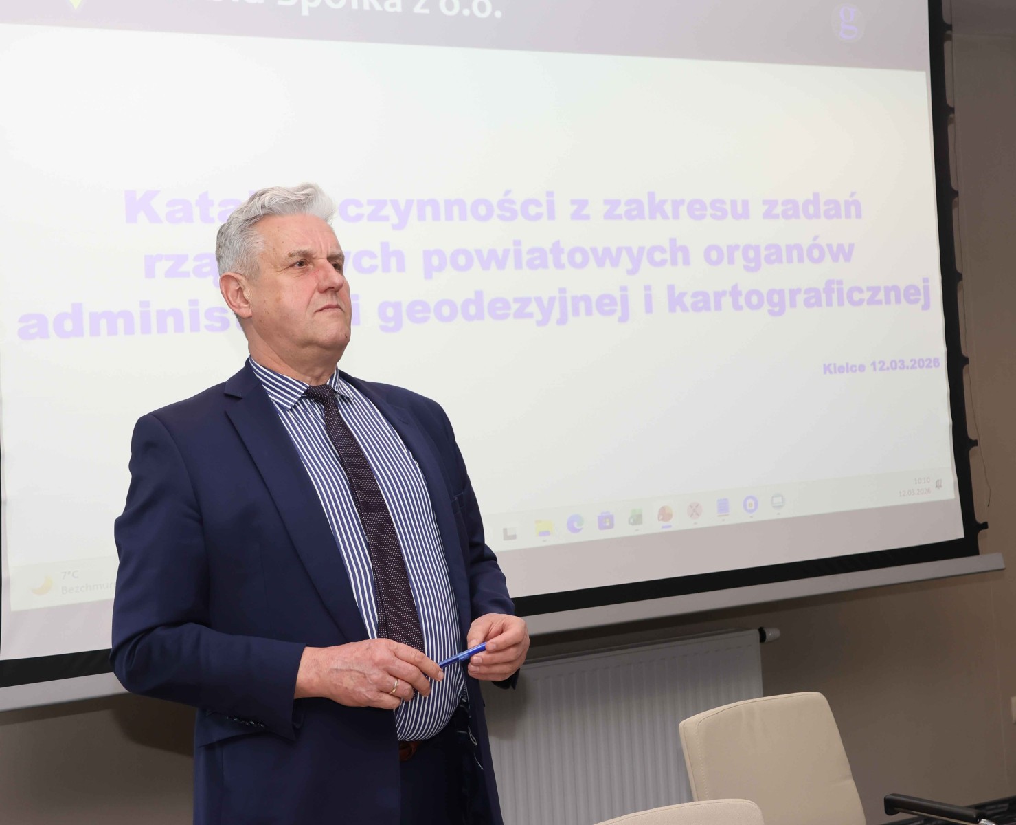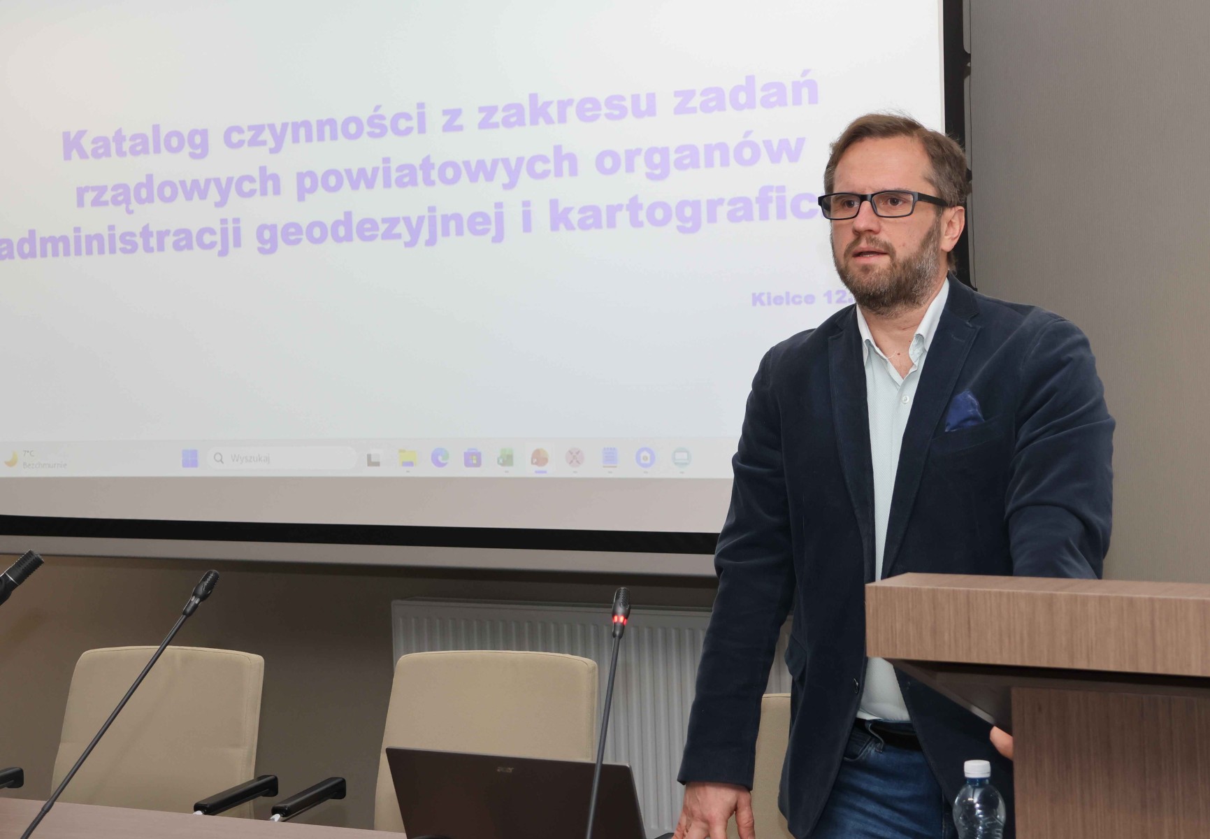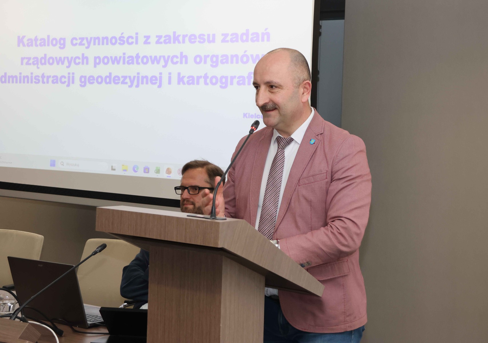 Uczestników spotkania w Starostwie Powiatowym w Kielcach powitał członek Zarządu Powiatu Mariusz Ściana. – Cieszę się, że właśnie u nas spotykają się przedstawiciele służb geodezyjnych i kartograficznych. W powiecie kieleckim doskonale rozumiemy ważną rolę, jaka macie do spełnienia. To właśnie u nas wydawanych jest najwięcej pozwoleń na budowę, a wiadomo, że każdy z tych dokumentów wymaga również pracy geodetów i kartografów. Mam nadzieję, że zdobyta dziś wiedza ułatwi i uprości dodatkowe zadania nakładane na geodetów – mówił.