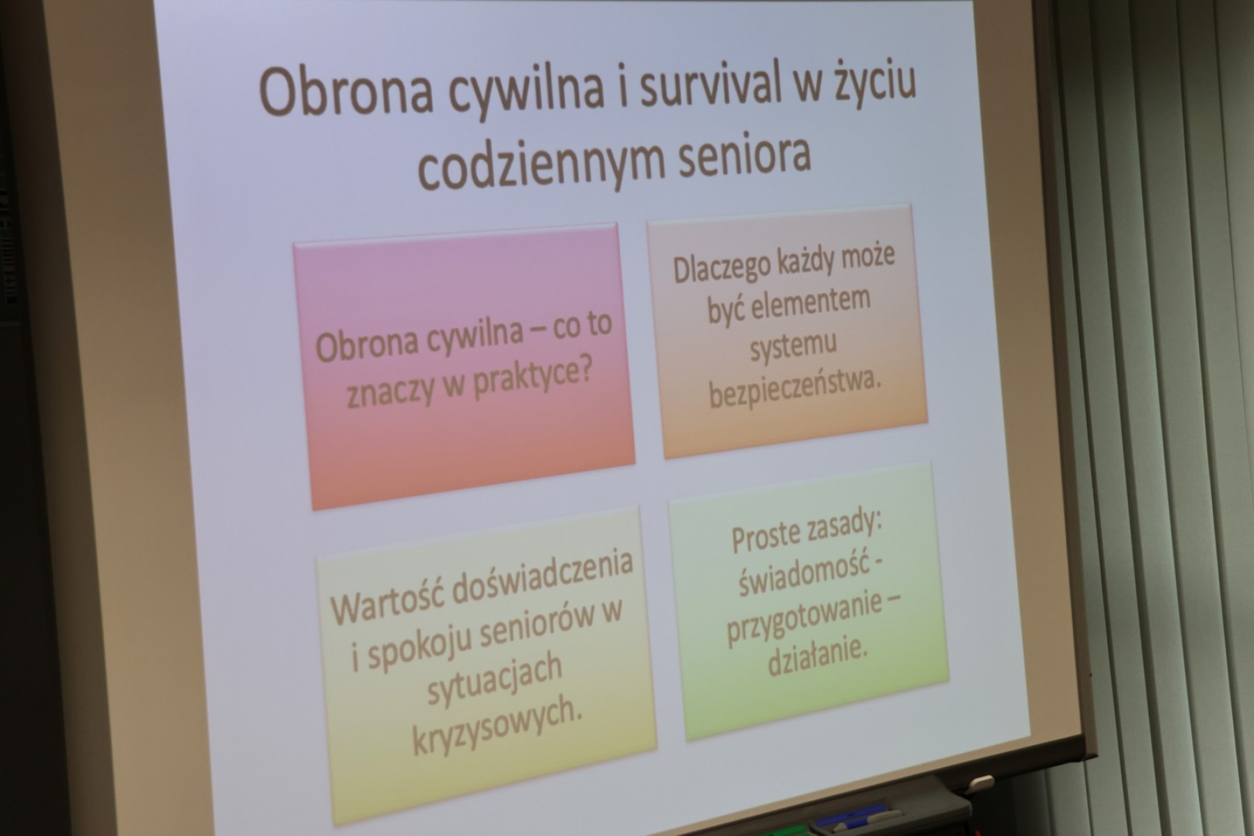 Seniorzy mogli dowiedzieć się jak poradzić sobie bez prądu, wody i ogrzewania, a także jak komunikować się w kryzysie, czy jak bezpiecznie wyjść z domu.