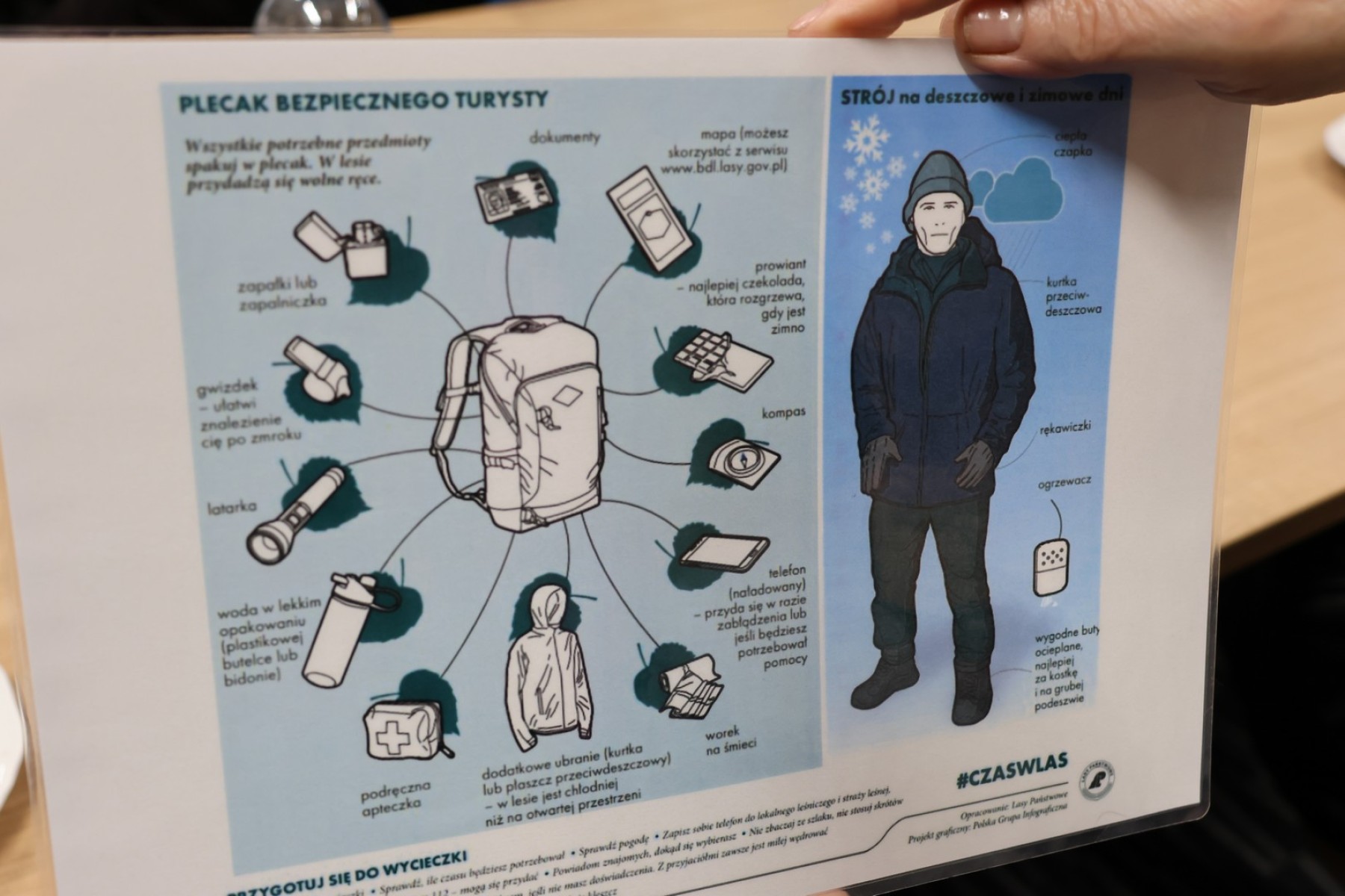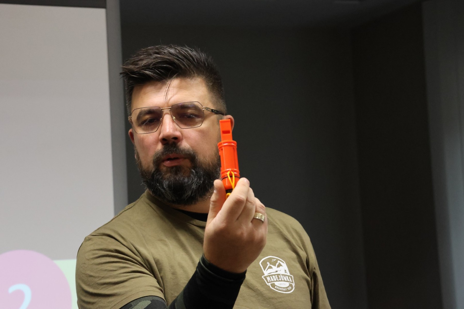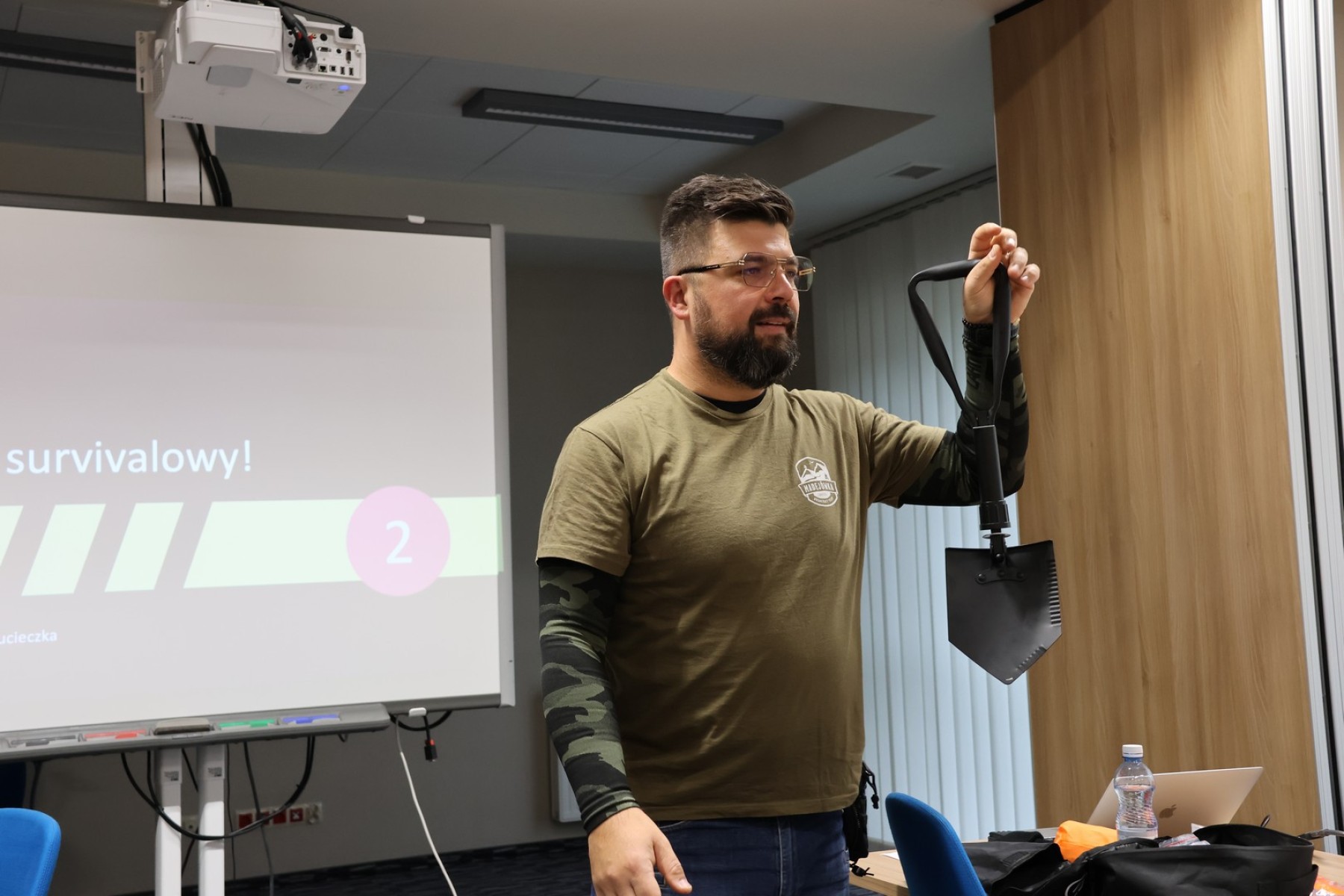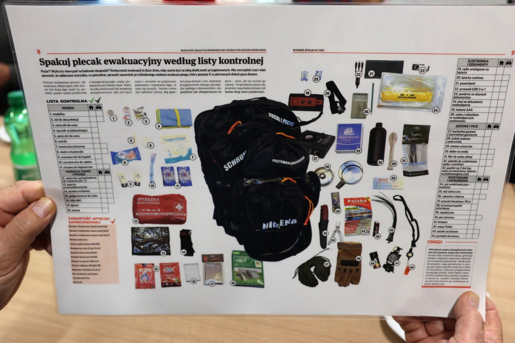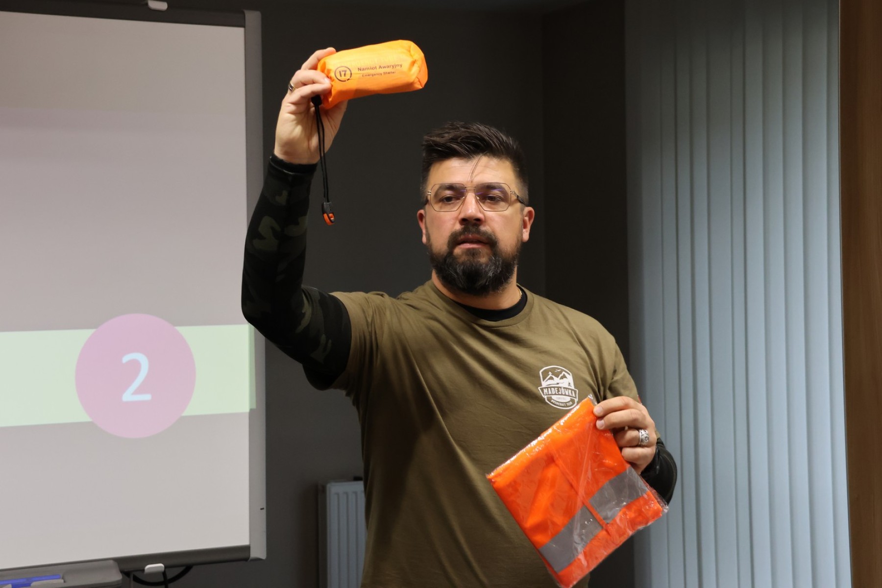 Omówił zagrożenia lokalne, takie jak : pożary, wichury, przerwy w dostawie prądu, powodzie, silne mrozy, upały. Radził jak przygotować się do kryzysu. W tym celu zaprezentował m.in. domowy zestaw przetrwania, na który składa się odpowiednio wyposażony plecak survivalowy.