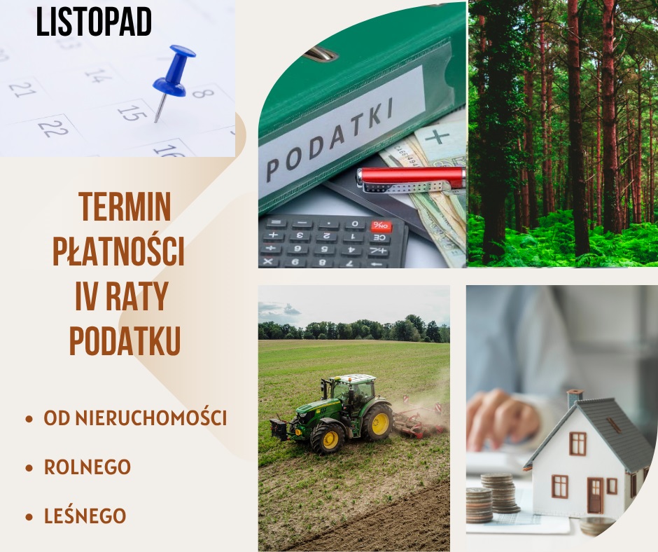 Urząd Gminy i Miasta w Chęcinach informuje, iż z dniem 17.11.2025 r. upływa termin płatności IV raty podatku od nieruchomości, rolnego i leśnego od osób fizycznych.