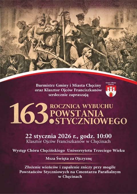 Burmistrz Gminy i Miasta Chęciny Robert Jaworski oraz Klasztor Ojców Franciszkanów w Chęcinach zapraszają do udziału w uroczystościach patriotyczno-religijnych z okazji 163. rocznicy wybuchu powstania styczniowego. Wydarzenie odbędzie się 22 stycznia 2026 r. o godz. 10:00 w Klasztorze Ojców Franciszkanów w Chęcinach.
