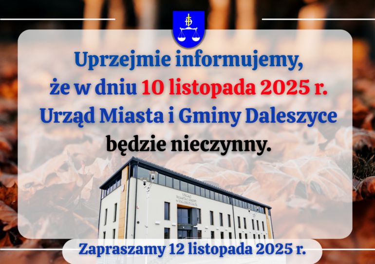 Uprzejmie informujemy, że w poniedziałek, 10 listopada 2025 r., Urząd Miasta i Gminy w Daleszycach będzie nieczynny.