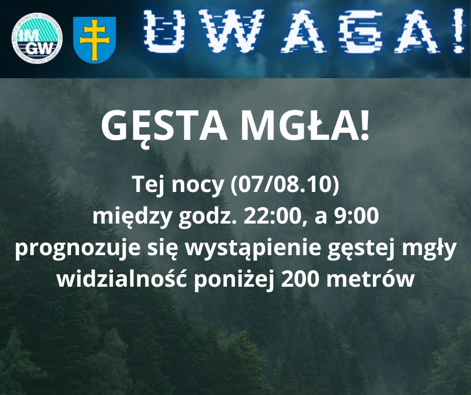 Strona głównaAktualnościUwaga! W nocy gęsta mgła Aktualności Uwaga! W nocy gęsta mgła CKinfo.pl 8 października 2025 FacebookTwitterWhatsAppTelegram Zobacz CKinfo.pl - 8 października 2025Siła i odwaga w mundurze – 100 lat kobiet w polskiej policji CKinfo.pl - 2 października 2025Szkoła Rodzenia w pigułce CKinfo.pl - 2 października 2025Gmina Chęciny dba o dziedzictwo – renowacja murów Zamku Królewskiego dobiegła końca, warownia została należycie zabezpieczona i zyskała nowy blask CKinfo.pl - 2 października 2025VI edycja Ogólnopolskiego Konkursu Testowego z Zakresu Bezpiecznej Pracy w Gospodarstwie Rolnym CKinfo.pl - 8 października 2025Czekamy na zgłoszenia siatkarzy CKinfo.pl - 3 października 2025Edukacja i pasja bez granic wieku – inauguracje roku akademickiego w Chęcinach i Morawicy CKinfo.pl - 8 października 2025Wyróżnienie dla projektu NACAO. Konferencja w Sarajewie IMGW PIB ostrzega, że najbliższej nocy w Powiecie Kieleckim może wystąpić gęsta mgła, ograniczająca widzialność do 200 metrów. Zjawisko może trwać od godziny 22:00, do 9:00. GminaPowiat kieleckiGminaPowiecie KieleckimŹRÓDŁOInformacja pochodzi ze strony www.powiat.kielce.pl TagiIMGW-PIBmgłaNOCostrzeżeniepogodaPowiecie KieleckimStarostwo Powiatowe w Kielcachwidzialnośćzjawisko Udział FacebookTwitterWhatsAppTelegram Poprzedni artykułZakończono przebudowę ul. Jabłoniowej i Rodzinnej w Kubach MłynachNastępny artykułMiasto piernika i Kopernika – Artyści z Morawicy zwiedzali Toruń Aktualności SportCKinfo.pl - 8 października 2025XII Turniej Piłki Siatkowej o Puchar Przewodniczącego Rady Powiatu KieleckiegoW sobotę, 25 października zostanie rozegrany XII Turniej Piłki Siatkowej o Puchar Przewodniczącego Rady Powiatu Kieleckiego. Mecze odbędą się w Hali... Aktualności Trwają prace remontowe przy klasztorze Sióstr Bernardynek. CKinfo.pl - 8 października 2025 Oświata Bezpłatne szczepienia przeciwko grypie CKinfo.pl - 8 października 2025 Oświata Rusza kolejna edycja programu „Dla Ziemi, dla siebie” CKinfo.pl - 8 października 2025 Sport Czekamy na zgłoszenia siatkarzy CKinfo.pl - 8 października 2025 Polecamy Trwają prace remontowe przy klasztorze Sióstr Bernardynek. Aktualności CKinfo.pl - 8 października 2025 Szczepienia lisów przeciwko wściekliźnie Aktualności CKinfo.pl - 8 października 2025 Konkurs testowy dla rolników Aktualności CKinfo.pl - 8 października 2025 Gęsta mgła. Aktualności CKinfo.pl - 8 października 2025