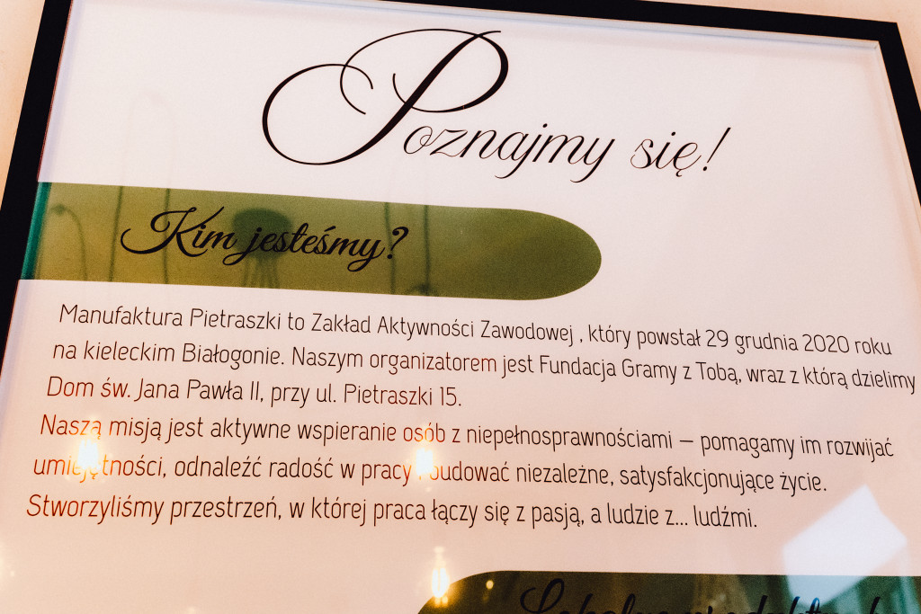 Manufaktura Pietraszki to Zakład Aktywności Zawodowej na kieleckim Białogonie, organizowany przez fundację “Gramy z tobą”, którego zadaniem i misją jest aktywizacja zawodowa osób z niepełnosprawnościami. ZAZ działa od grudnia 2020 r., zatrudnia 40 osób z niepełnosprawnościami w stopniu umiarkowanym i znacznym. W “Pietraszkach ” produkowane są przepyszne wyroby cukiernicze, produkty pszczelarskie, powstają prace rękodzielnicze – kartki świąteczne, ozdoby, zestawy prezentowe, działa także sekcja ogrodnicza.