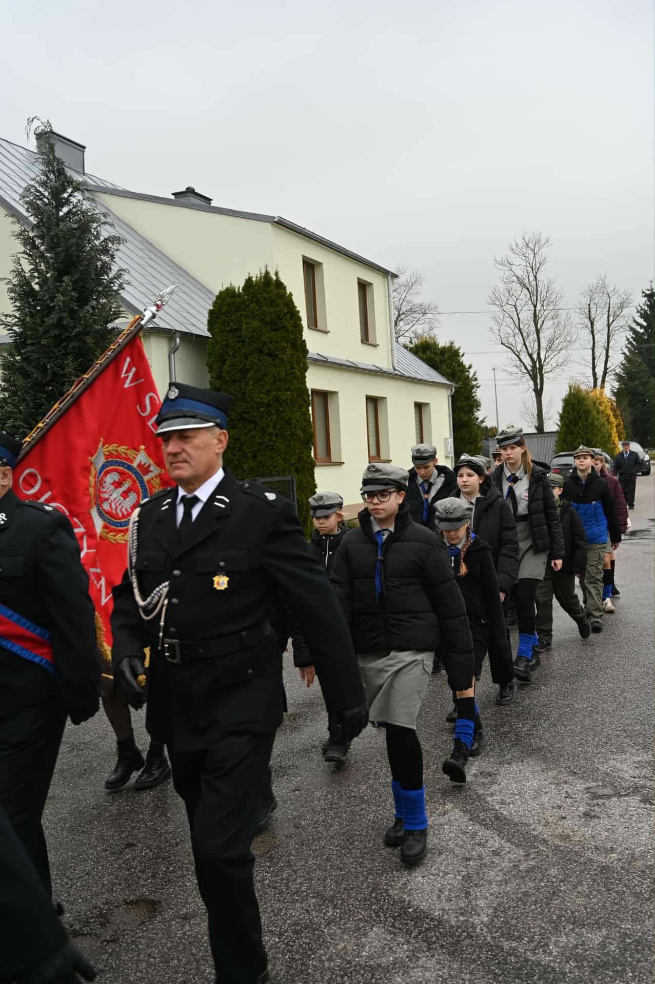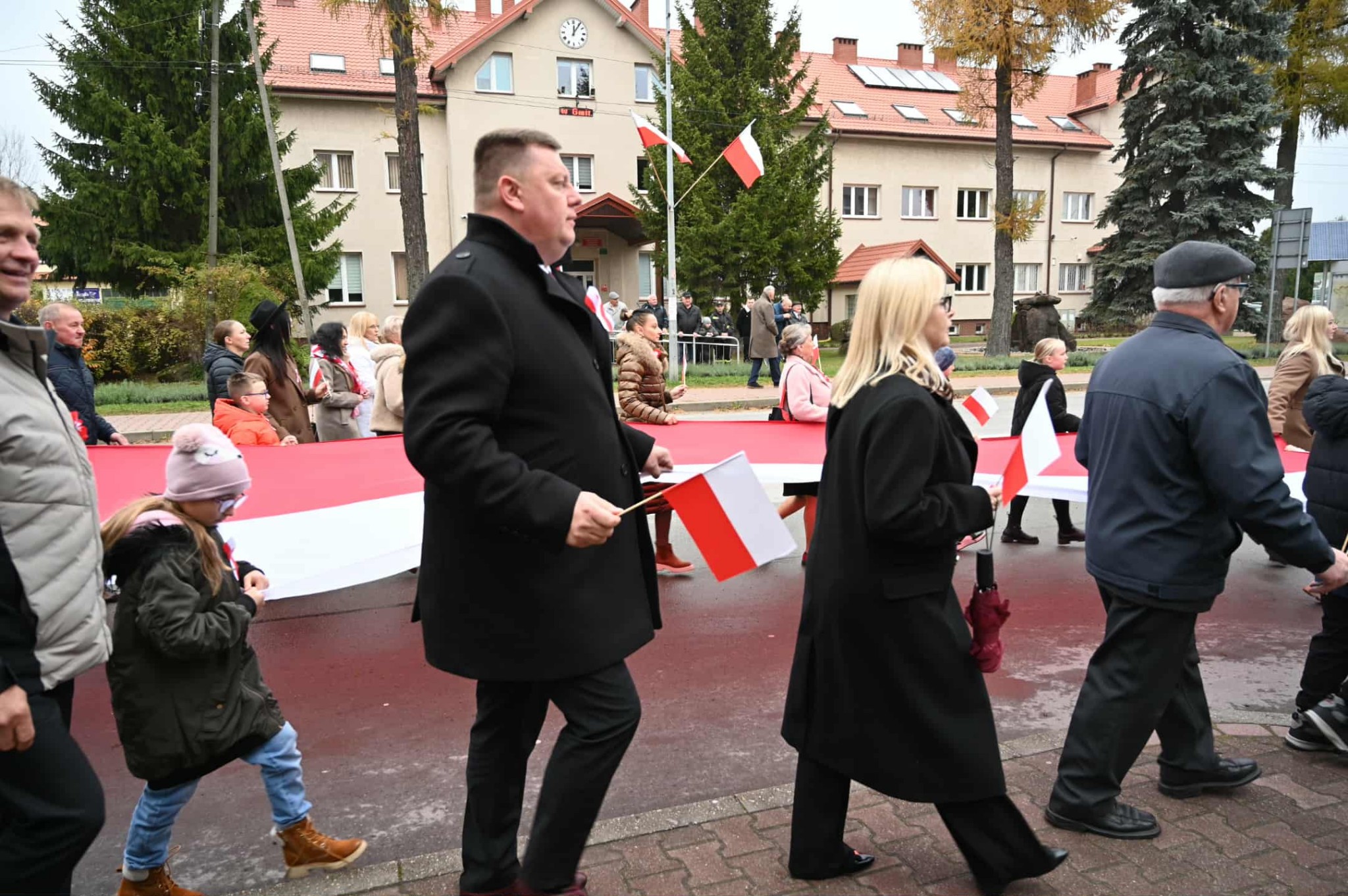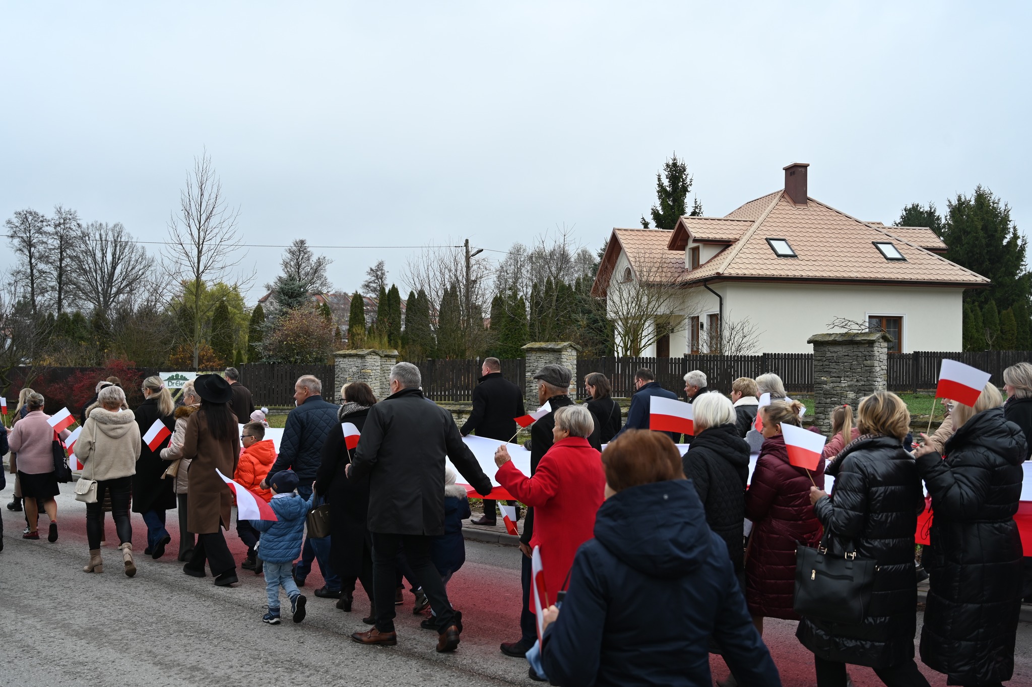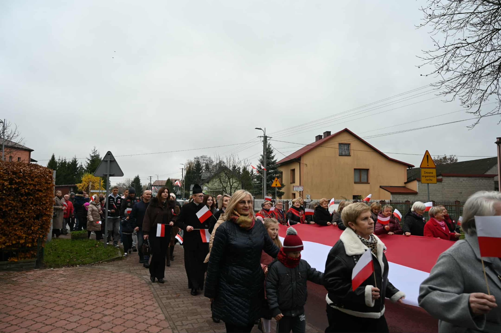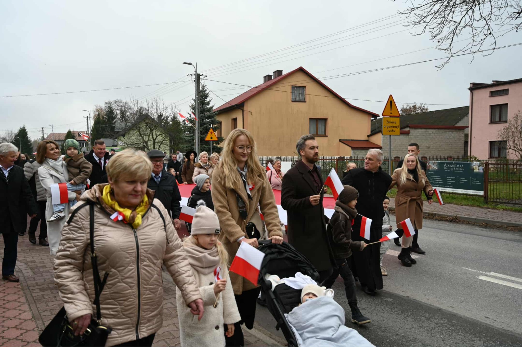 Po zakończonej Mszy Świętej uczestnicy przemaszerowali ulicami Strawczyna w uroczystym pochodzie prowadzonym przez Orkiestrę Dętą ze Strawczyna. Wśród maszerujących znalazły się poczty sztandarowe jednostek Ochotniczych Straży Pożarnych, harcerze 15 Drużyny Harcerskiej „Litwos” z Oblęgorka, uczniowie, seniorzy i mieszkańcy niosący ogromną biało-czerwoną flagę.