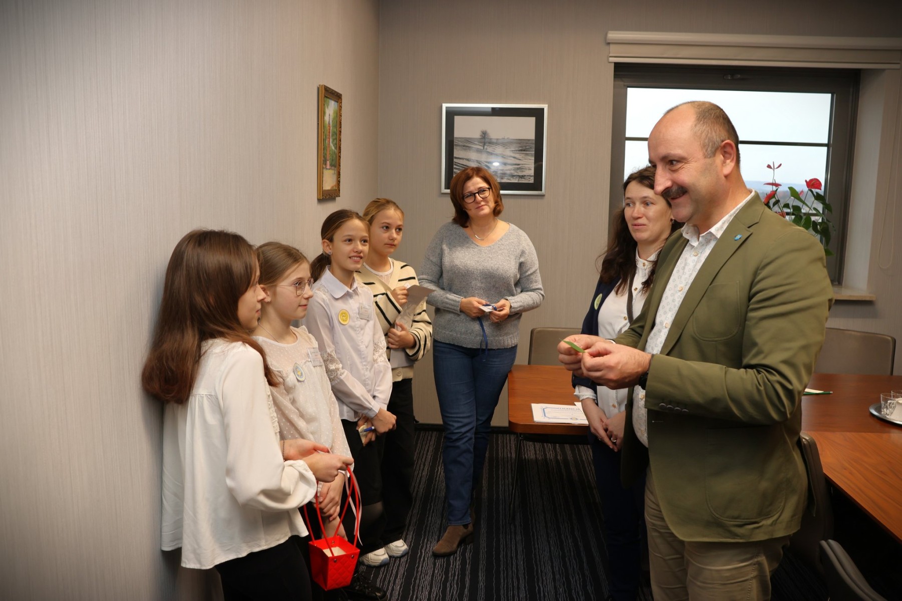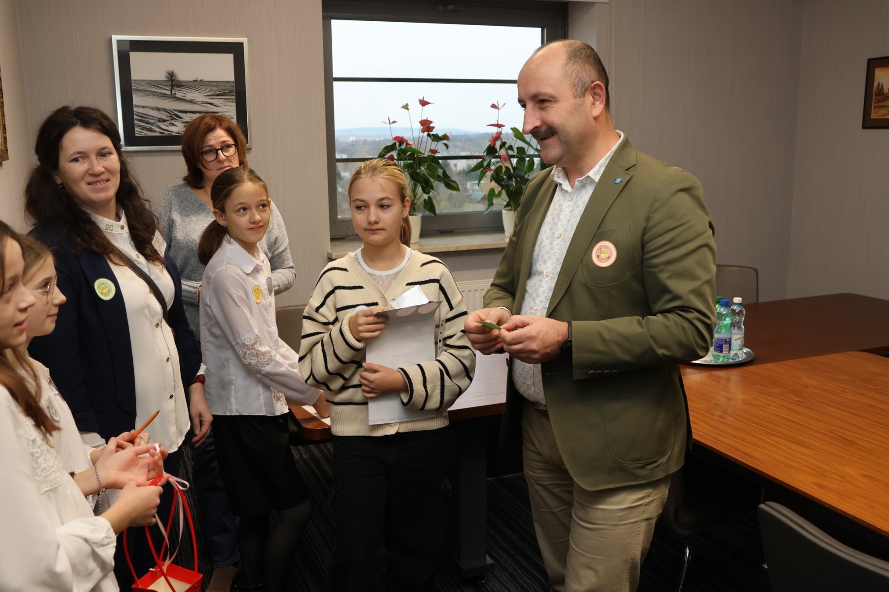Uczniowie klasy IV i V Szkoły Podstawowej nr 8 im. Wojska Polskiego w Kielcach odwiedzili kieleckie starostwo i przepytali pracowników ze znajomości tabliczki mnożenia.