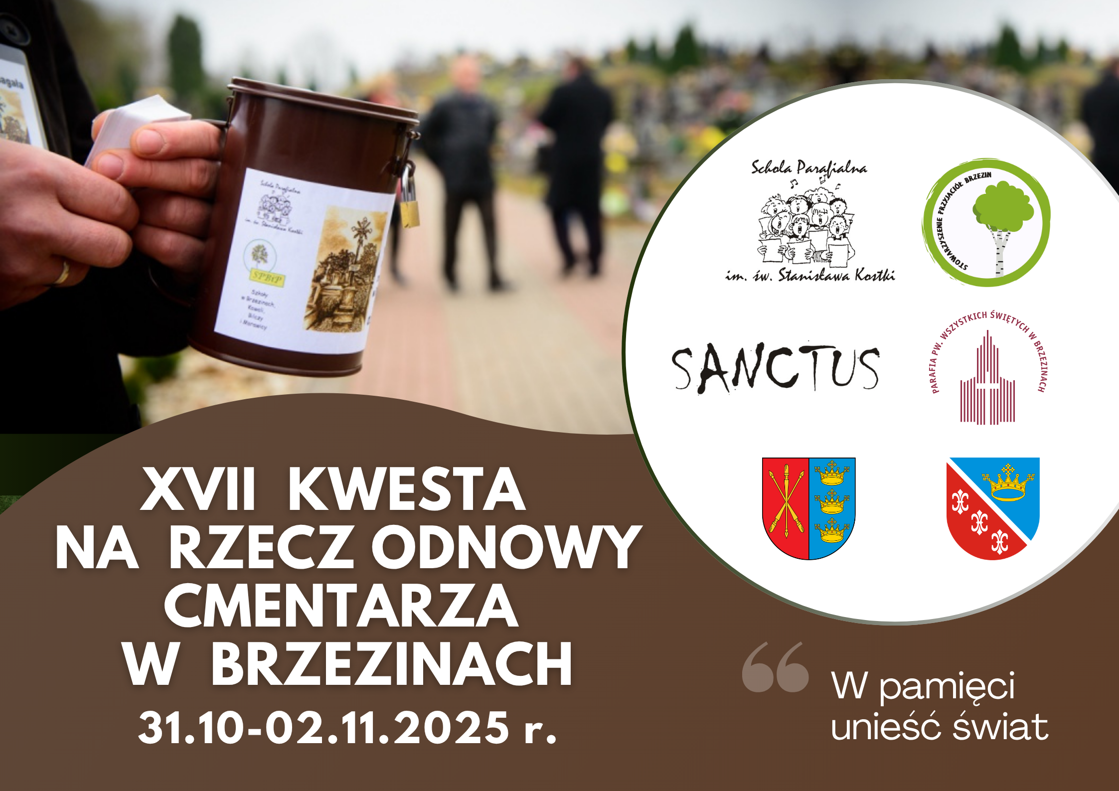 Kwesta w Brzezinach – W dniach 31.10-02.11.2025 r. odbędzie się XVII Kwesta na rzecz odnowy cmentarza w Brzezinach. Tradycyjnie przy wejściach na nekropolię odbędzie się zbiórka pieniędzy do puszek. Kwestującymi będą m.in. samorządowcy, społecznicy, strażacy, uczniowie. W sobotę na parkingu znicze-cegiełki będą rozprowadzać członkowie Scholi Parafialnej. Akcja odbędzie się w tym roku pod hasłem: „W pamięci unieść świat”.