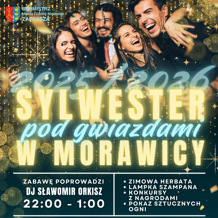 Razem powitajmy Nowy Rok w Morawicy! Sylwestrowa dyskoteka rozpocznie się o godz. 22:00 na placu przed Centrum Samorządowym i potrwa do 1:00. Do wspólnej zabawy zaprosi DJ, który zadba o największe muzyczne hity i gorącą atmosferę do tańca. Na uczestników czekać będzie pyszna zimowa herbatka, konkursy z nagrodami, lampka szampana oraz mnóstwo pozytywnej energii. Całość zwieńczy efektowny pokaz sztucznych ogni, który rozświetli morawickie niebo – dobra zabawa gwarantowana! Zapraszamy do Morawicy.
