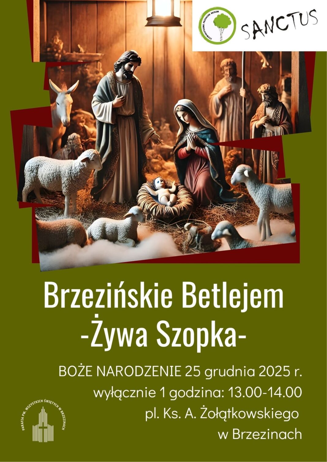 W I Dzień Bożego Narodzenia 25 grudnia 2025 r. WYŁĄCZNIE w godz. 13.00-14.00 odbędzie się kolejne kolędowanie w Brzezińskim Betlejem na pl. ks. Augusta Żołątkowskiego. W żywej szopce Świętą Rodzinę odwiedzą liczne zwierzęta, m.in. kucyk, alpaki, kozy, owce, króliki, kurki, gołębię. Przewidziano także zabawy i konkursy dla najmłodszych oraz mały poczęstunek dla wszystkich. Organizatorem wydarzenia jest Pismo Parafialne SANCTUS oraz Stowarzyszenie Przyjaciół Brzezin.