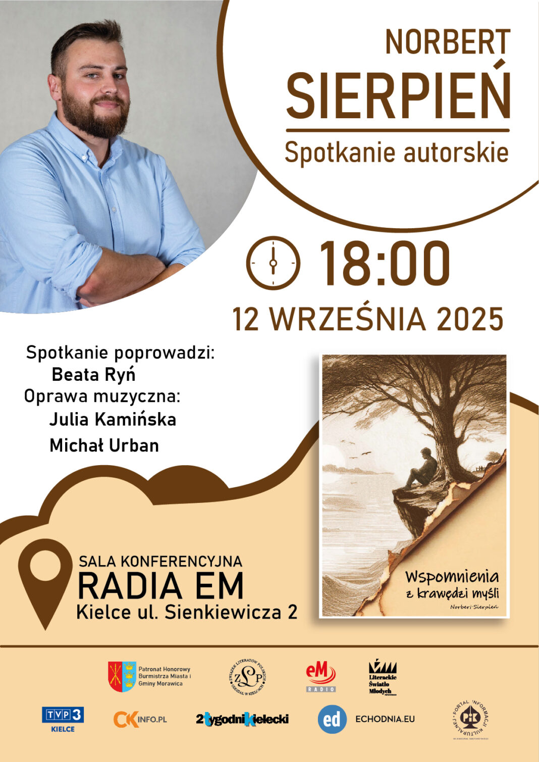 Już w piątek, 12 września 2025 roku, o godzinie 18:00, w siedzibie Radia eM Kielce przy ul. Sienkiewicza 2, odbędzie się wyjątkowe spotkanie z Norbertem Sierpniem, poetą z Radomic, autorem debiutanckiego tomu „Wspomnienia z krawędzi myśli”.