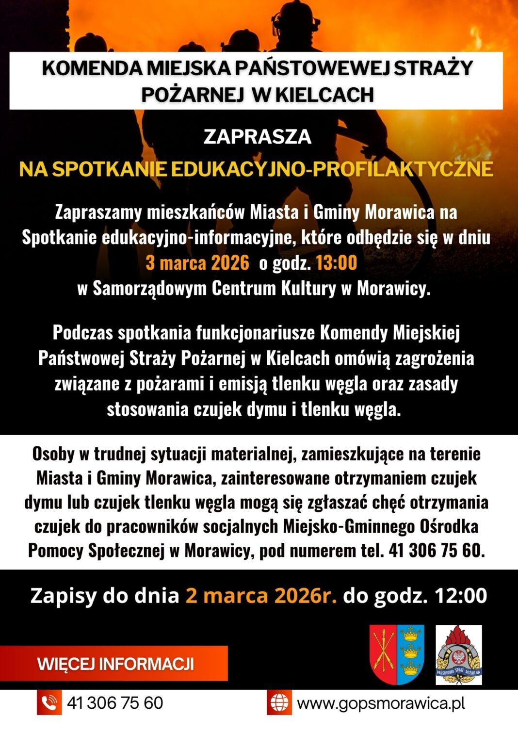Zapraszamy mieszkańców Miasta i Gminy Morawica na Spotkanie edukacyjno-informacyjne, które odbędzie się w dniu 3 marca 2026 o godz. 13:00 w Samorządowym Centrum Kultury w Morawicy. Podczas spotkania funkcjonariusze Komendy Miejskiej Państwowej Straży Pożarnej w Kielcach omówią zagrożenia związane z pożarami i emisją tlenku węgla oraz zasady stosowania czujek dymu i tlenku węgla.