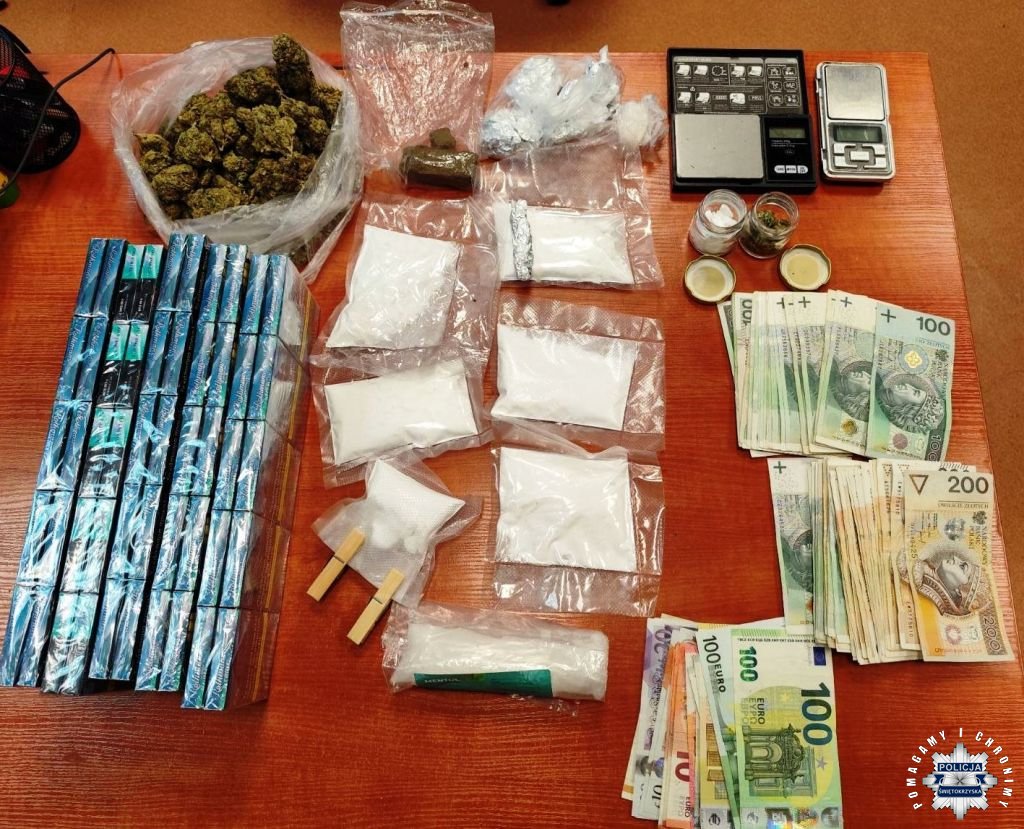 W trakcie realizacji wtorkowych czynności, na podstawie zgromadzonych informacji, funkcjonariusze przeprowadzili przeszukanie mieszkania zajmowanego przez kielczanina. W lokalu zajmowanym przez 44-latka policjanci zabezpieczyli 300 gramów kokainy, 120 gramów marihuany, 30 gramów haszyszu i 2 gramy 4CMC. Narkotyki były przechowywane w kilku miejscach w mieszkaniu, w tym w opakowaniach przygotowanych do dalszego porcjowania. Zabezpieczone środki zostaną poddane szczegółowym badaniom laboratoryjnym. Ponadto policjanci w mieszkaniu mężczyzny znaleźli 1000 sztuk papierosów bez polskich znaków akcyzy oraz ponad 2 kg krajanki tytoniowej. Dodatkowo zabezpieczona została gotówka w kwocie 8200 złotych, 465 euro, 120 funtów brytyjskich, której pochodzenie będzie analizowane.