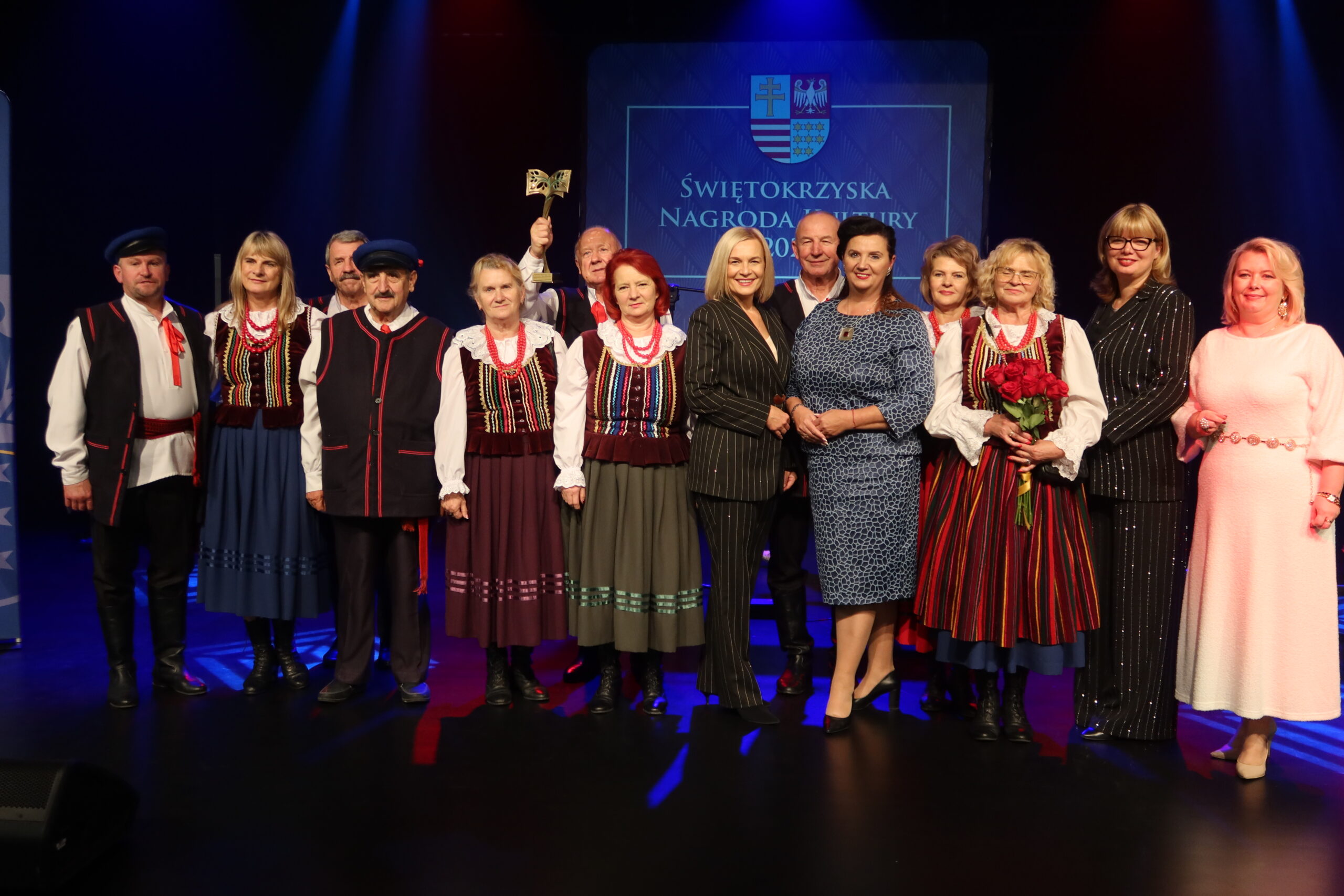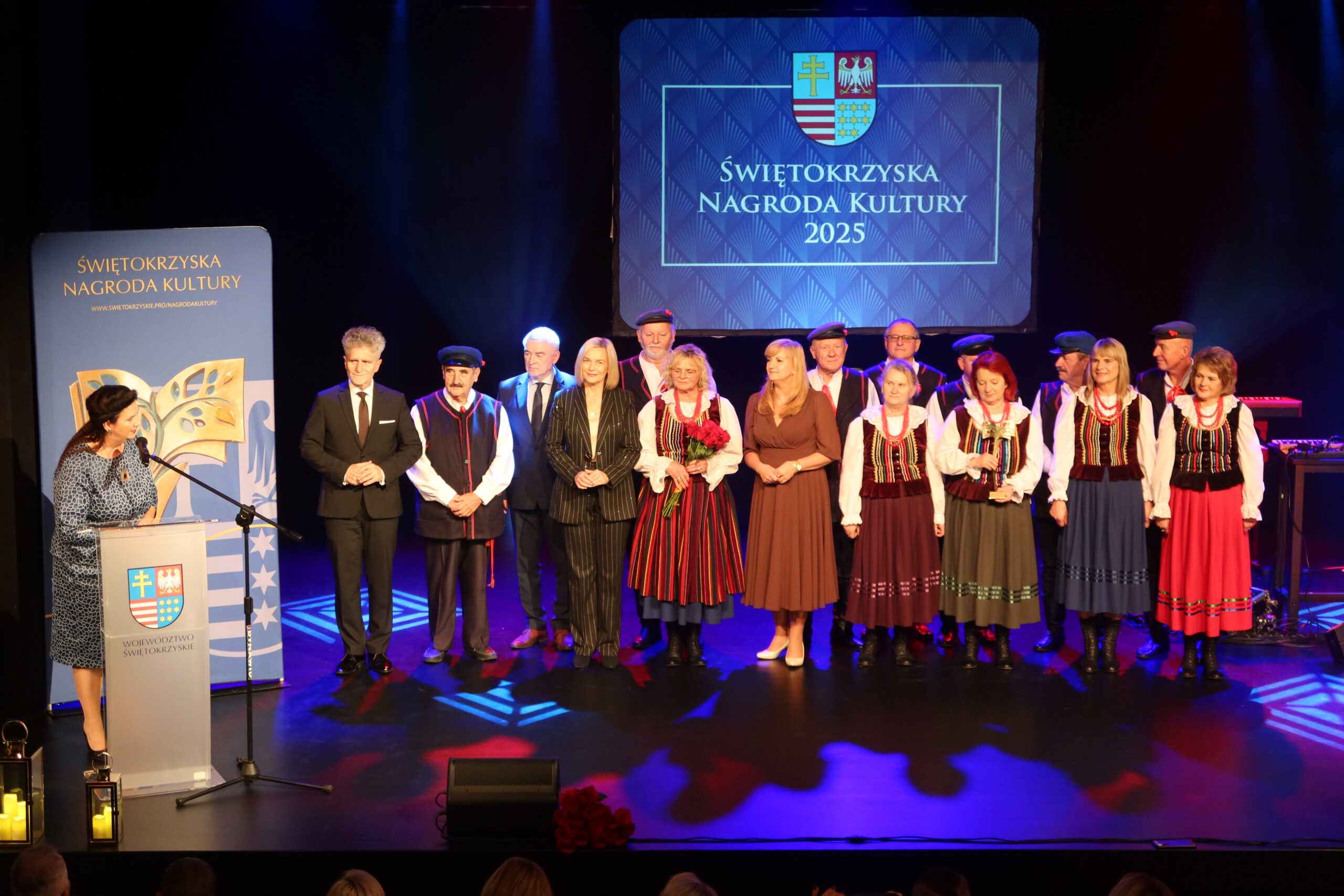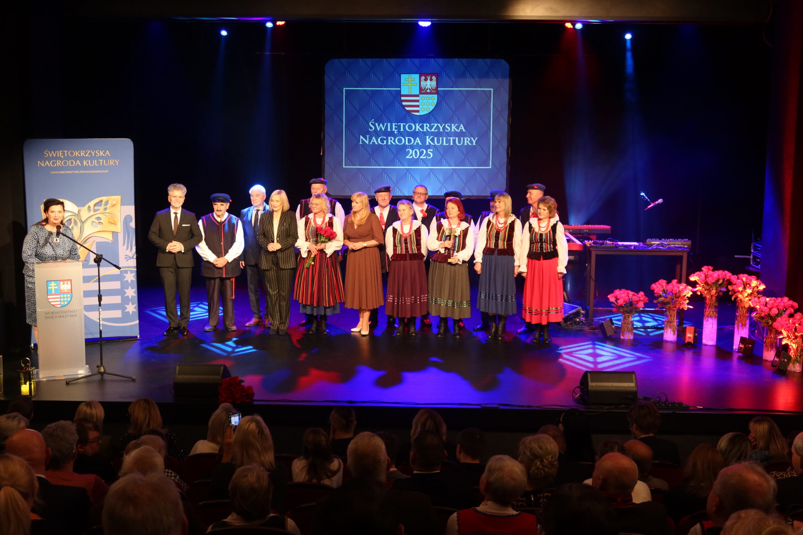 Tegoroczne Świętokrzyskie Nagrody Kultury wręczono podczas inauguracji roku kulturalnego i sezonu artystyczny 2025/2026. Podczas uroczystej gali, która odbyła się w Wojewódzkim Domu Kultury, marszałek województwa Renata Janik wraz z przewodniczącym Sejmiku Województwa Świętokrzyskiego Andrzejem Bętkowskim i członkiem Zarządu Anitą Koniusz, wręczyli nagrody wyróżnionym artystom i zespołom. Wśród nich znalazł się Zespół Pieśni i Tańca „Wierna Rzeka” z gminy Piekoszów, działający od czerwca 2005 roku. Grupa liczy dziś 20 osób, w tym sześcioosobową kapelę, i może poszczycić się licznymi sukcesami na szczeblu wojewódzkim i krajowym. Kierownikiem zespołu jest Teodora Krążek. – Zespół „Wierna Rzeka” to przykład autentycznego zaangażowania i pasji, która nie tylko utrwala, ale i ożywia nasze dziedzictwo kulturalne. Dziękuję wszystkim członkom zespołu za podtrzymywanie tradycji ludowych i piękną promocję naszego regionu. Podziękowania kieruję też do burmistrz Teresy Jakubowskiej za zgłoszenie „Wiernej Rzeki” do Świętokrzyskiej Nagrody Kultury oraz za nieustanne wspieranie talentów ze swojej gminy – powiedziała marszałek Renata Janik podczas uroczystości. Laureatom gratulował także senator Krzysztof Słoń, radna Sejmiku Małgorzata Krzywda oraz dyrektor Wojewódzkiego Domu Kultury w Kielcach Magdalena Fogiel-Litwinek.