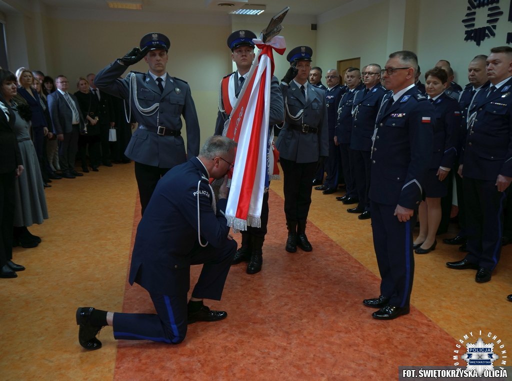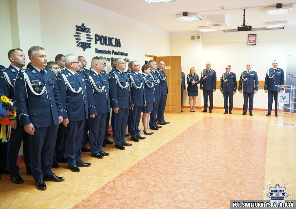 Uroczystość zakończyła się odprowadzeniem sztandaru Komendy Powiatowej Policji w Ostrowcu Świętokrzyskim oraz złożeniem meldunku Pierwszemu Zastępcy Komendanta Wojewódzkiego Policji w Kielcach.