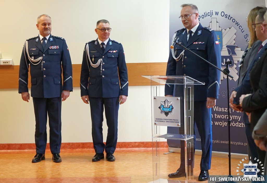 Jako pierwszy zabrał głos Pierwszy Zastępca Komendanta Wojewódzkiego Policji w Kielcach insp. Tomasz Jarosz. W swoim wystąpieniu zwrócił uwagę na profesjonalizm komendantów, a także wysoki poziom dotychczas realizowanych przez nich obowiązków. Kolejno podziękował mł. insp. Wojciechowi Szymczakowi za wieloletnią i pełną poświęceń służbę, wskazując, że odchodząc na emeryturę stoją przed nim kolejne możliwości i perspektywy.