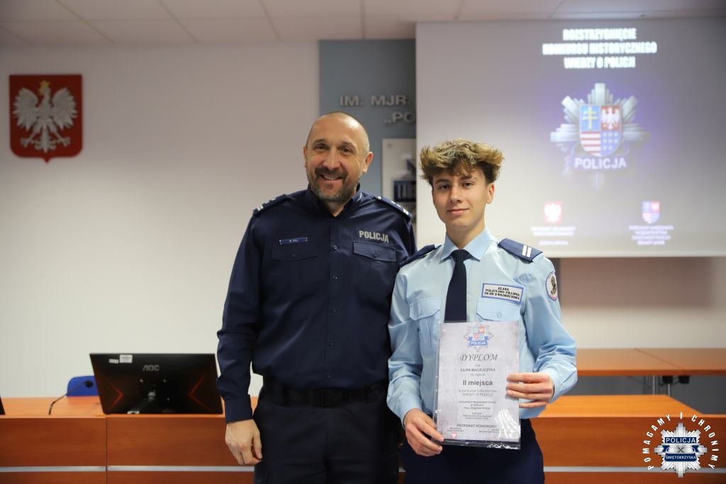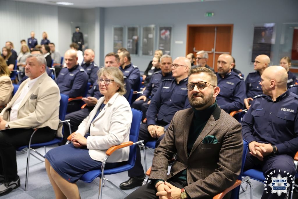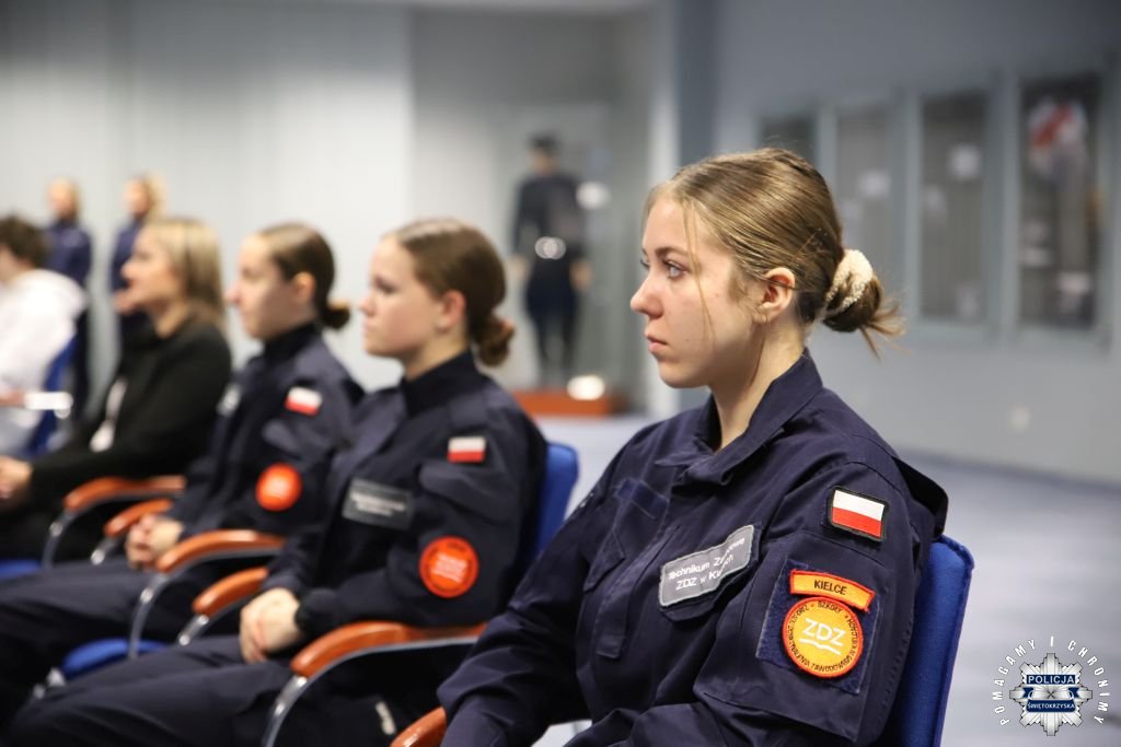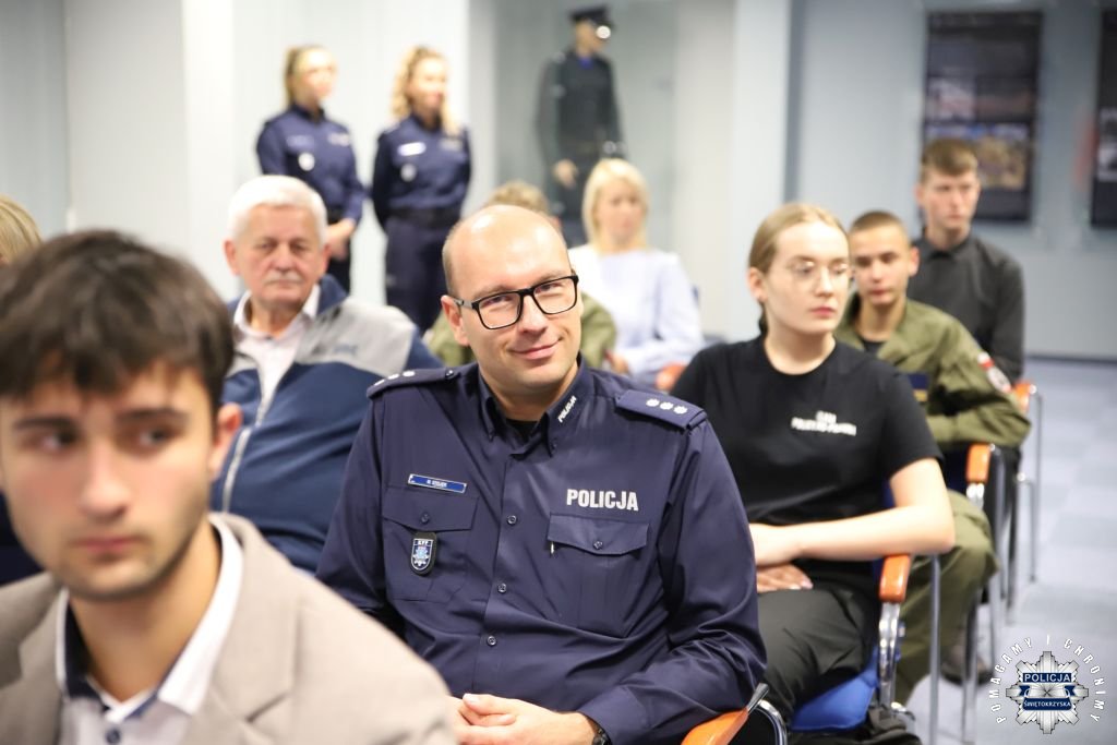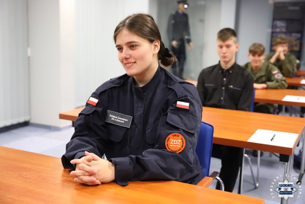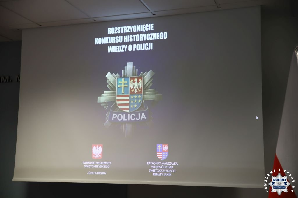 Dziś, na tej samej sali zebrali się wyróżnieni uczestnicy konkursu, przedstawiciele szkół, urzędów oraz świętokrzyskiej Policji aby podsumować rywalizację. Była to także okazja, by wspólnie uczcić tradycję formacji, która od 106 lat stoi na straży bezpieczeństwa i porządku publicznego. Podczas uroczystości obecni mogli wysłuchać wykładu o początkach obecności kobiet w Policji – w tym roku przypada setna rocznica tego pięknego jubileuszu. Tą wiedzą wykazali się najlepsi uczestnicy konkursu, wśród których znajdowali się policjanci i uczniowie.