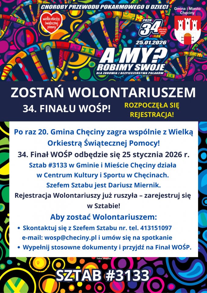 Po raz 20. Gmina i Miasto Chęciny zagra wspólnie z Wielką Orkiestrą Świątecznej Pomocy! 34. Finał WOŚP odbędzie się 25 stycznia 2026 r. Tematem zbiórki przyszłorocznego Finału WOŚP będzie leczenie chorób przewodu pokarmowego u dzieci. Akcji przyświeca hasło „Zdrowe brzuszki naszych dzieci”.