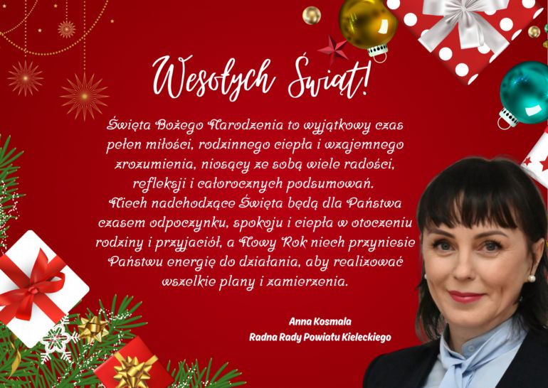 Strona głównaAktualnościŻyczenia Świąteczne Radnej Rady Powiatu Kieleckiego Anny Kosmali Aktualności Życzenia Świąteczne Radnej Rady Powiatu Kieleckiego Anny Kosmali CKinfo.pl 23 grudnia 2025 FacebookTwitterWhatsAppTelegram Zobacz CKinfo.pl - 19 grudnia 2025,,Cicha noc – święta noc˝ – Jasełka Bożonarodzeniowe w Szkole Podstawowej w Obicach CKinfo.pl - 18 grudnia 2025Nietrzeźwy sprawcą kolizji drogowej CKinfo.pl - 22 grudnia 2025Bez wahania ruszył na pomoc CKinfo.pl - 19 grudnia 2025Ponad 15 mln zł wsparcia na dwa projekty realizowane w Morawicy i Starachowicach CKinfo.pl - 19 grudnia 2025Wystawa czasowa “Na szkle malowane. Cuda z Podhala” Agnieszka Olech - 21 grudnia 2025Sezon pełen sukcesów. KTM Novi Kielce podsumował rok i podziękował tym, którzy tworzą siłę klubu [WIDEO] Agnieszka Olech - 21 grudnia 2025Kościół w Jaworzni rośnie w oczach. To będzie jedyna taka świątynia pod wezwaniem Świętej Marty w Polsce GminaGmina DaleszyceŹRÓDŁOMiasto i Gmina Daleszycze Udział FacebookTwitterWhatsAppTelegram Poprzedni artykułŻyczenia Świąteczne Burmistrza Miasta i Gminy Daleszyce Dariusza MeresińskiegoNastępny artykułŻyczenia Świąteczne Marszałka Województwa Świętokrzyskiego i Przewodniczącego Sejmiku Aktualności AktualnościAgnieszka Olech - 24 grudnia 2025Życzenia Bożonarodzeniowe od Marszałek Województwa Świętokrzyskiego Renaty Janik Aktualności Wojewoda Świętokrzyski Józef Bryk składa świąteczne życzenia Agnieszka Olech - 24 grudnia 2025 Aktualności Życzenia Bożonarodzeniowe od starosty Powiatu Kieleckiego Tomasza Plebana Agnieszka Olech - 24 grudnia 2025 00:01:27 Aktualności Życzenia Bożonarodzeniowe od burmistrz miasta i gminy Piekoszów Teresy Jakubowskiej [WIDEO] Agnieszka Olech - 24 grudnia 2025 Aktualności Wicestarosta Tomasz Dulny składa życzenia z okazji Świąt Bożego Narodzenia Agnieszka Olech - 24 grudnia 2025 Polecamy Życzenia Bożonarodzeniowe od Marszałek Województwa Świętokrzyskiego Renaty Janik Aktualności Agnieszka Olech - 24 grudnia 2025 Wojewoda Świętokrzyski Józef Bryk składa świąteczne życzenia Aktualności Agnieszka Olech - 24 grudnia 2025 Życzenia Bożonarodzeniowe od starosty Powiatu Kieleckiego Tomasza Plebana Aktualności Agnieszka Olech - 24 grudnia 2025 00:01:27 Życzenia Bożonarodzeniowe od burmistrz miasta i gminy Piekoszów Teresy Jakubowskiej [WIDEO] Aktualności Agnieszka Olech - 24 grudnia 2025
