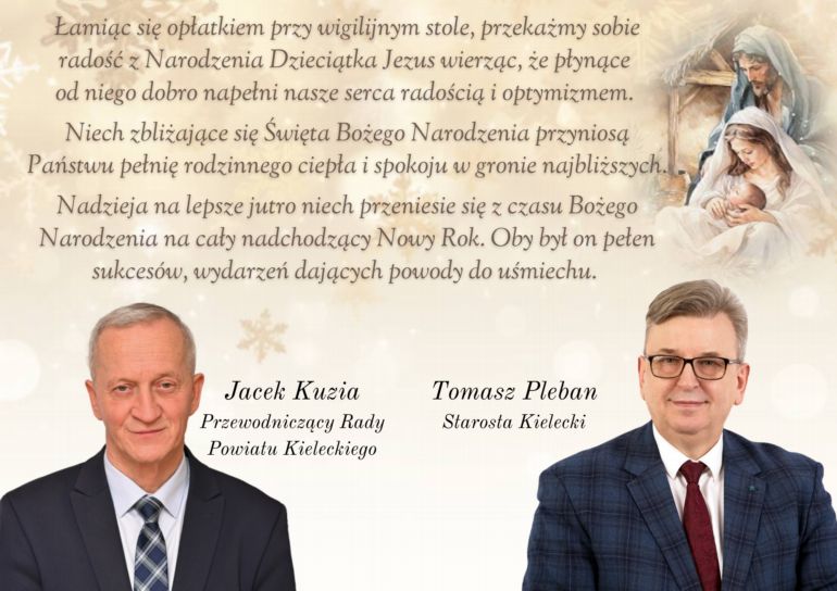 Strona głównaAktualnościŻyczenia Świąteczne Starosty Kieleckiego i Przewodniczącego Rady Powiatu Aktualności Życzenia Świąteczne Starosty Kieleckiego i Przewodniczącego Rady Powiatu CKinfo.pl 23 grudnia 2025 FacebookTwitterWhatsAppTelegram Zobacz CKinfo.pl - 18 grudnia 2025Znajomy, który okazał się być wilkiem w owczej skórze CKinfo.pl - 18 grudnia 2025SP im. ks. Piotra Ściegiennego w Bilczy zaprasza na WIDOWISKO HISTORYCZNE – W CZASIE I PRZESTRZENI Agnieszka Olech - 24 grudnia 2025Życzenia z okazji Świąt Bożego Narodzenia od wójta gminy Mniów Piotra Wilczaka CKinfo.pl - 18 grudnia 2025GKS Koral Cuba Morawica i LZS Bocian Koral Bilcza na podium Finału XVIII Świętokrzyskiej Ligi LZS CKinfo.pl - 23 grudnia 2025Spotkanie opłatkowe w Świętokrzyskim Urzędzie Wojewódzkim w Kielcach CKinfo.pl - 18 grudnia 2025Relacja fotograficzna z przedstawienia jasełkowego w wykonaniu uczniów ze Szkoły Podstawowej z oddziałami dwujęzycznymi im. Gen. Stanisława Skalskiego w Polichnie CKinfo.pl - 19 grudnia 2025Uroczyste odsłonięcie kompozycji rzeźb pionierów badań nad starożytnym hutnictwem świętokrzyskim w Nowej Słupi GminaGmina DaleszyceŹRÓDŁOMiasto i Gmina Daleszycze Udział FacebookTwitterWhatsAppTelegram Poprzedni artykułInformacja o wyniku przetargu na sprzedaż nieruchomości gruntowej położonej w Dębskiej WoliNastępny artykułInformacja o kurowaniu busów w okresie świątecznym Aktualności AktualnościAgnieszka Olech - 24 grudnia 2025Życzenia Bożonarodzeniowe od Marszałek Województwa Świętokrzyskiego Renaty Janik Aktualności Wojewoda Świętokrzyski Józef Bryk składa świąteczne życzenia Agnieszka Olech - 24 grudnia 2025 Aktualności Życzenia Bożonarodzeniowe od starosty Powiatu Kieleckiego Tomasza Plebana Agnieszka Olech - 24 grudnia 2025 00:01:27 Aktualności Życzenia Bożonarodzeniowe od burmistrz miasta i gminy Piekoszów Teresy Jakubowskiej [WIDEO] Agnieszka Olech - 24 grudnia 2025 Aktualności Wicestarosta Tomasz Dulny składa życzenia z okazji Świąt Bożego Narodzenia Agnieszka Olech - 24 grudnia 2025 Polecamy Życzenia Bożonarodzeniowe od Marszałek Województwa Świętokrzyskiego Renaty Janik Aktualności Agnieszka Olech - 24 grudnia 2025 Wojewoda Świętokrzyski Józef Bryk składa świąteczne życzenia Aktualności Agnieszka Olech - 24 grudnia 2025 Życzenia Bożonarodzeniowe od starosty Powiatu Kieleckiego Tomasza Plebana Aktualności Agnieszka Olech - 24 grudnia 2025 00:01:27 Życzenia Bożonarodzeniowe od burmistrz miasta i gminy Piekoszów Teresy Jakubowskiej [WIDEO] Aktualności Agnieszka Olech - 24 grudnia 2025